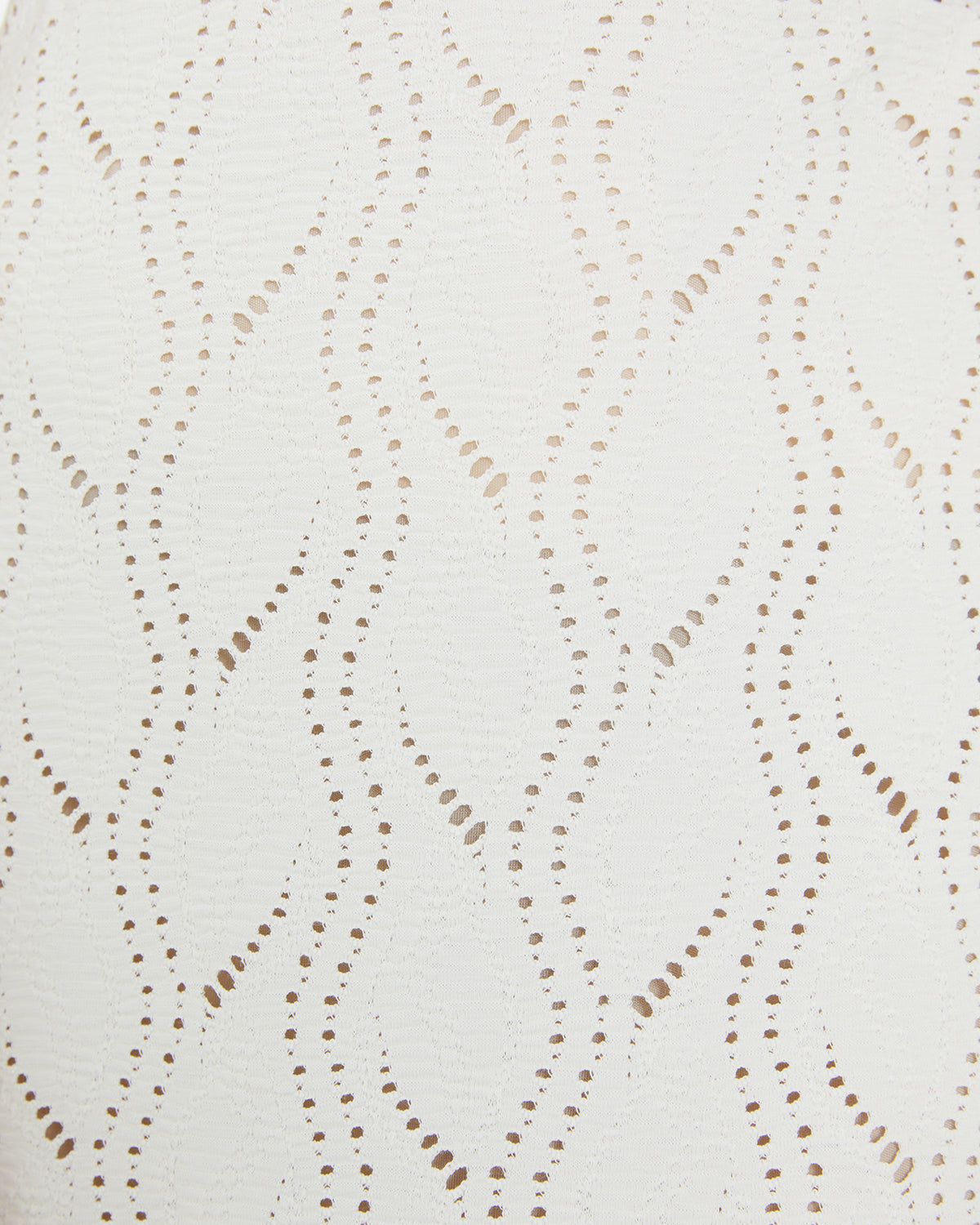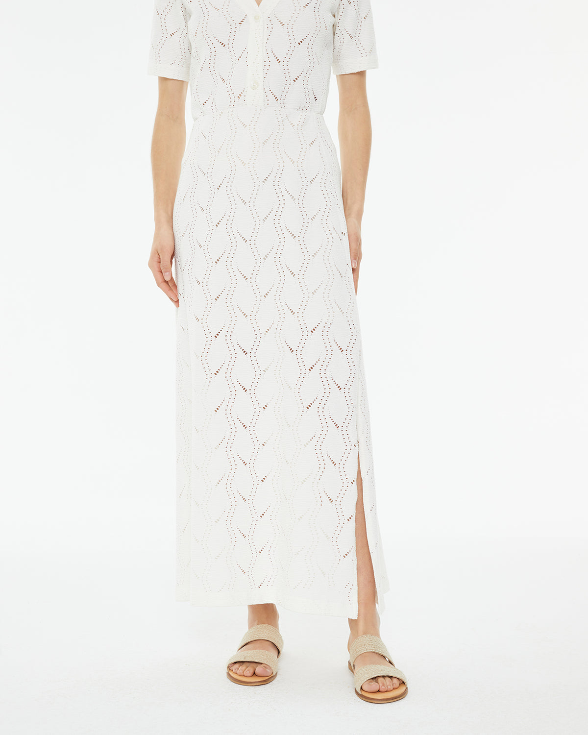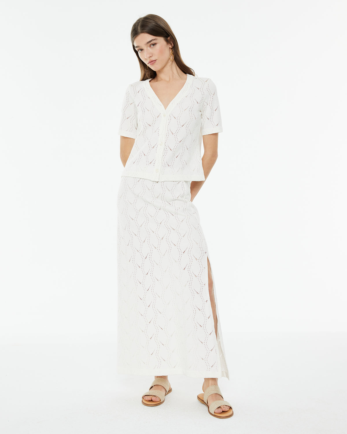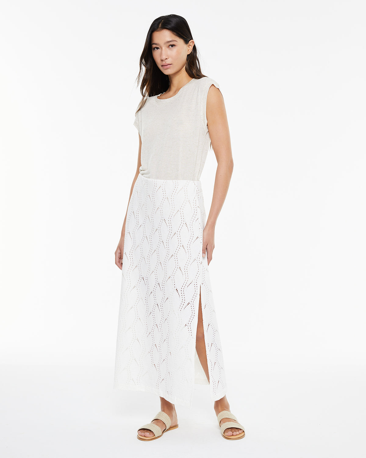 Falda de mujer midi calada, con goma en la cintura y detalle de abertura en costura lateral. Prenda sostenible.