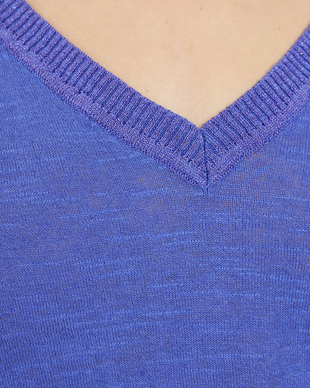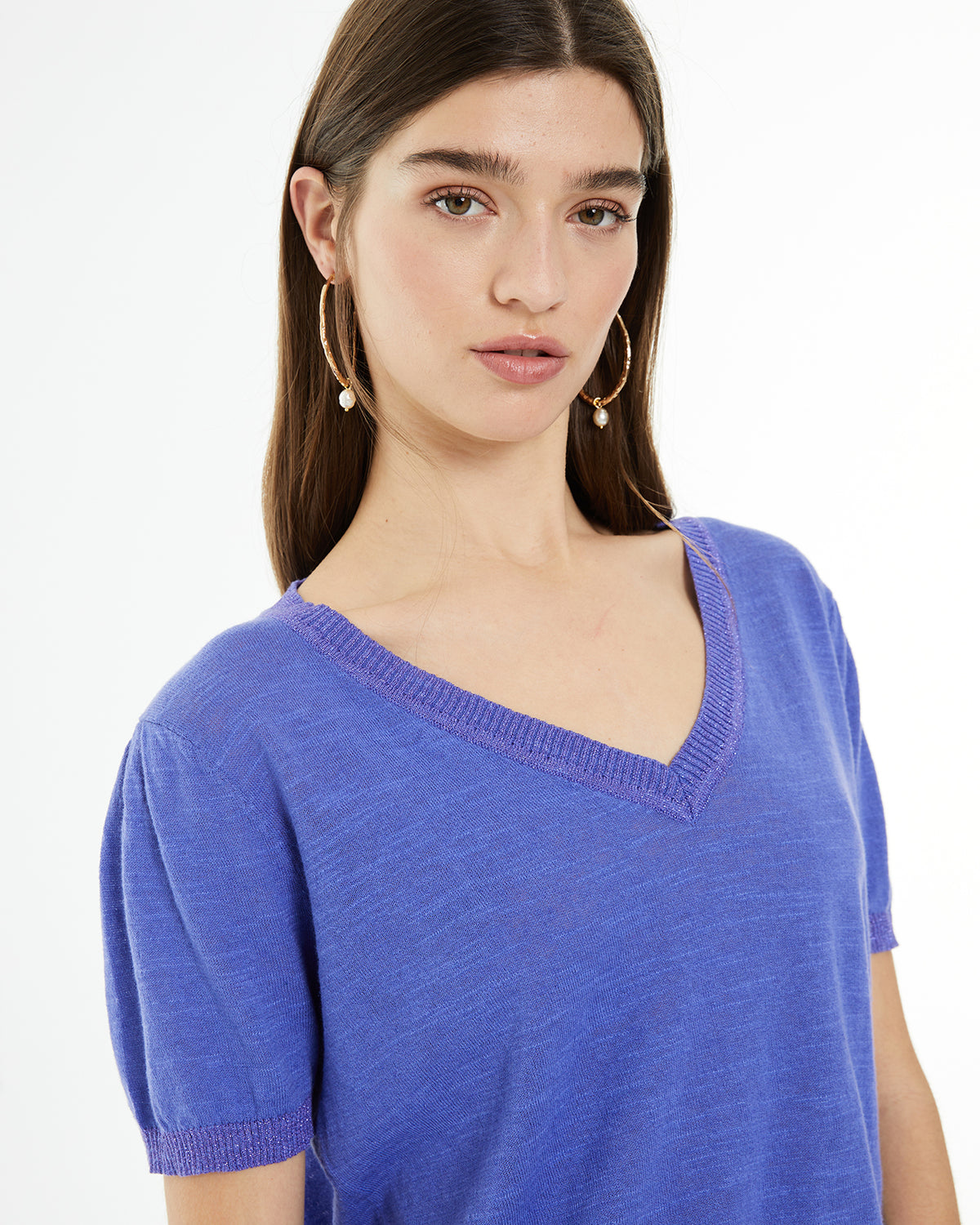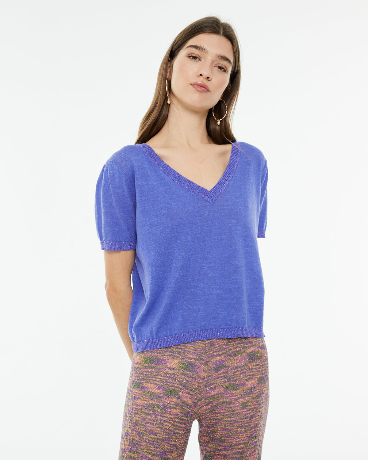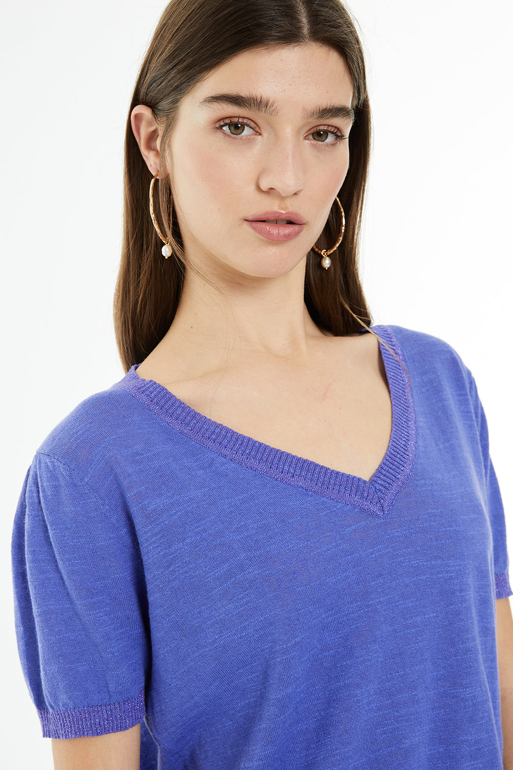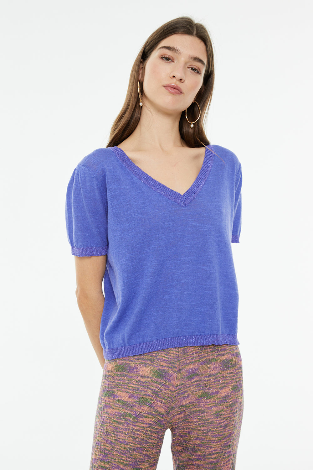 Jersey de mujer, cuello pico de manga corta. Detalle de tira en el escote. Acabados en rib.