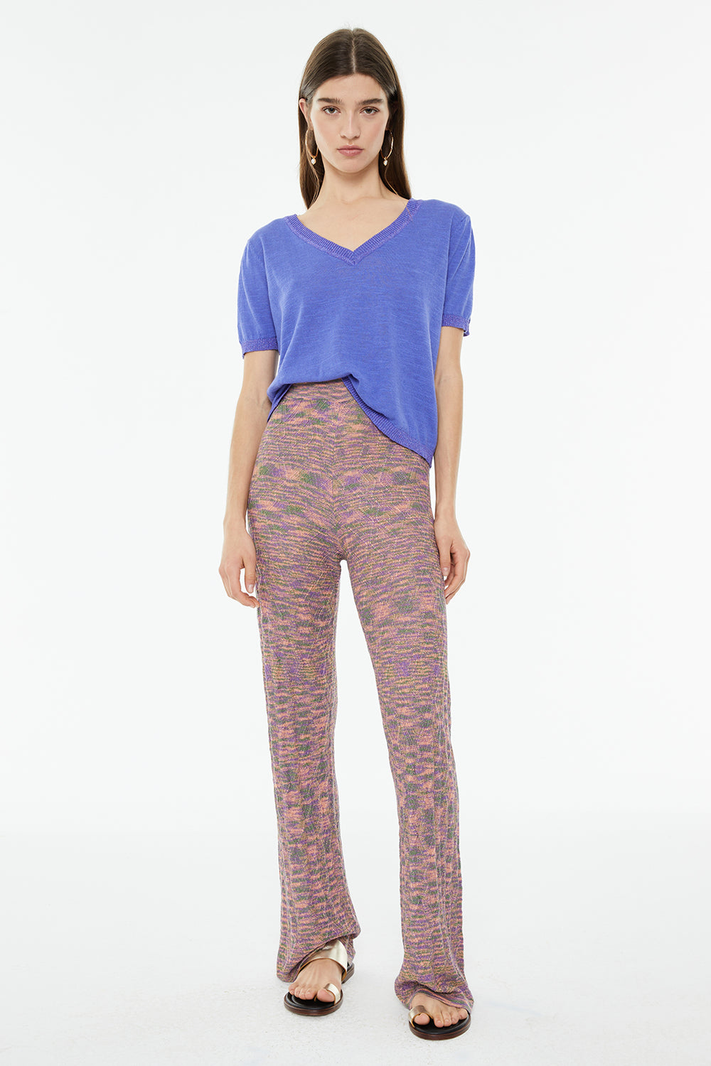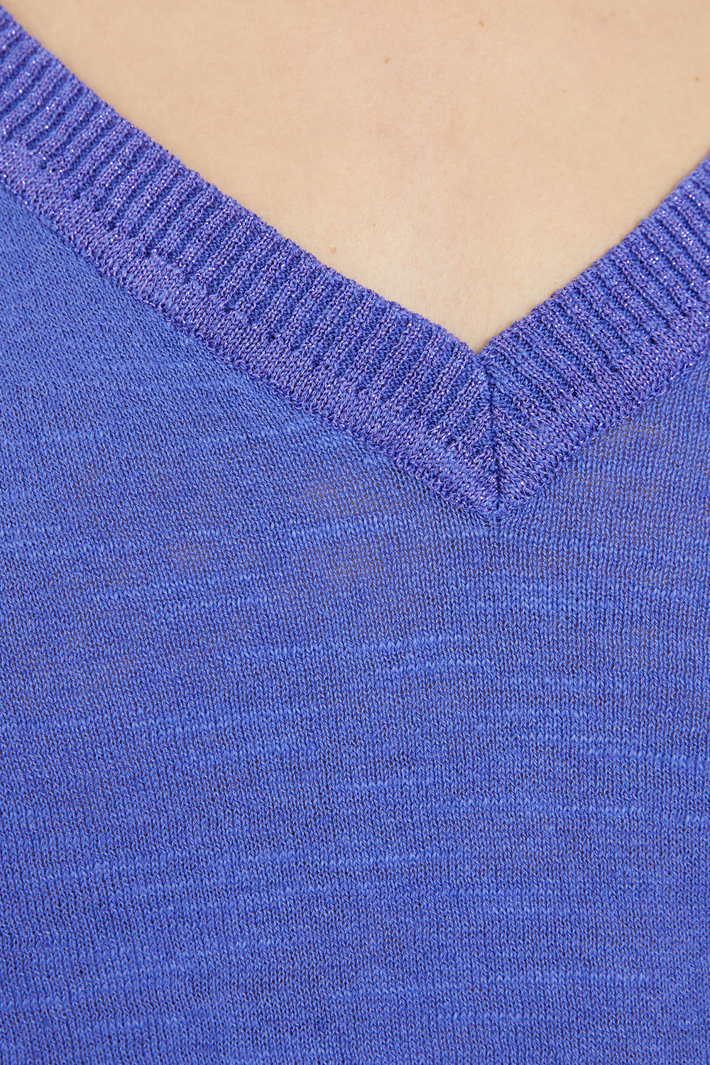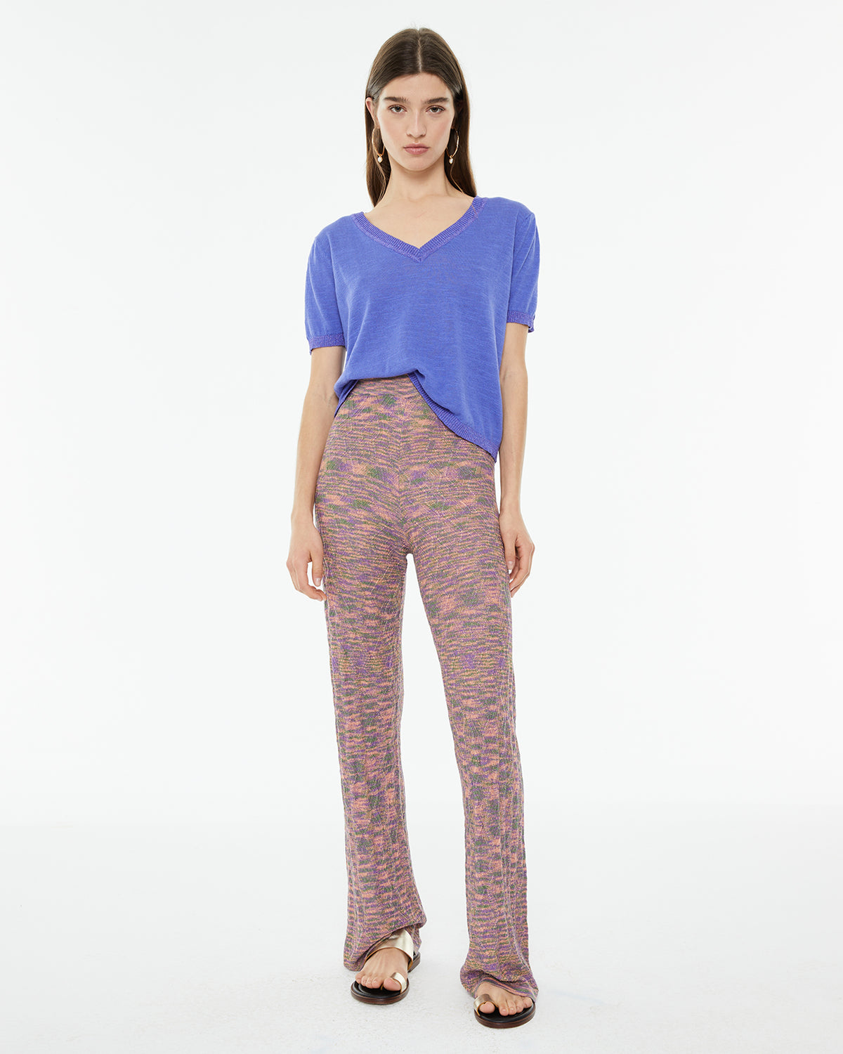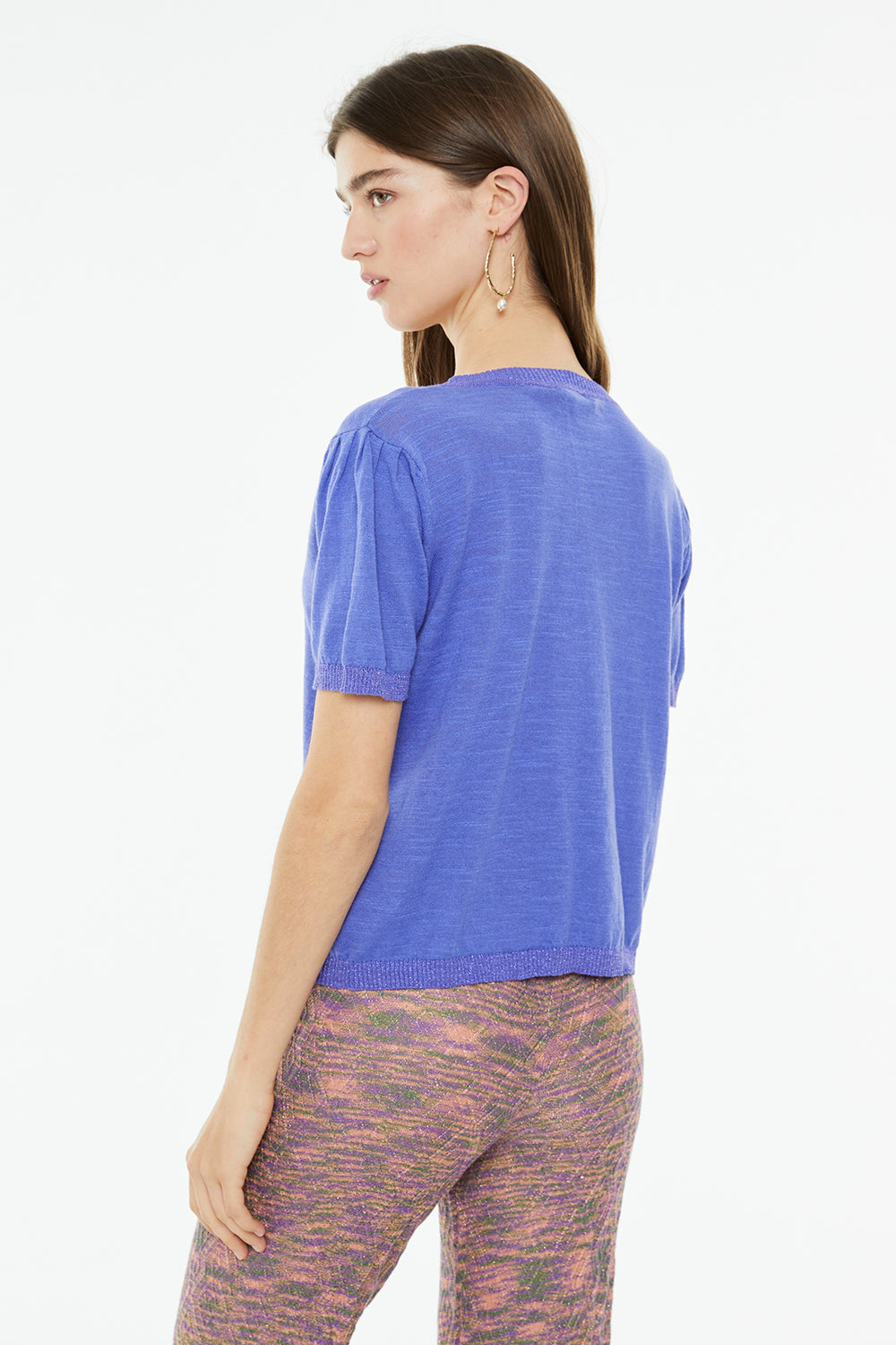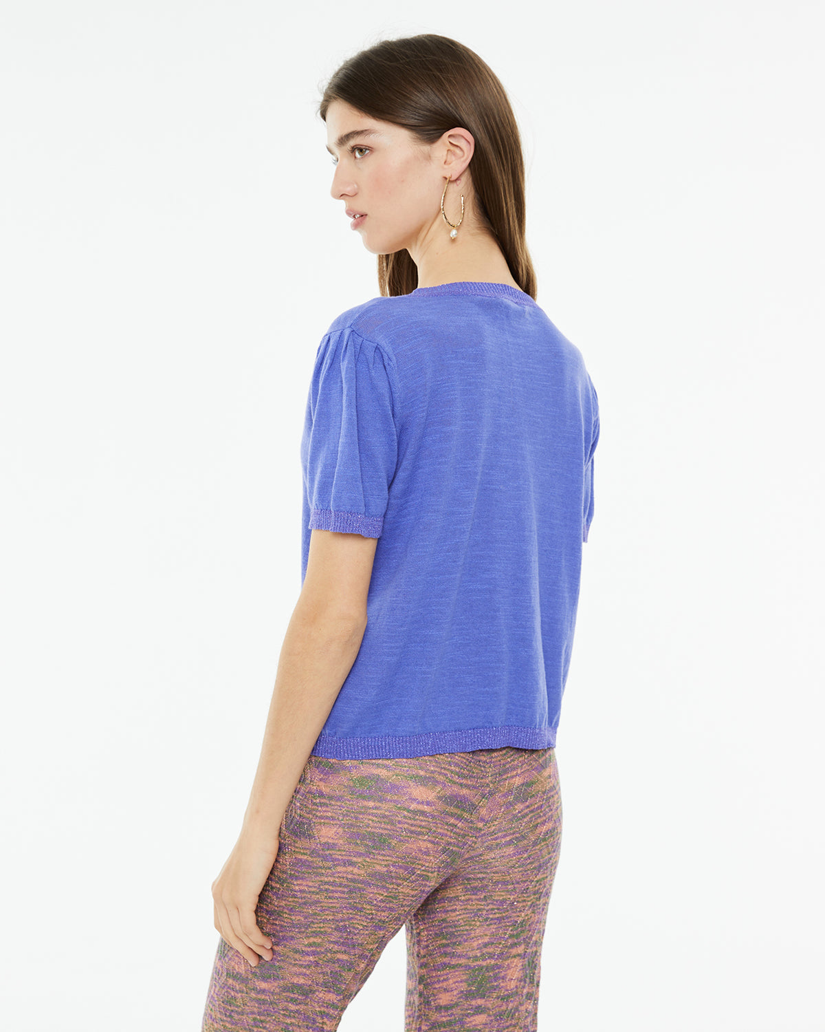 Jersey de mujer, cuello pico de manga corta. Detalle de tira en el escote. Acabados en rib.