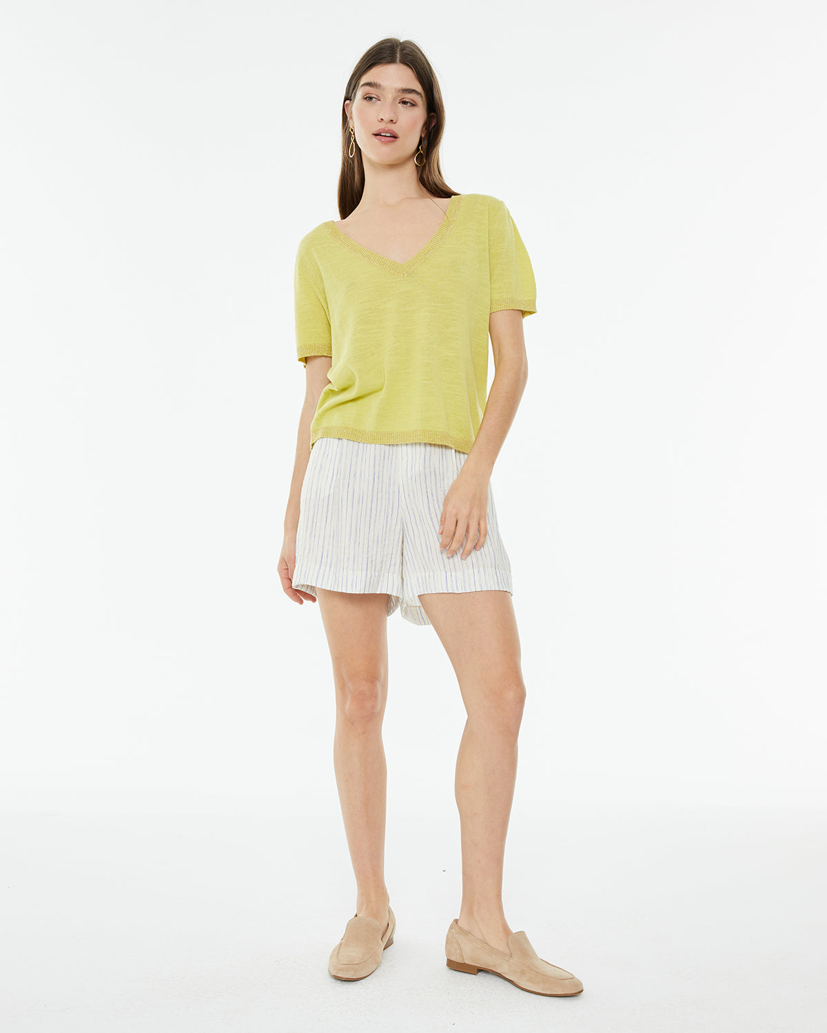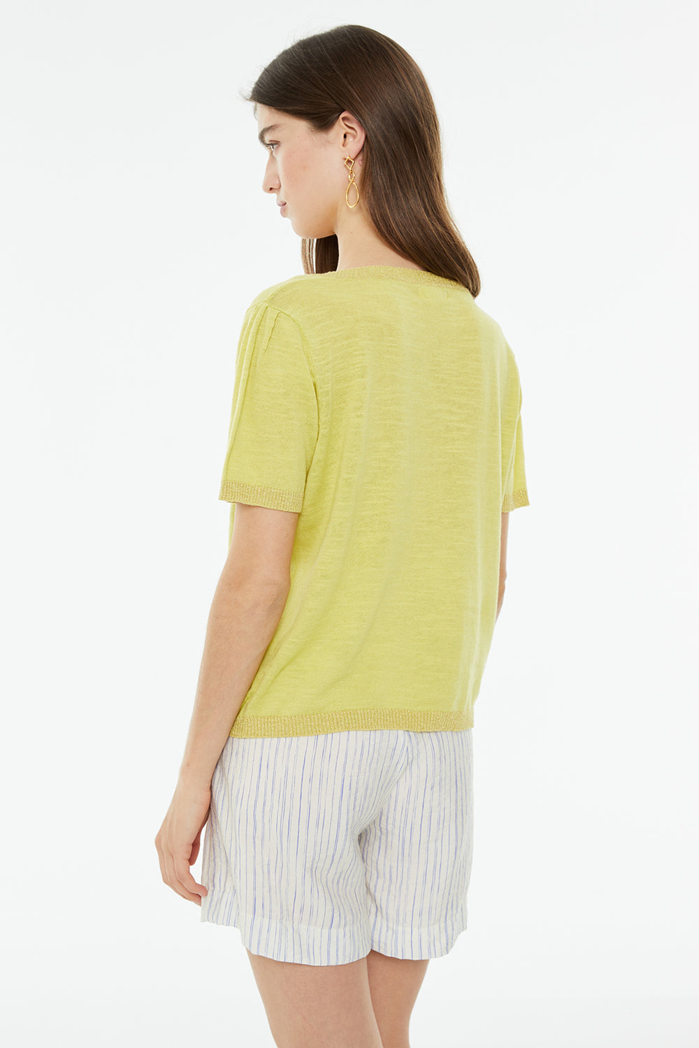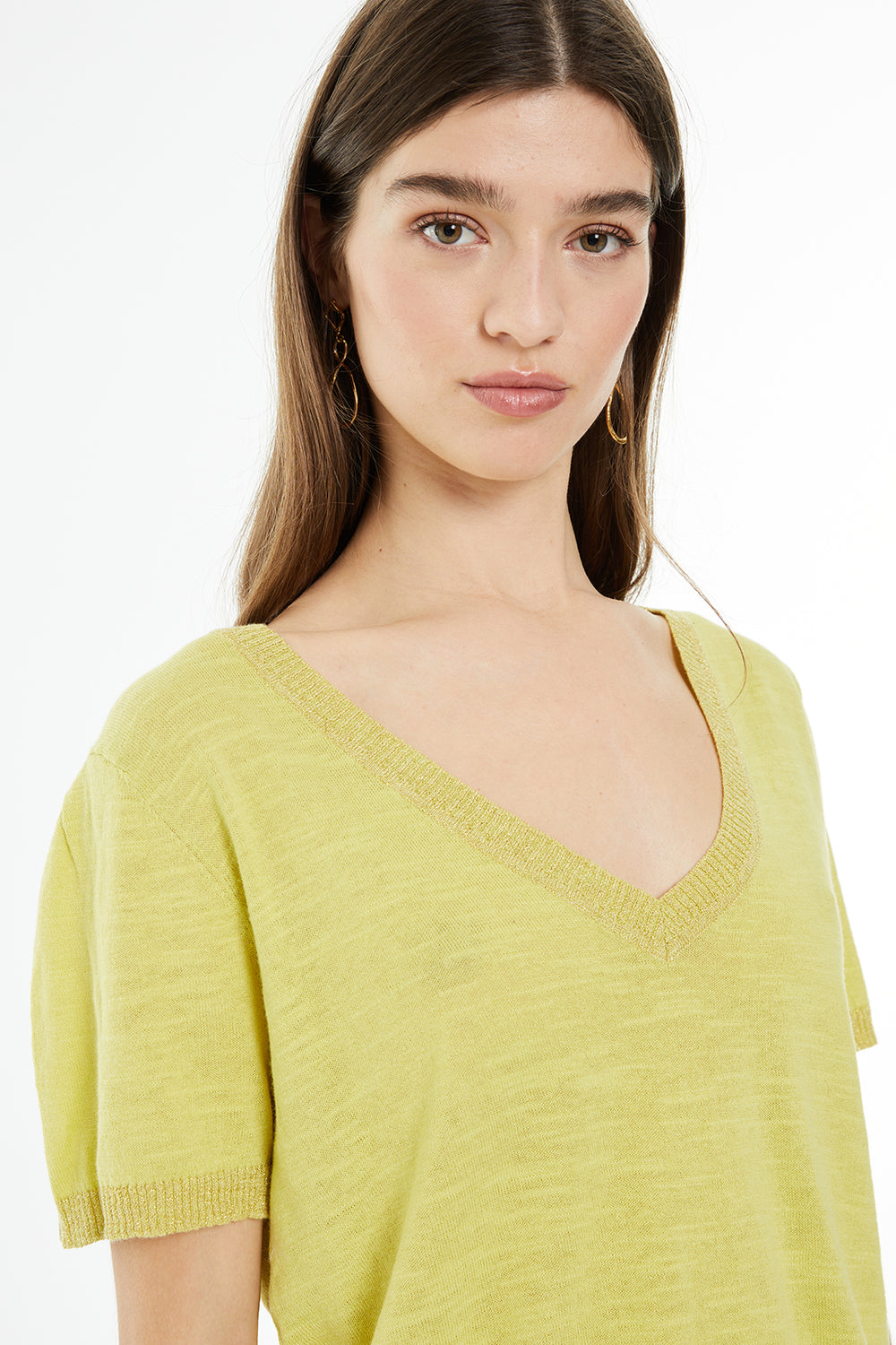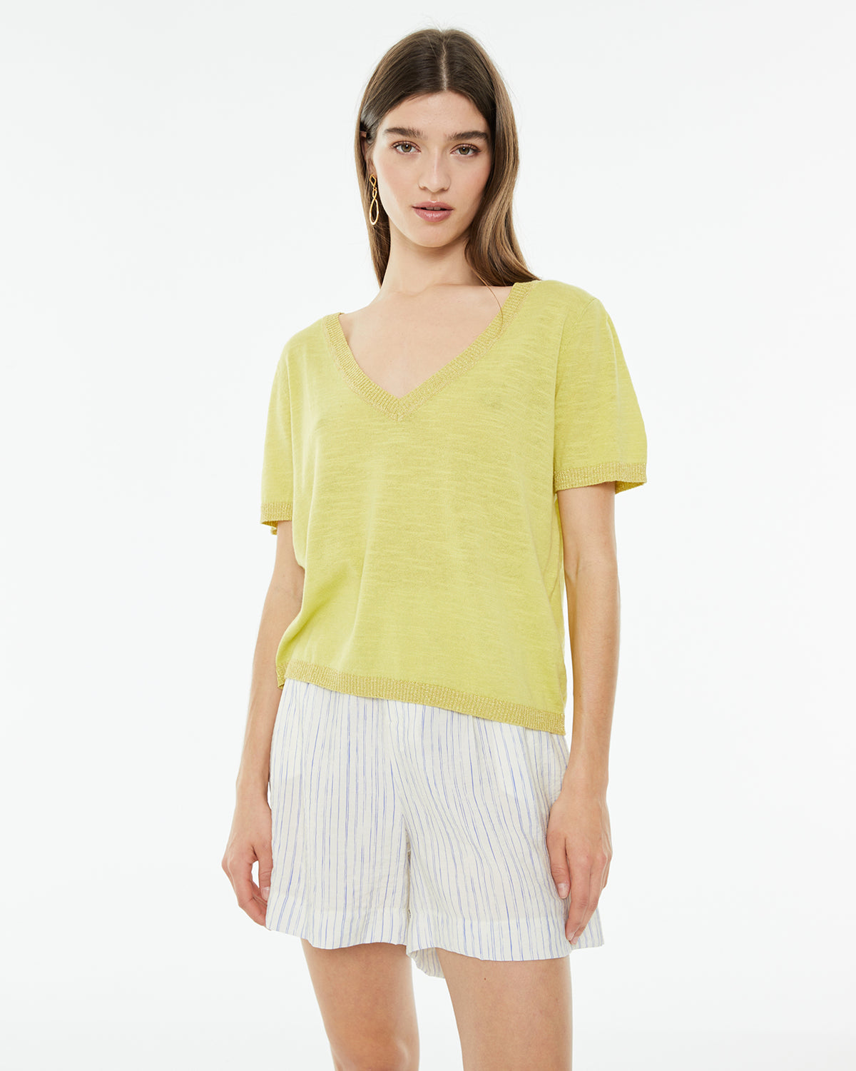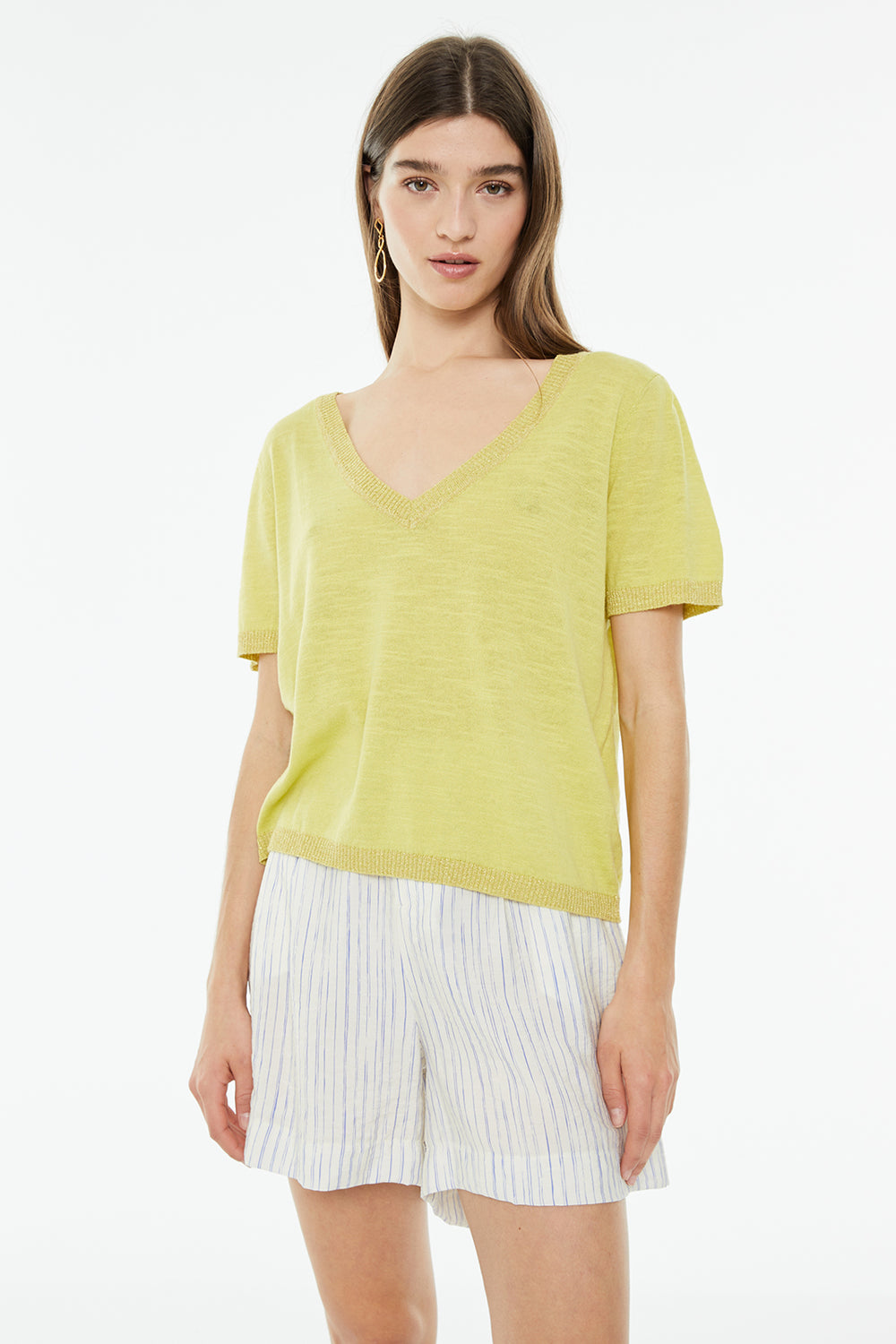 Jersey de mujer, cuello pico de manga corta. Detalle de tira en el escote. Acabados en rib.