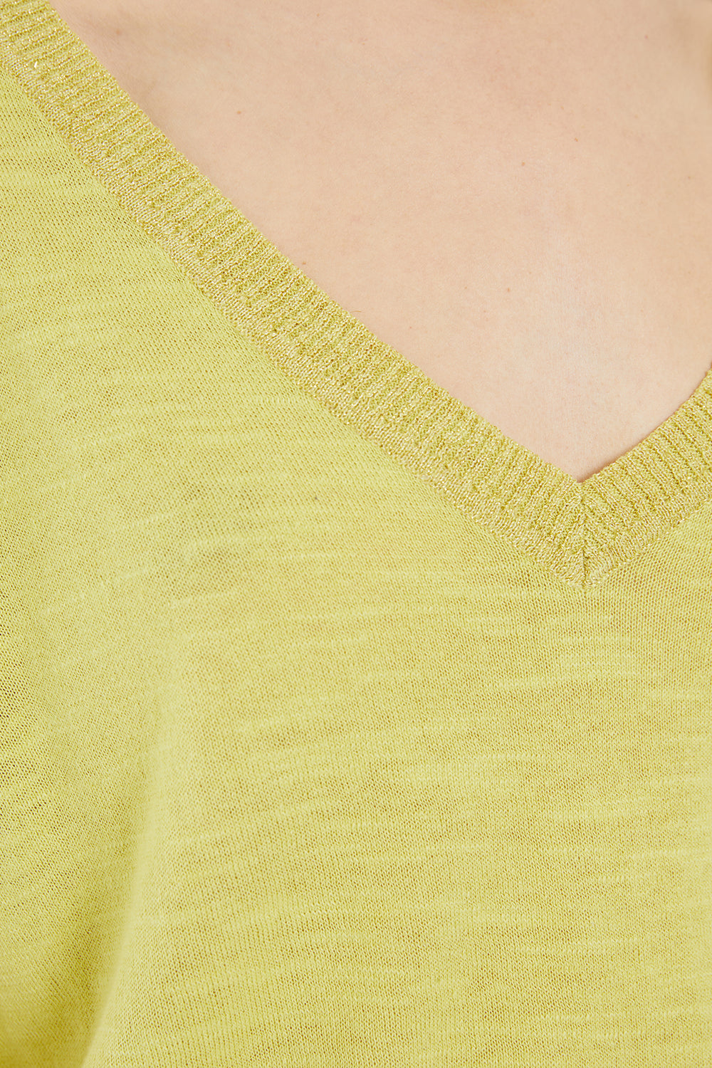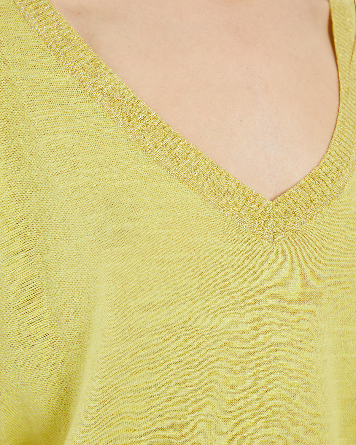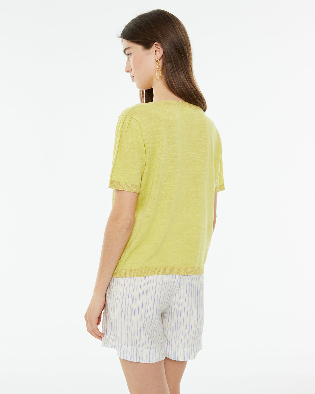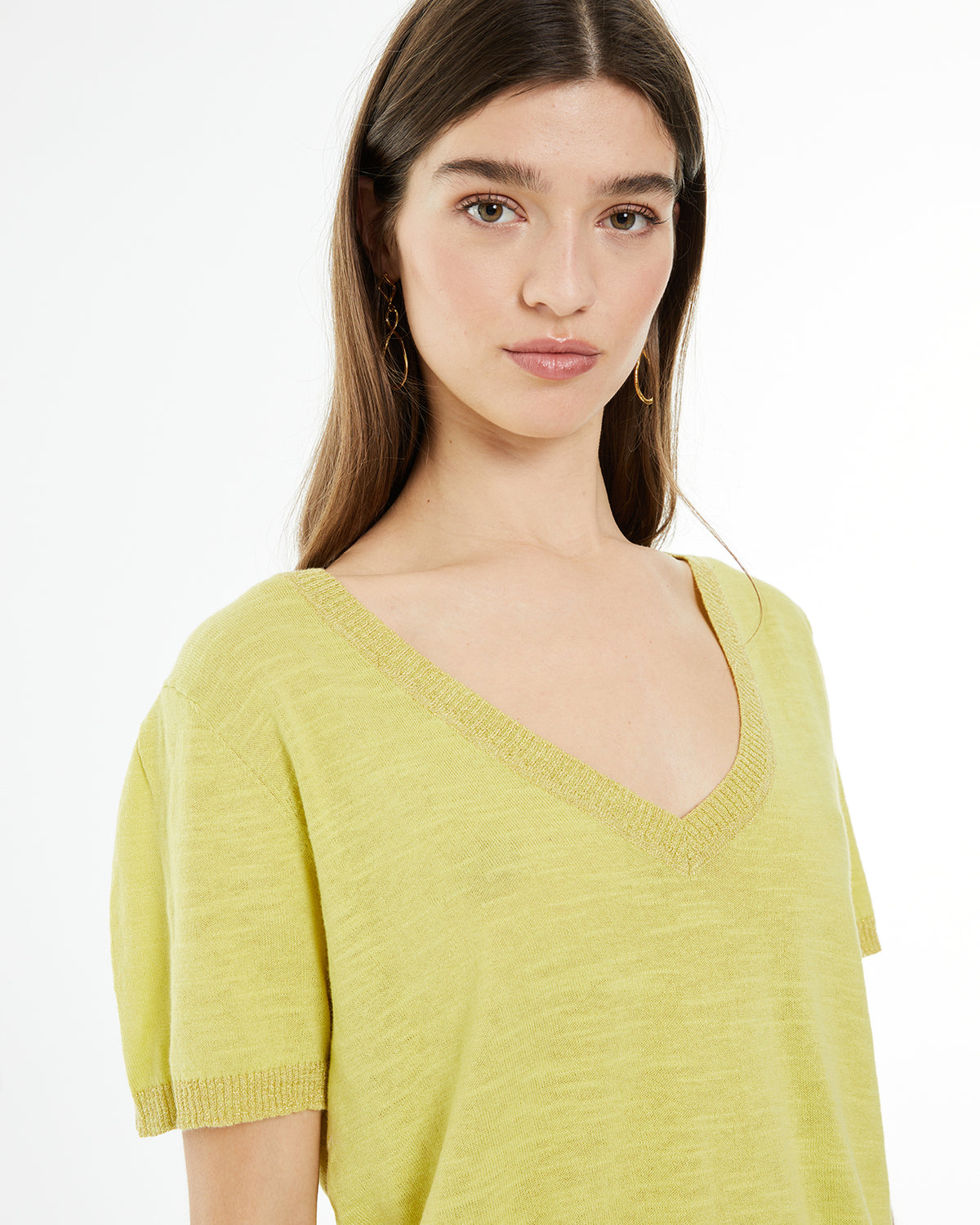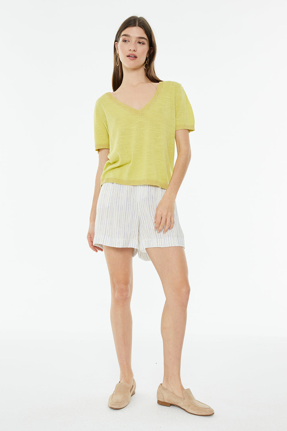 Jersey de mujer, cuello pico de manga corta. Detalle de tira en el escote. Acabados en rib.