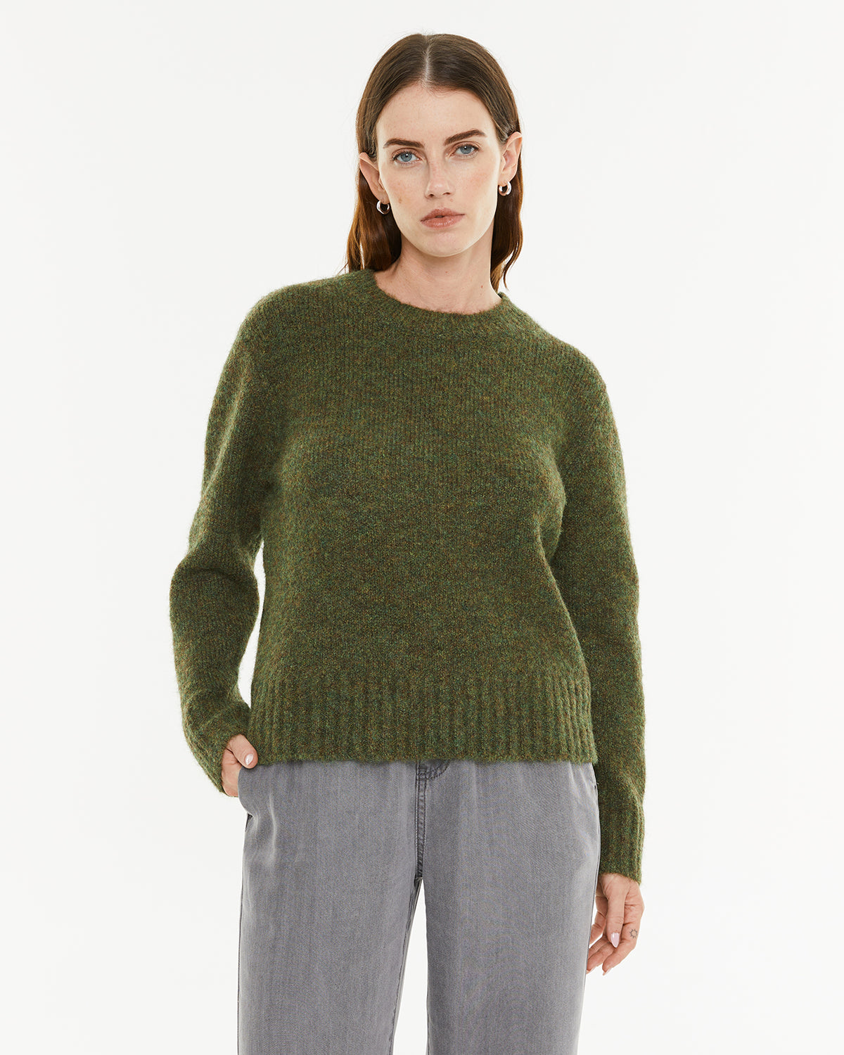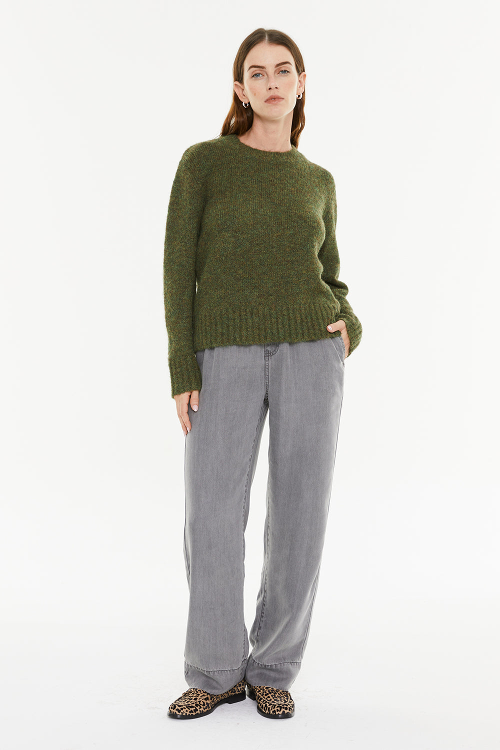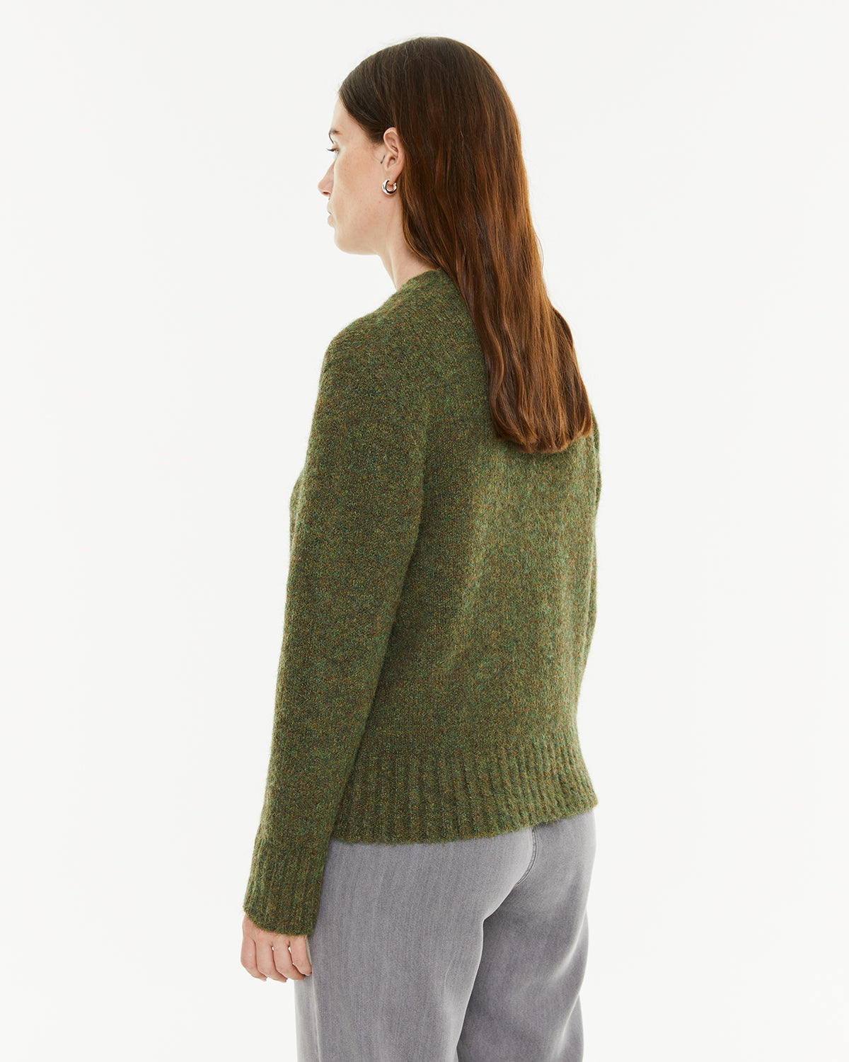 Jersey de mujer con escote redondo y acabados en rib. Prenda sostenible.
