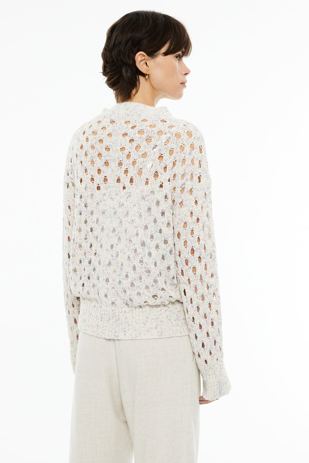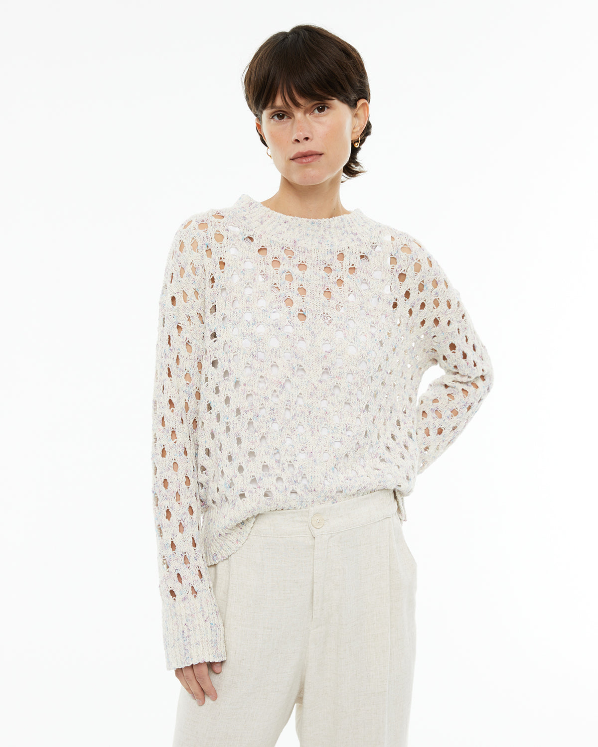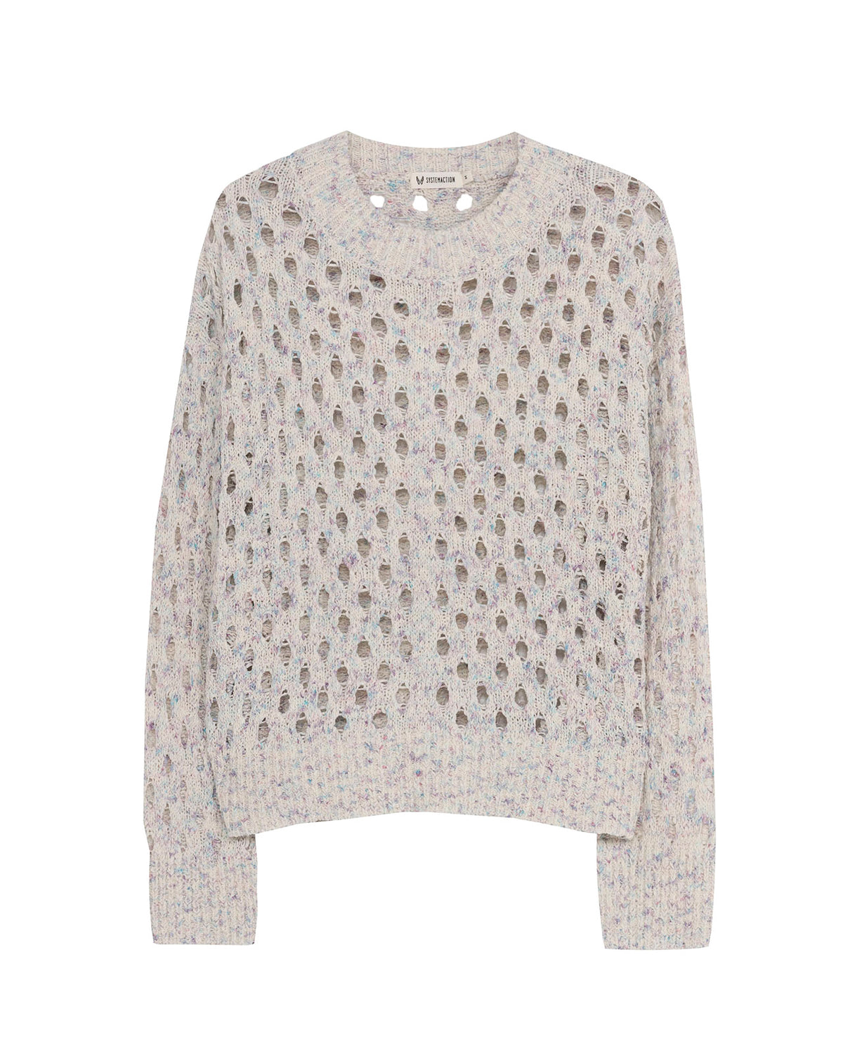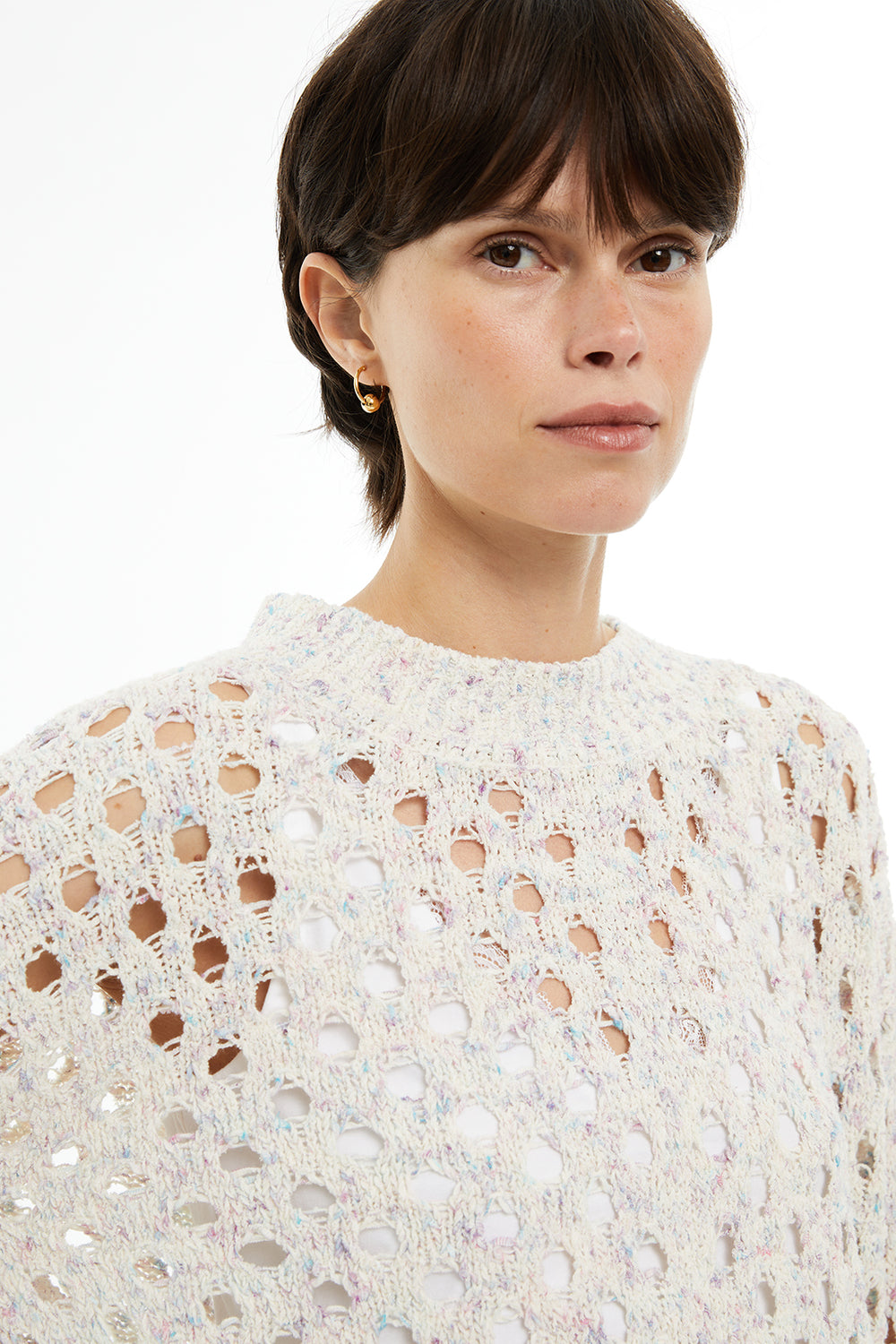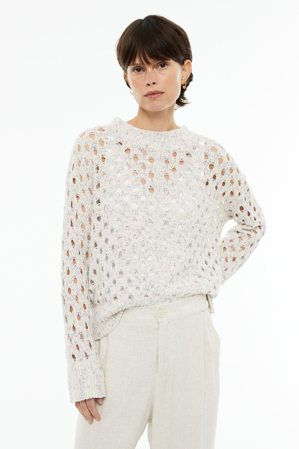Jersey de mujer punto calado. Cuello redondo, y manga larga. Acabados en rib. Prenda sostenible.