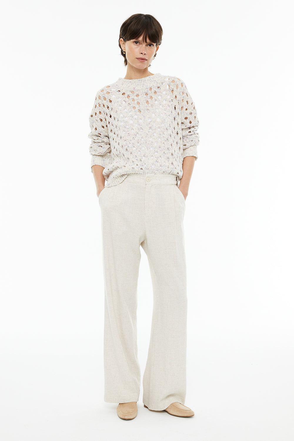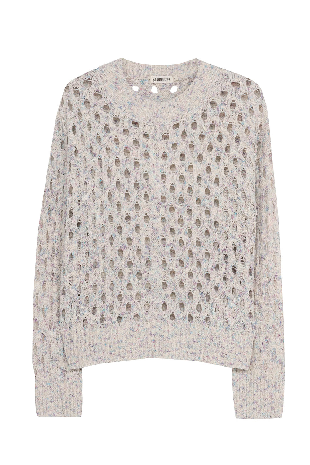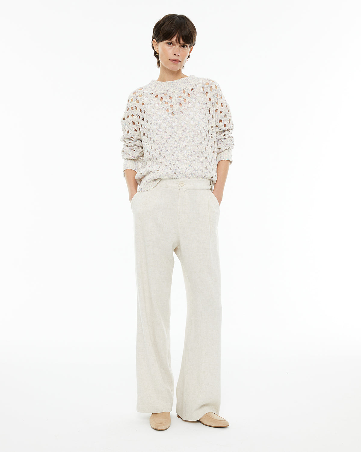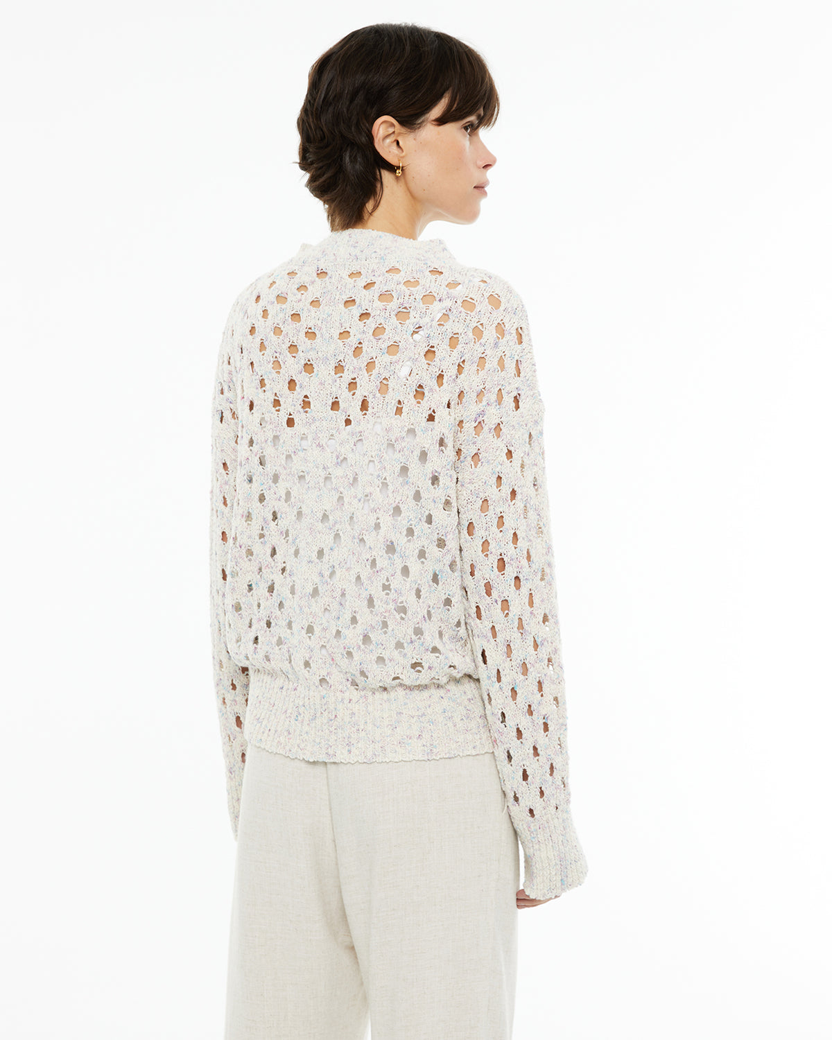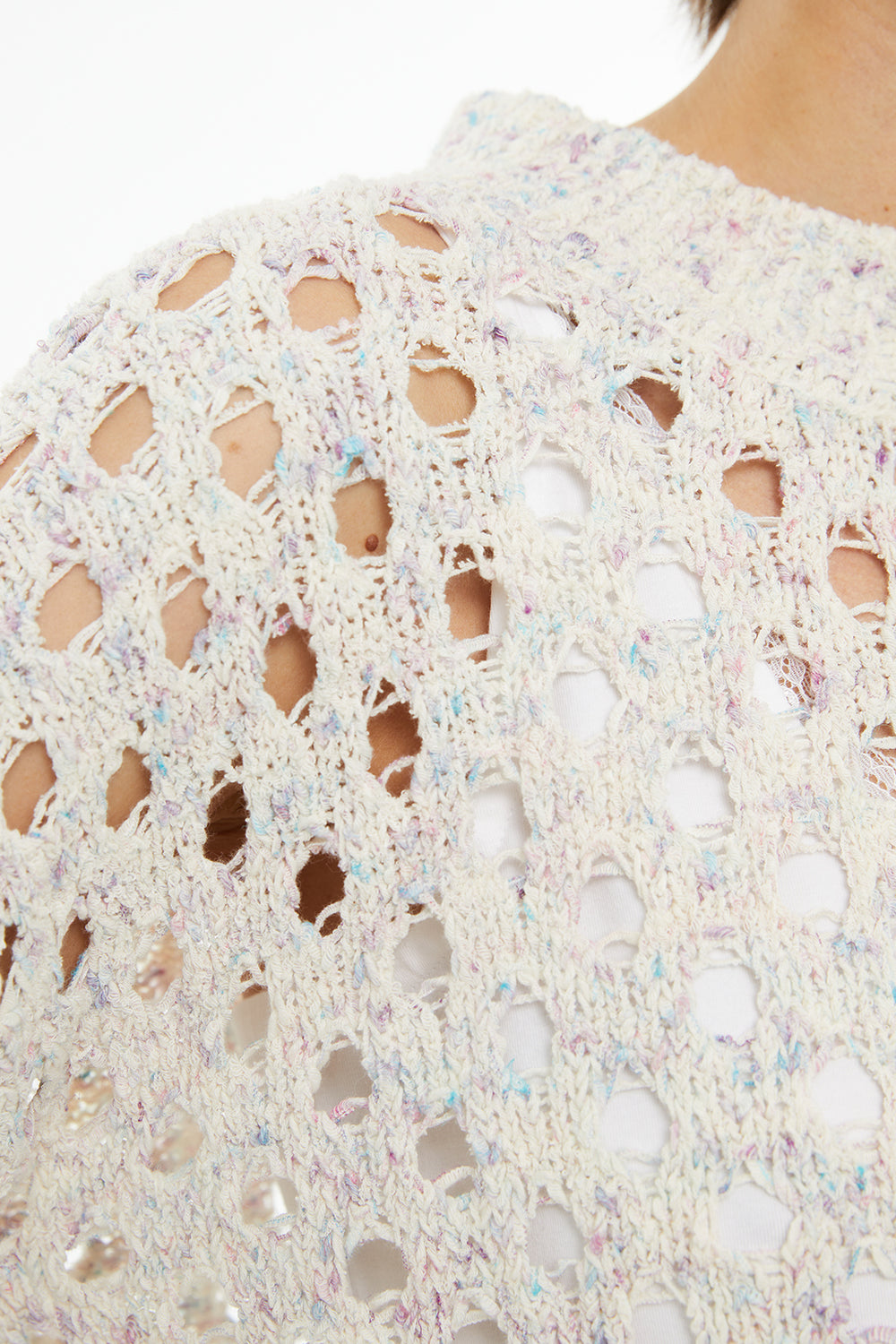 Jersey de mujer punto calado. Cuello redondo, y manga larga. Acabados en rib. Prenda sostenible.