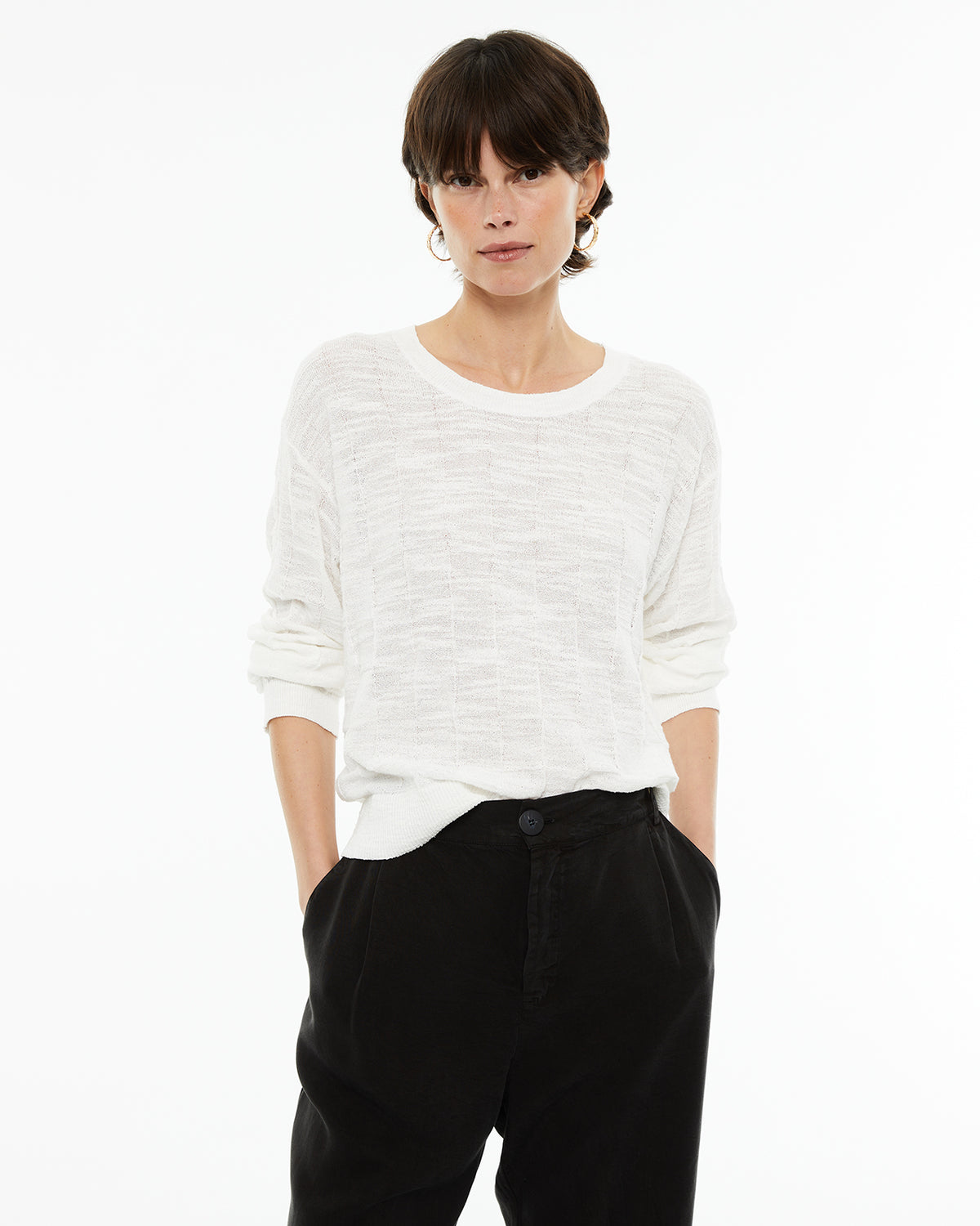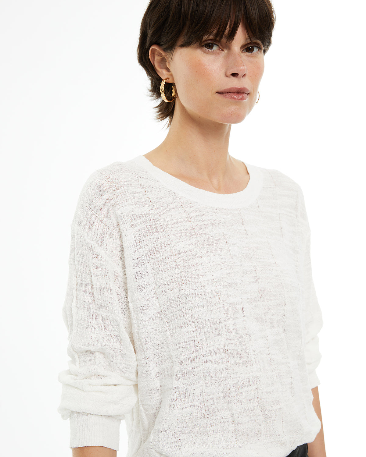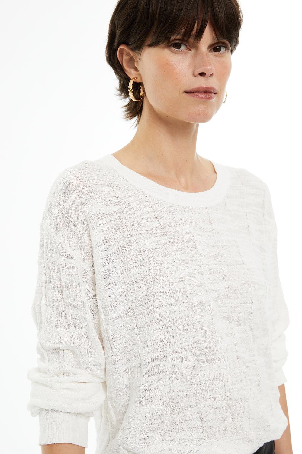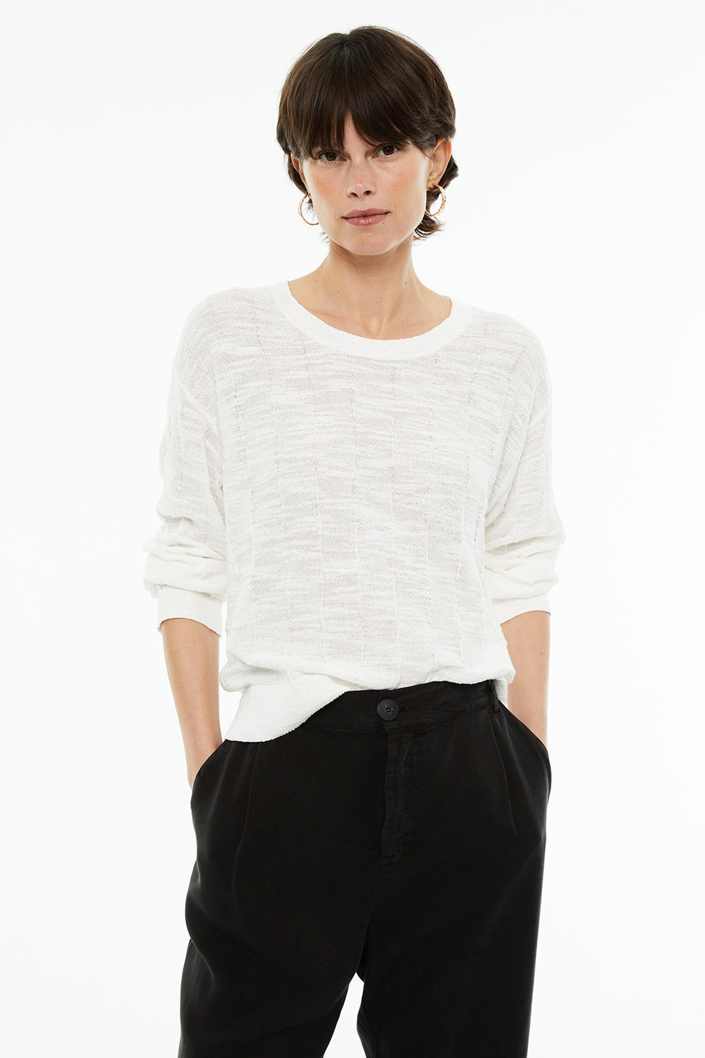 Jersey de mujer punto estructurado geométrico. Cuello redondo, y manga larga. Acabados en rib.