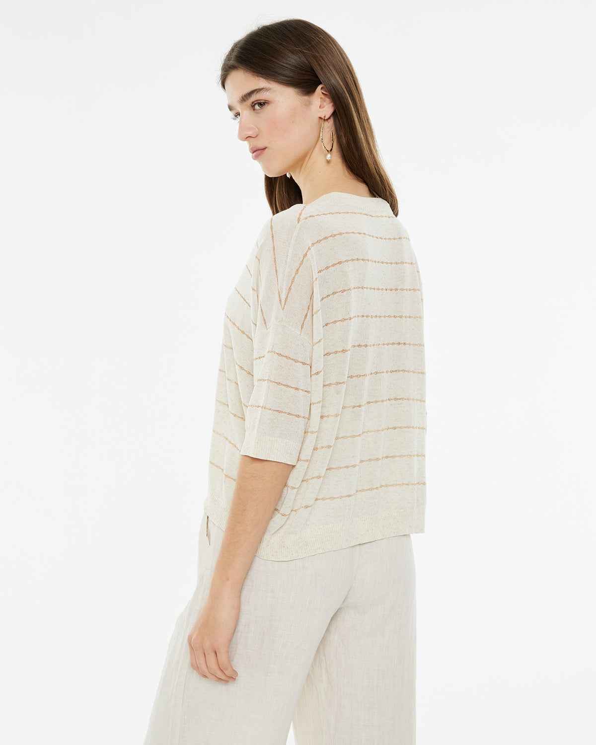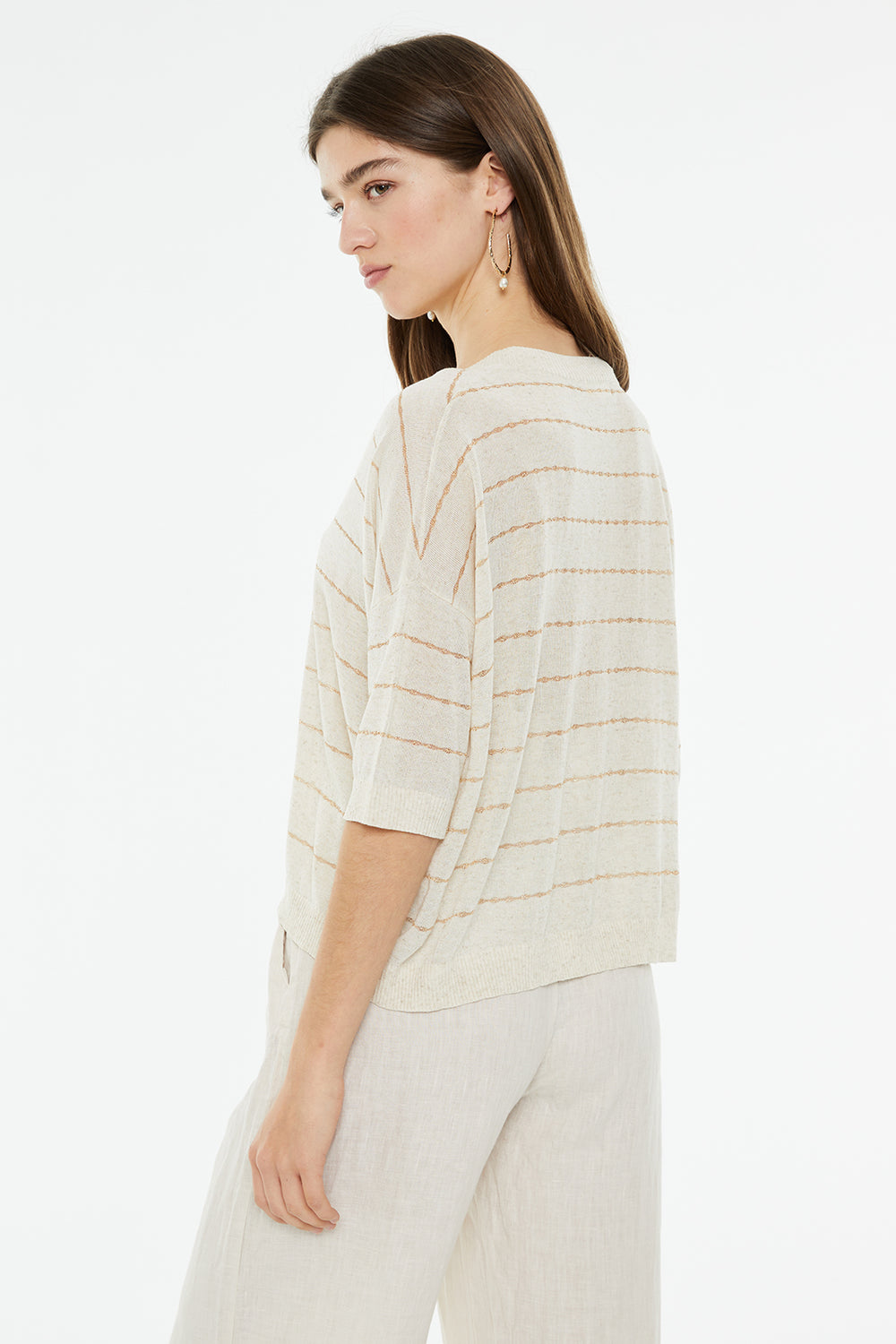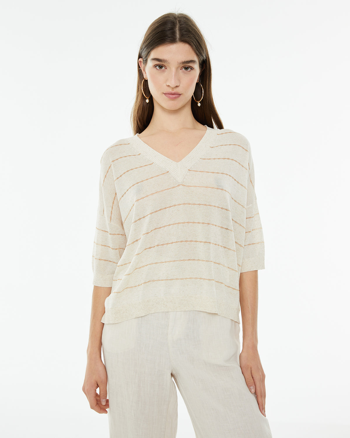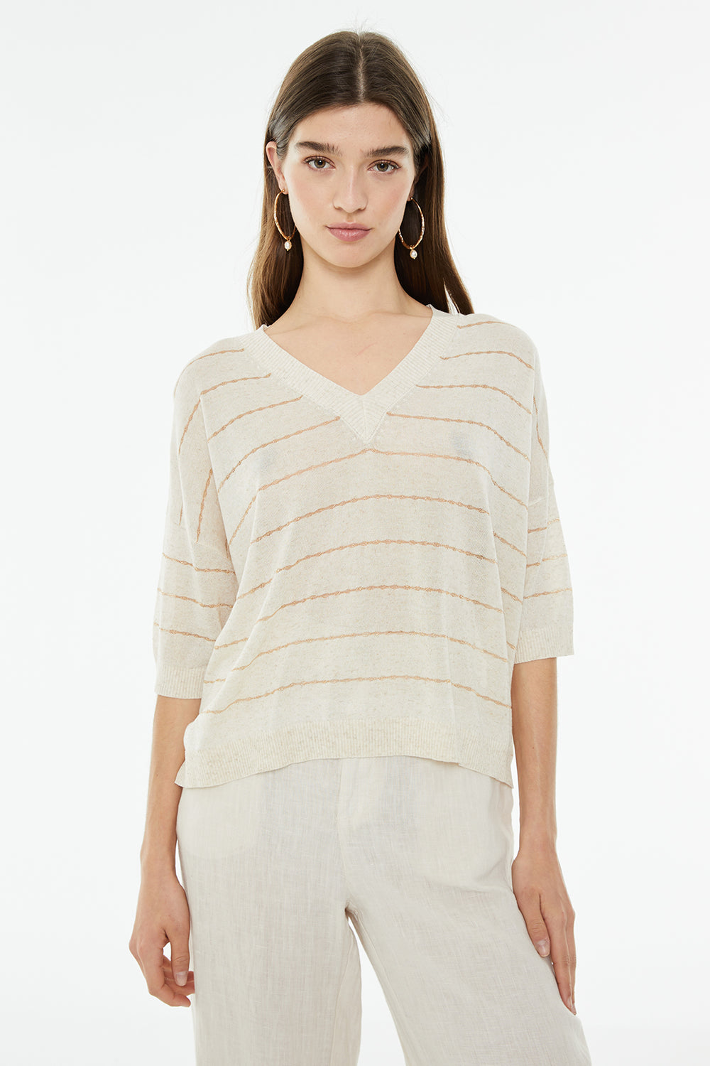 Jersey de mujer de rayas con lúrex, con el cuello pico, manga corta y acabados en rib.