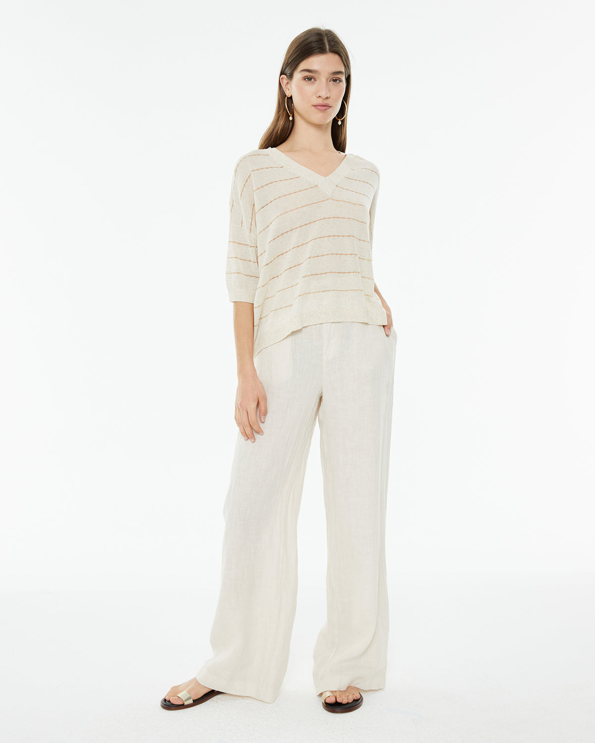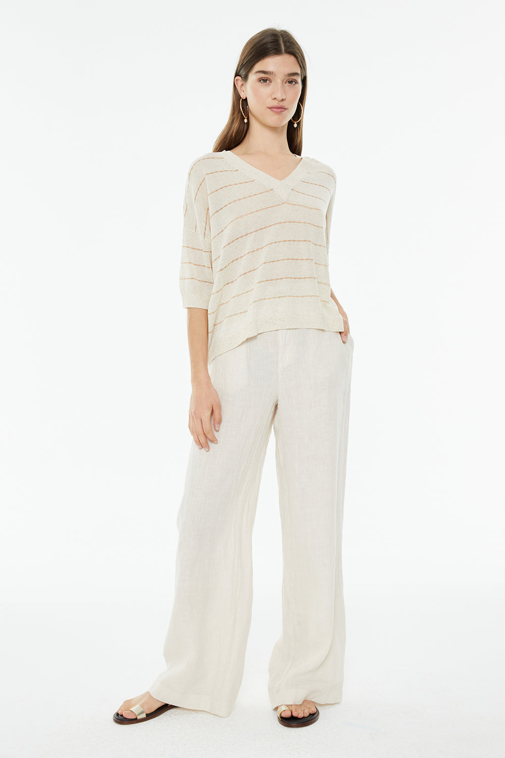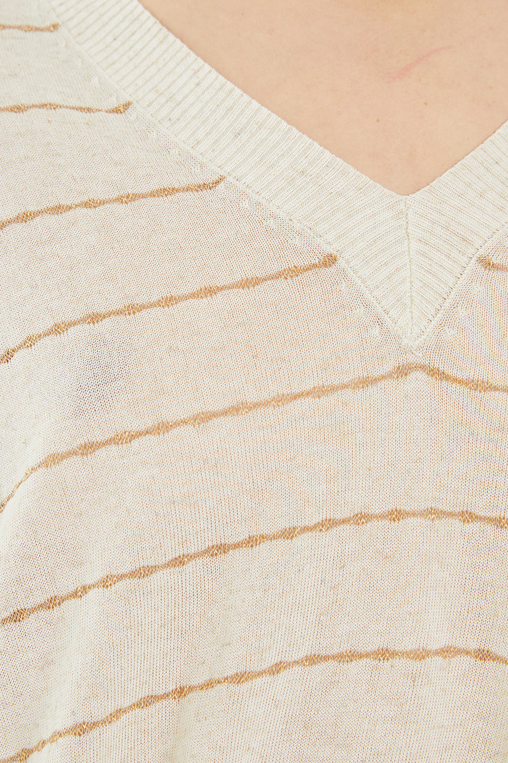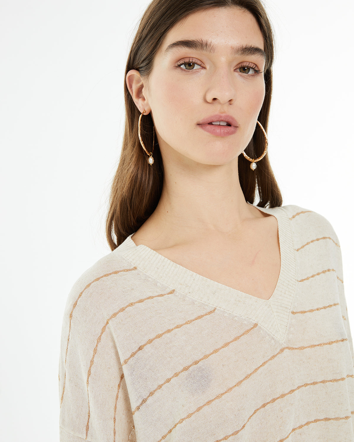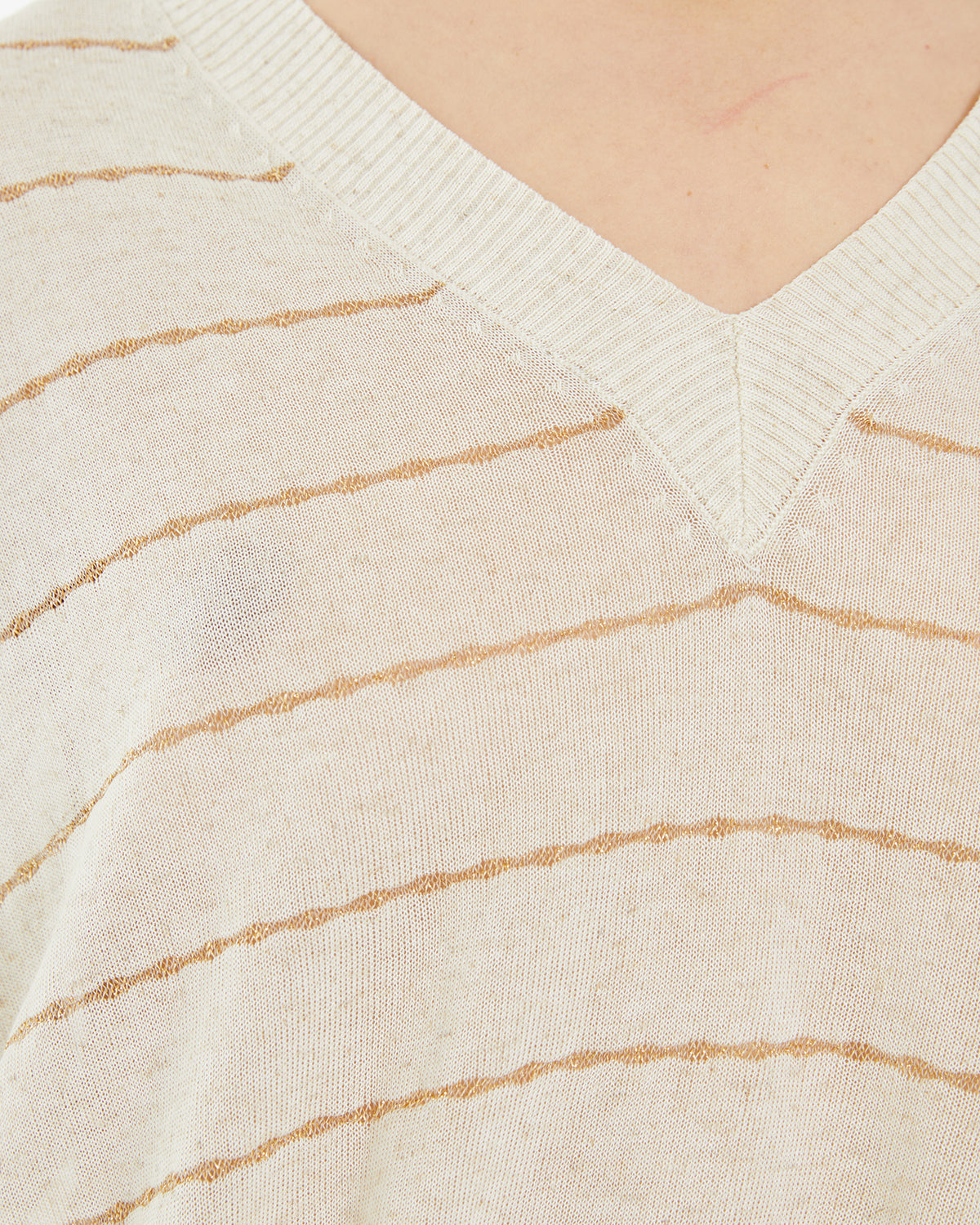 Jersey de mujer de rayas con lúrex, con el cuello pico, manga corta y acabados en rib.