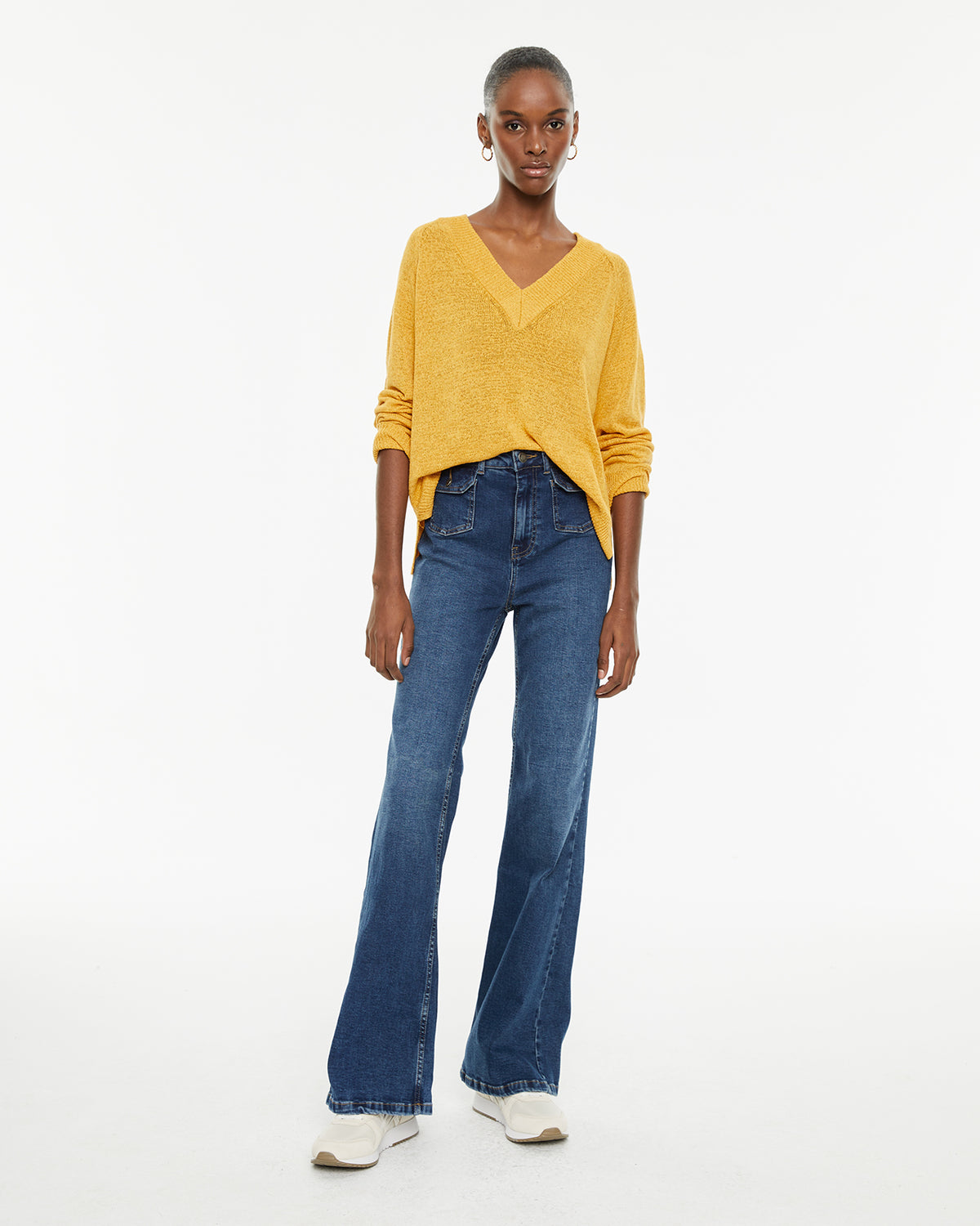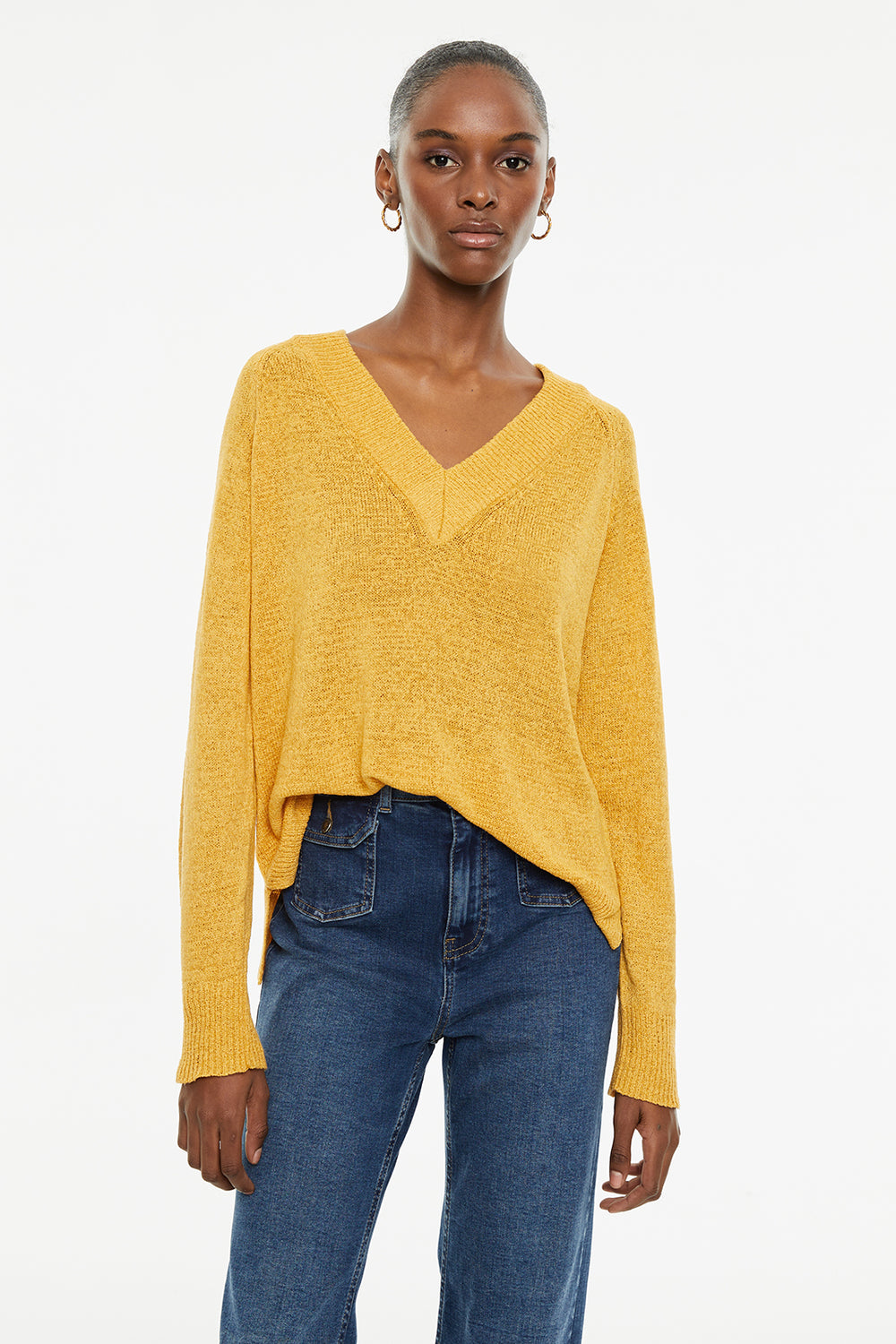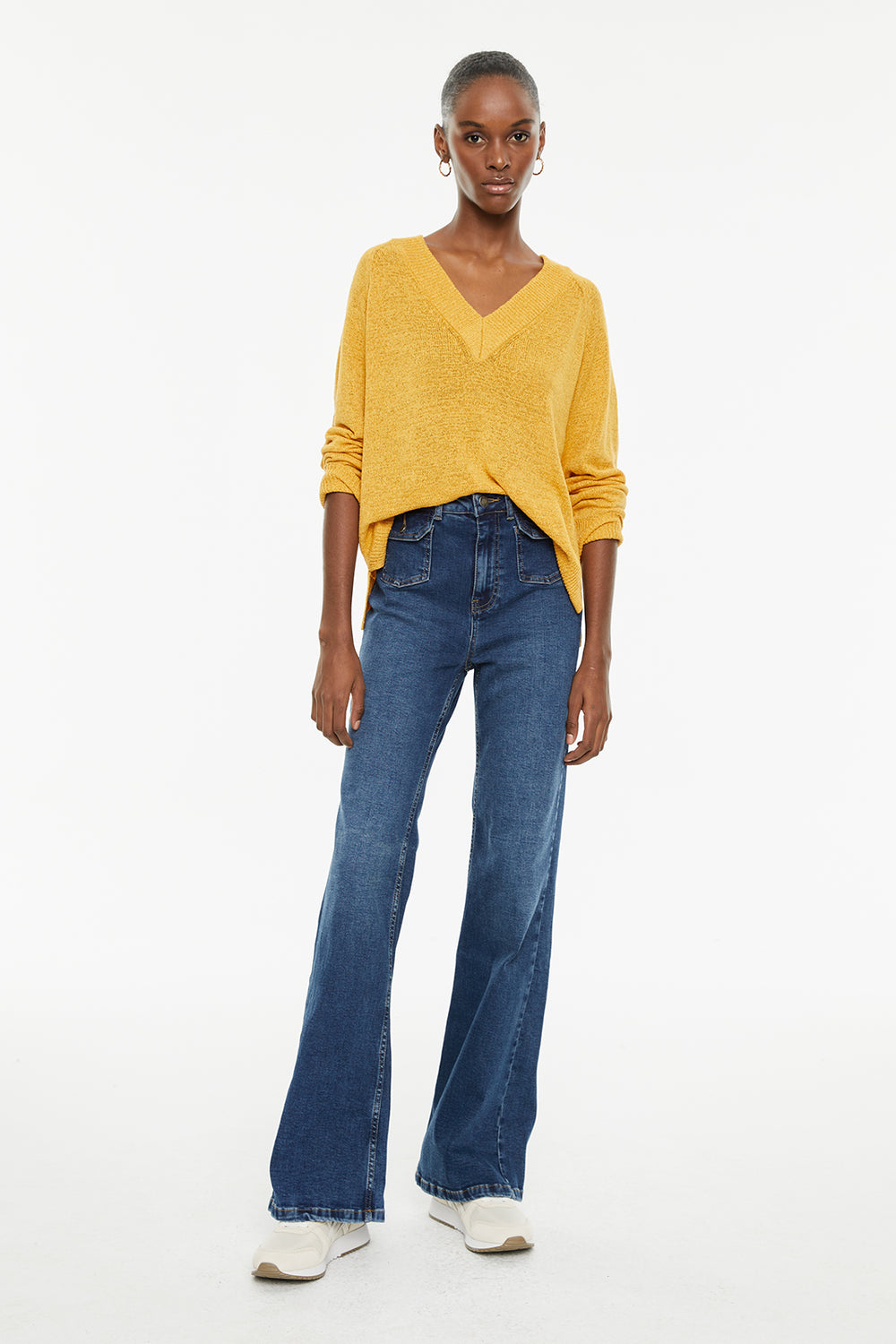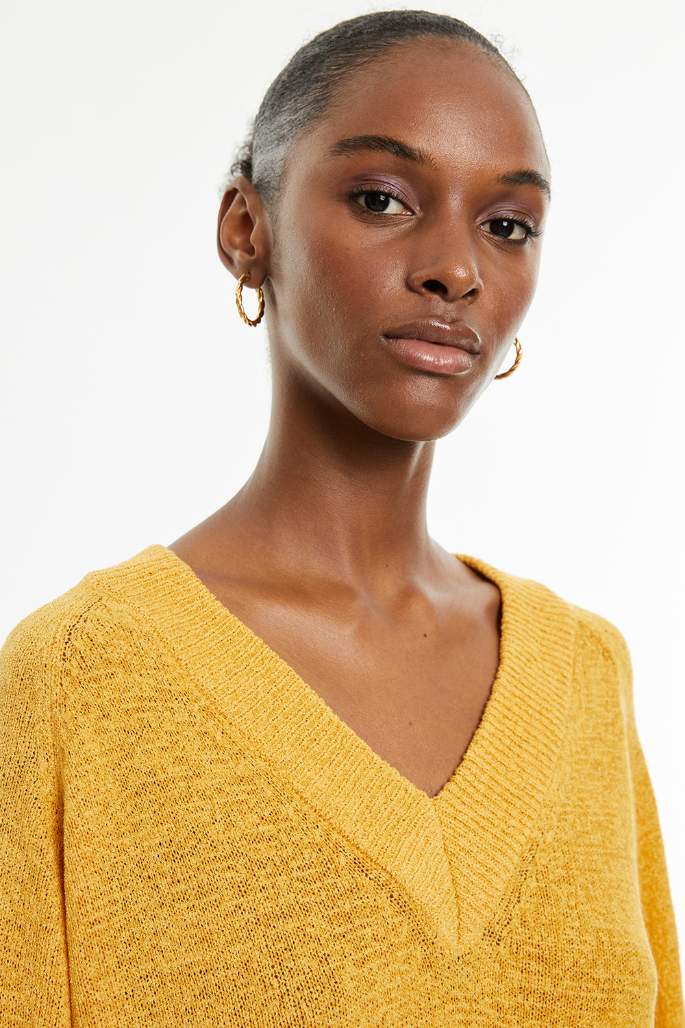 Jersey de escote pico, manga larga y aberturas en los laterales. Acabados en rib.
