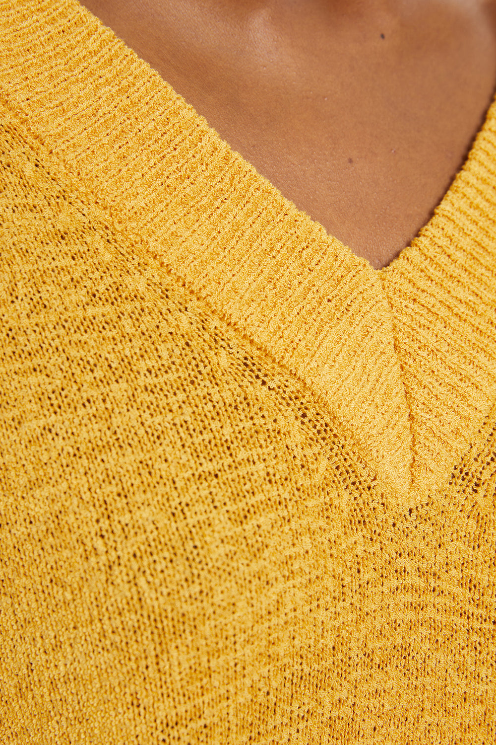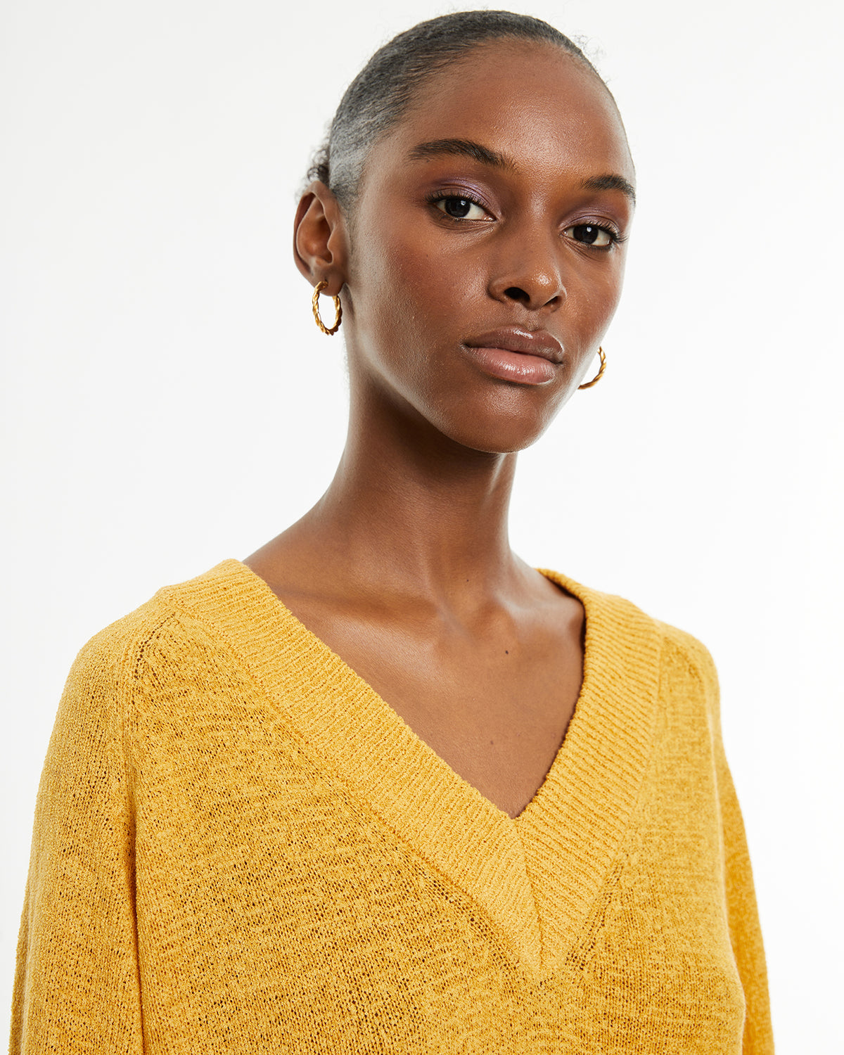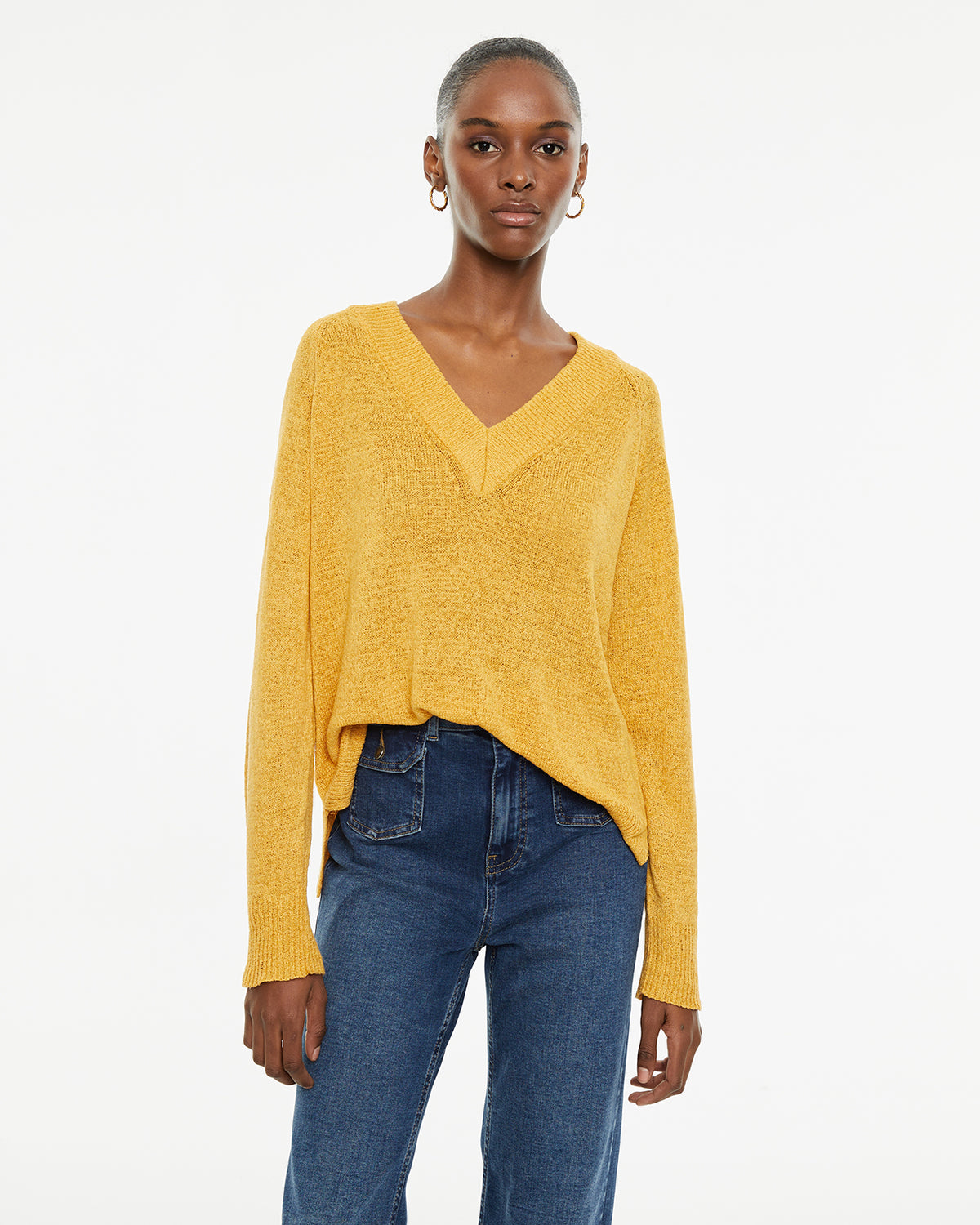 Jersey de escote pico, manga larga y aberturas en los laterales. Acabados en rib.