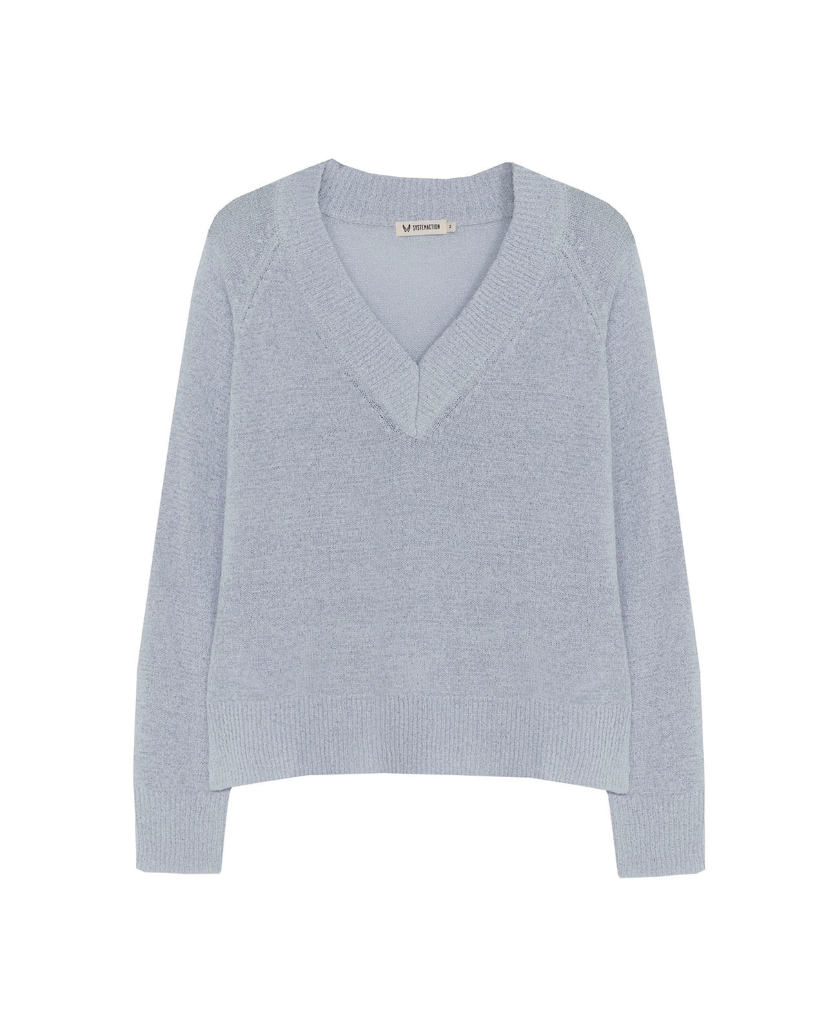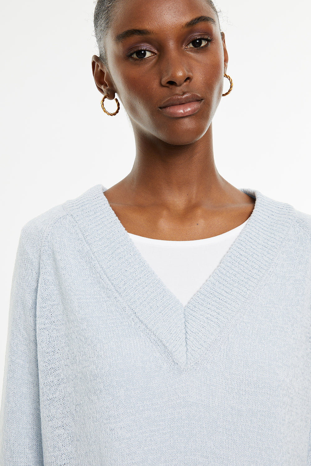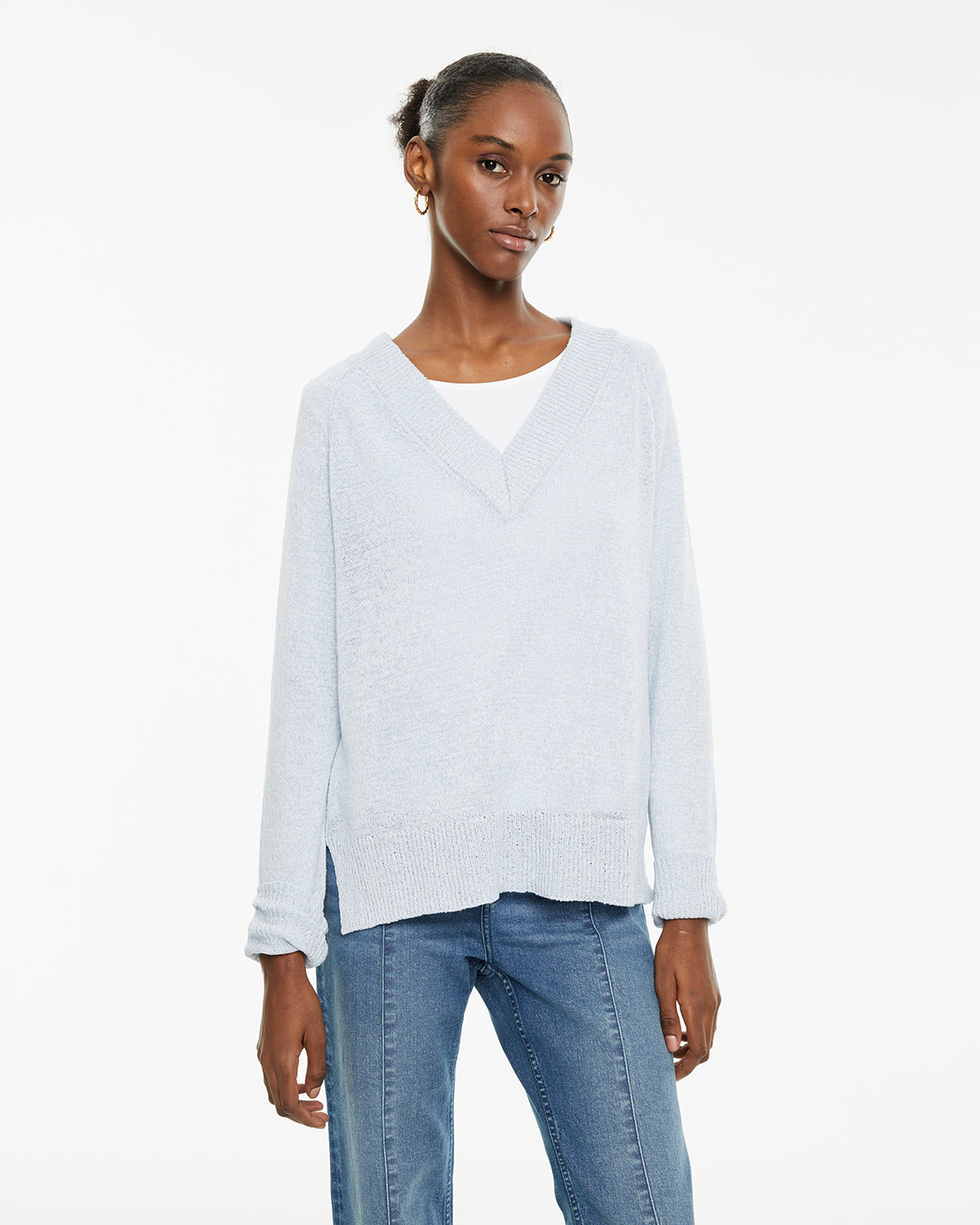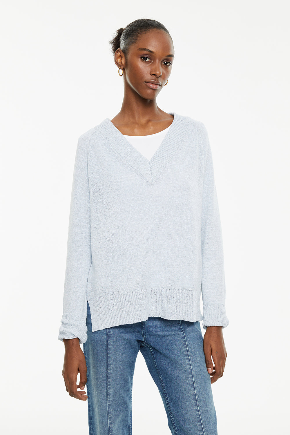 Jersey de escote pico, manga larga y aberturas en los laterales. Acabados en rib.