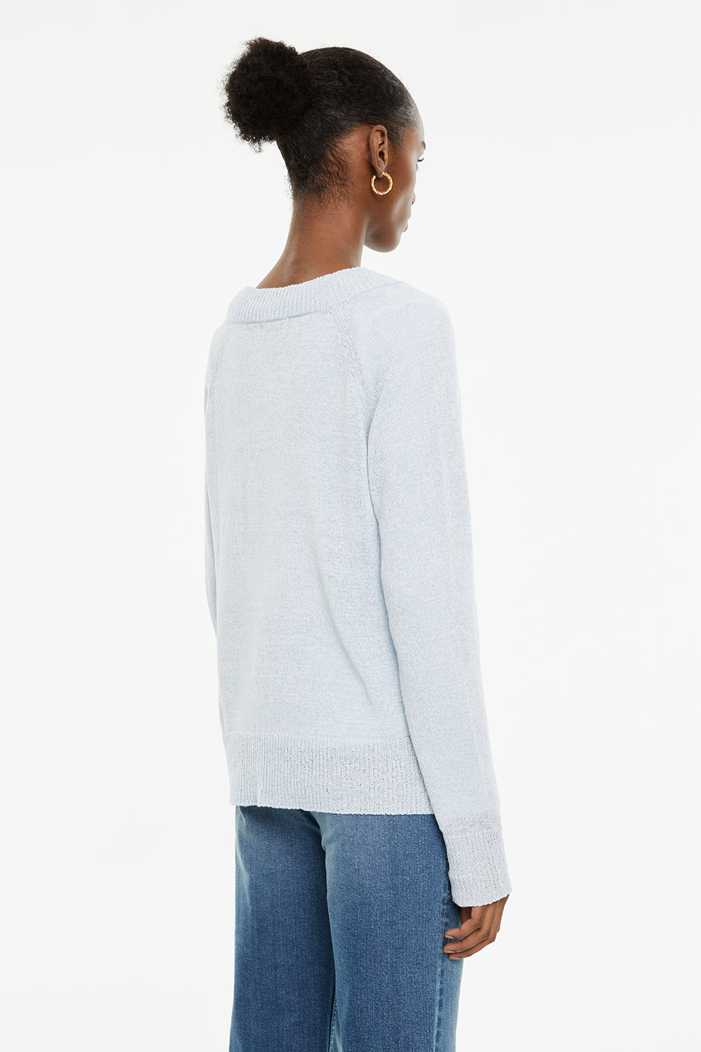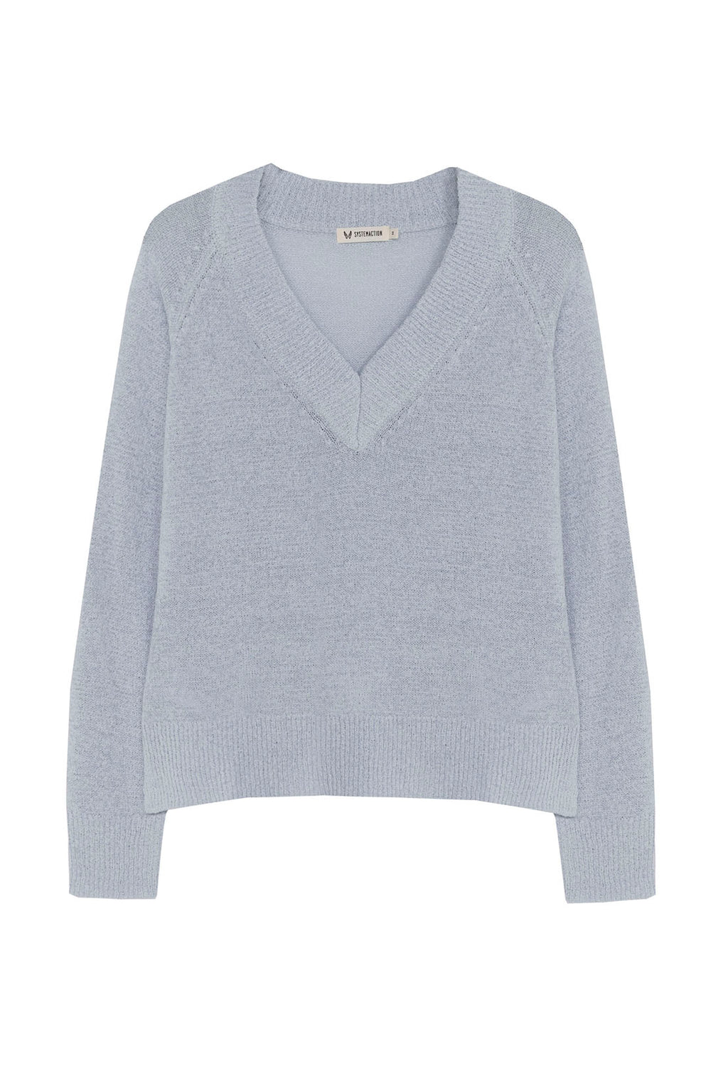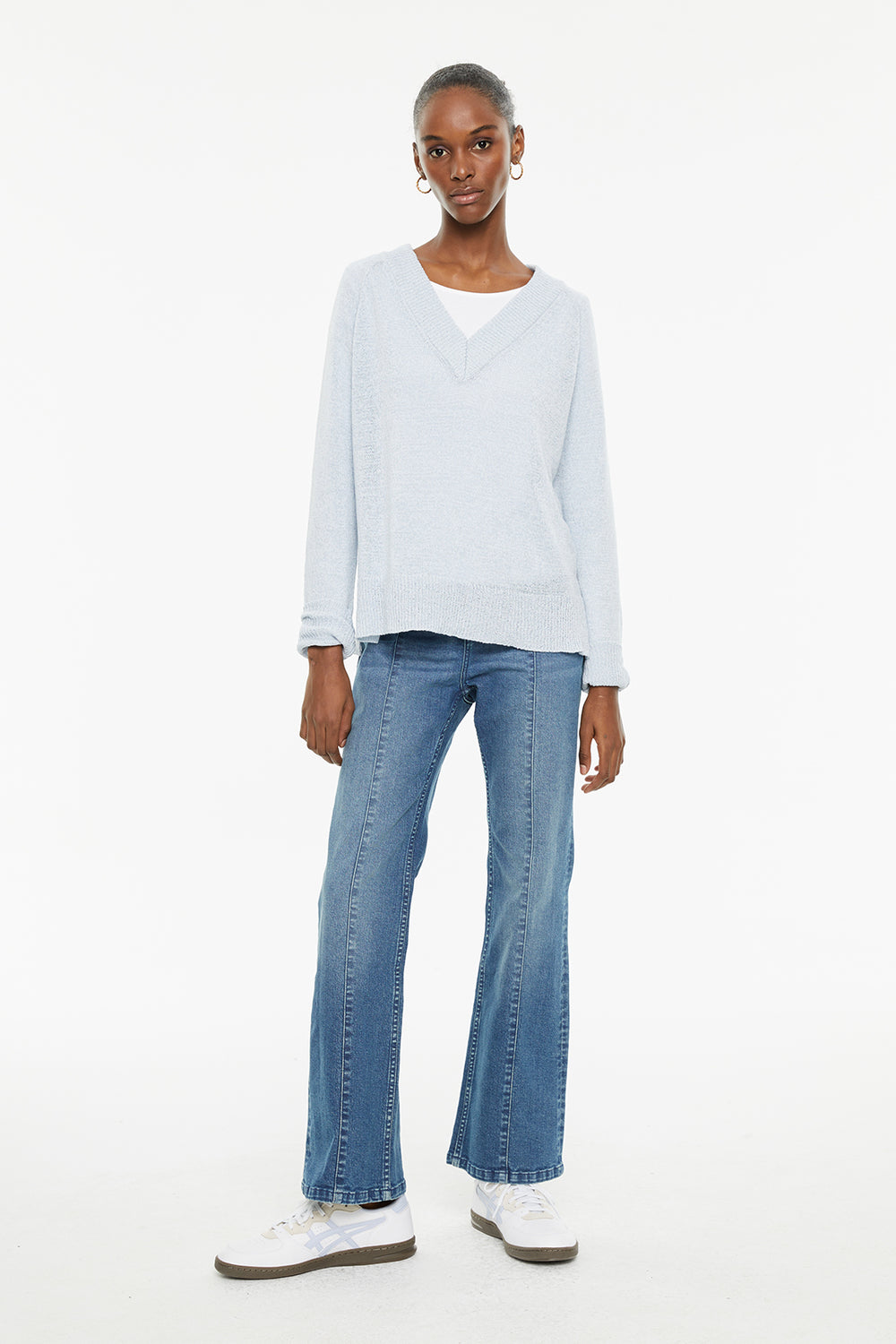 Jersey de escote pico, manga larga y aberturas en los laterales. Acabados en rib.