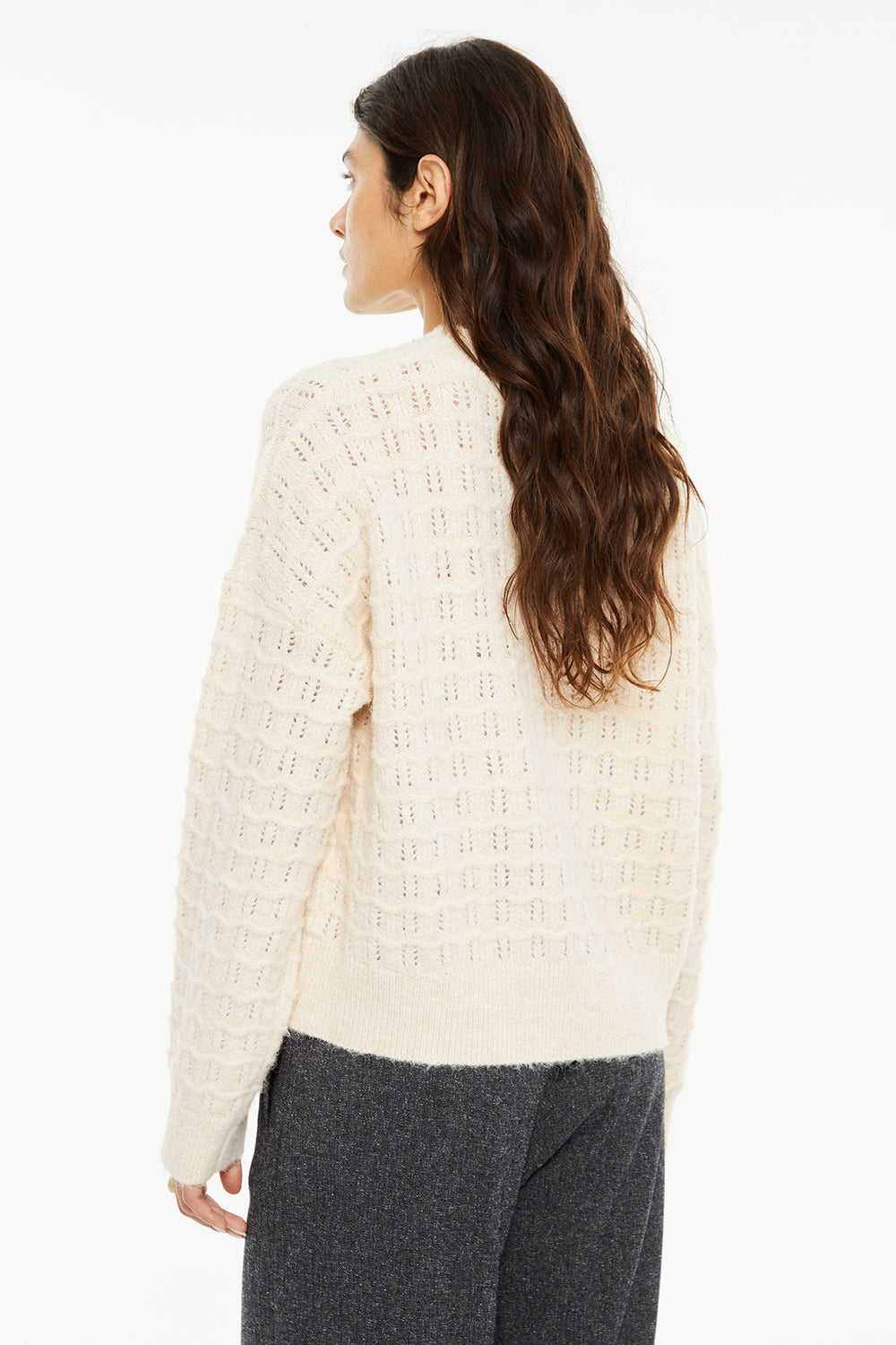 Jersey de mujer, escote redondo y punto con estructura. Prenda sostenible.