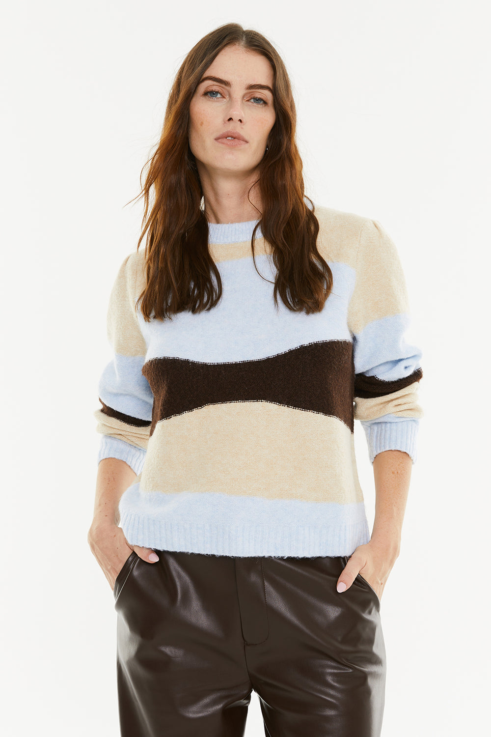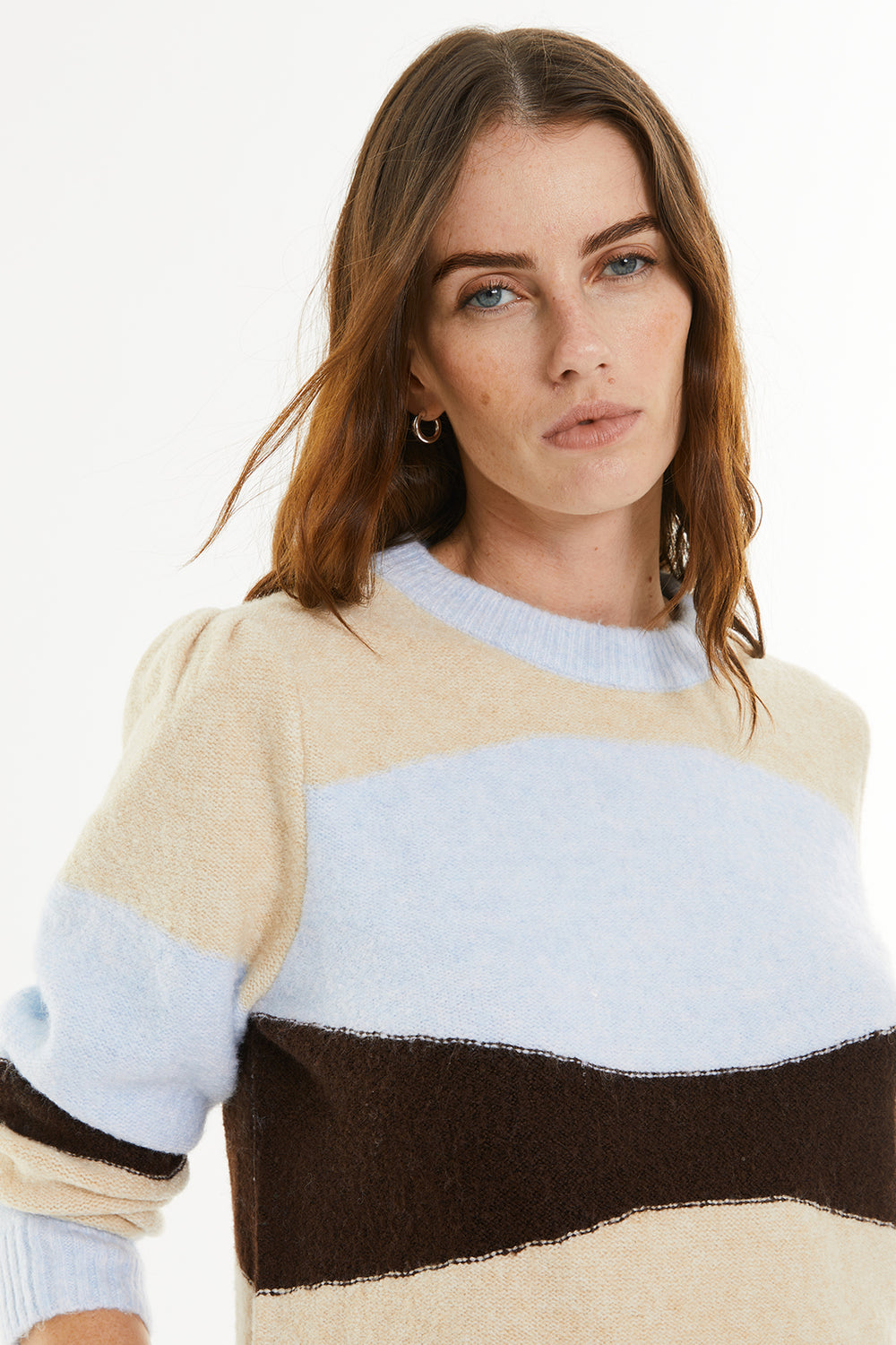 Jersey de mujer con jacquard tricolor, escote redondo y acabados en rib. Prenda sostenible.