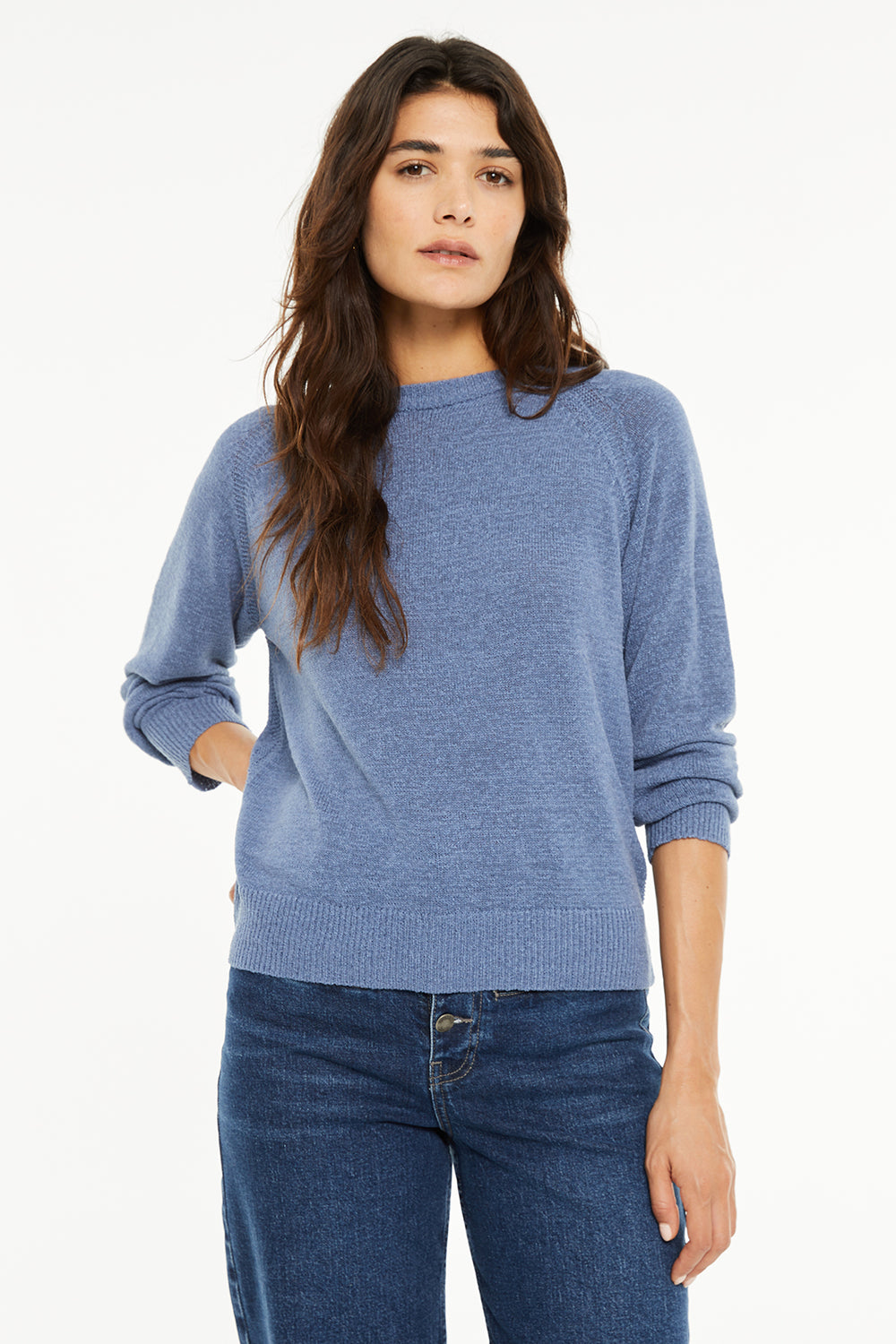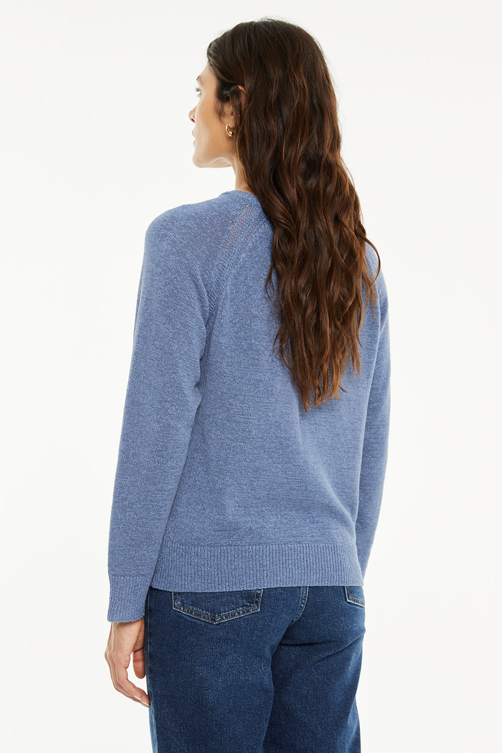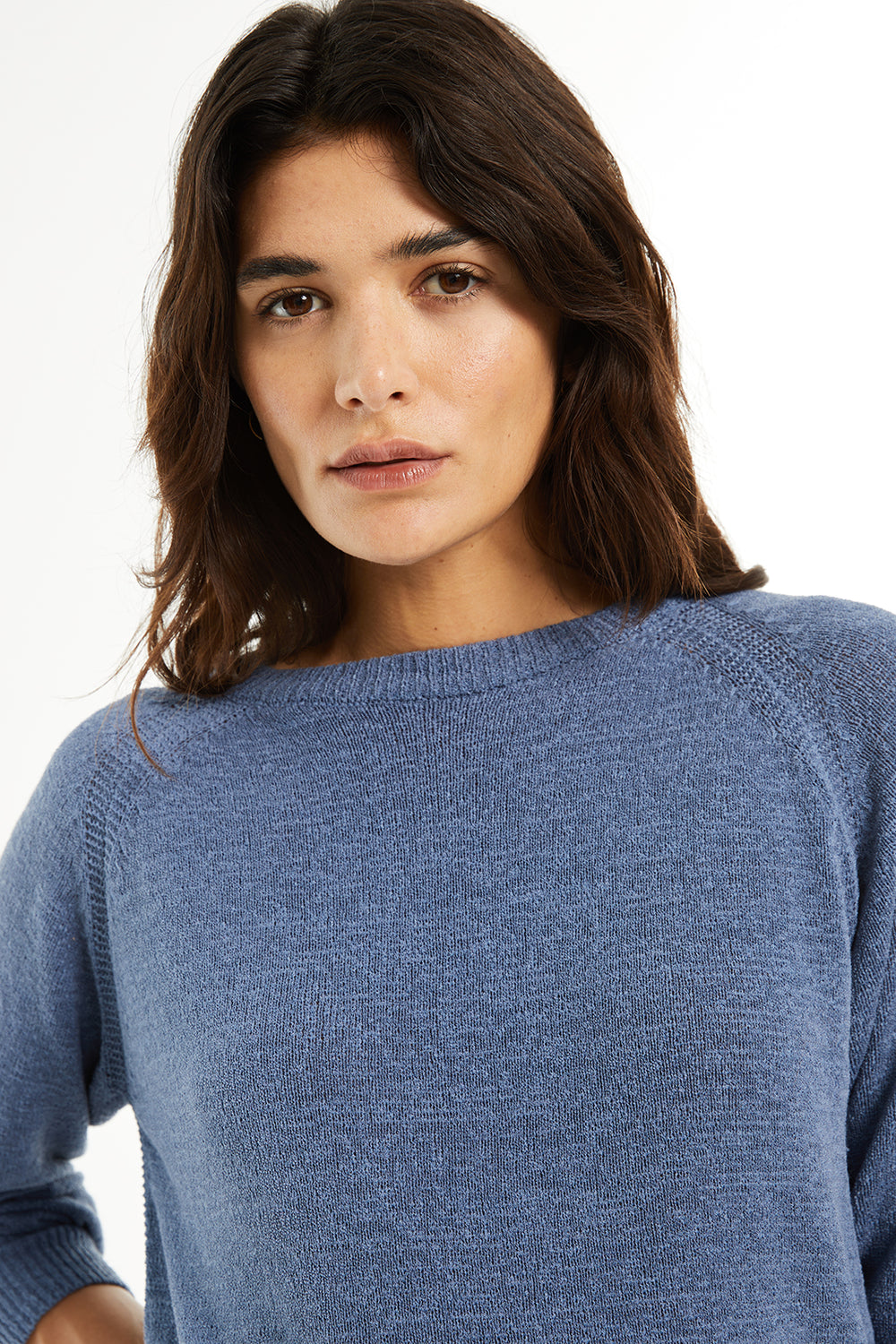 Jersey de mujer con cuello redondo, manga larga y acabados en rib.