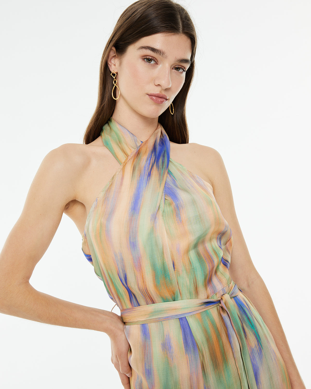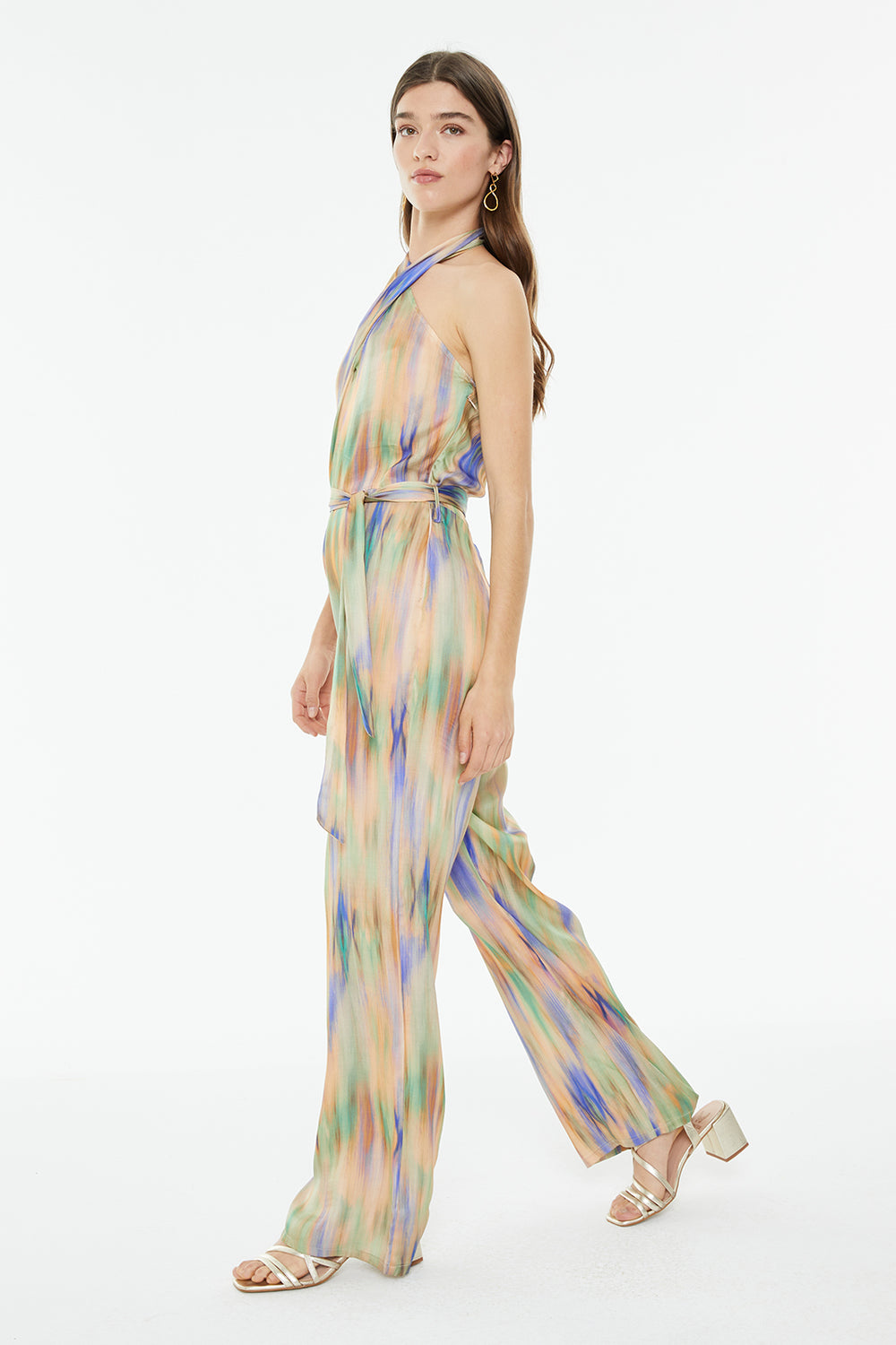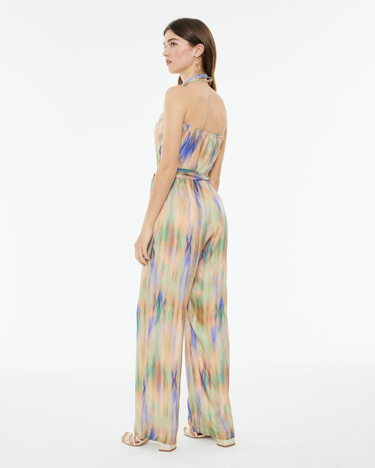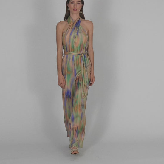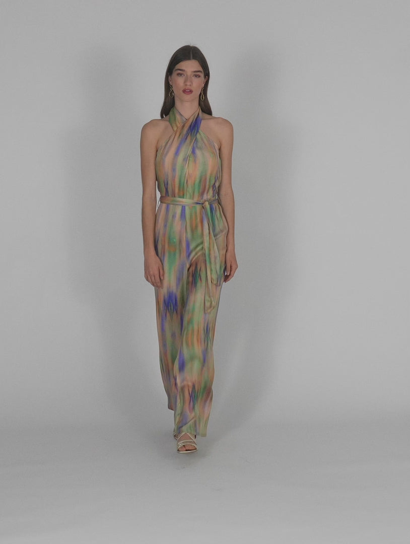 Mono largo de mujer, con un estampado de aguas, escote halter atado con botones en la espalda. Detalle de cinturón a la cintura. Prenda sostenible.
