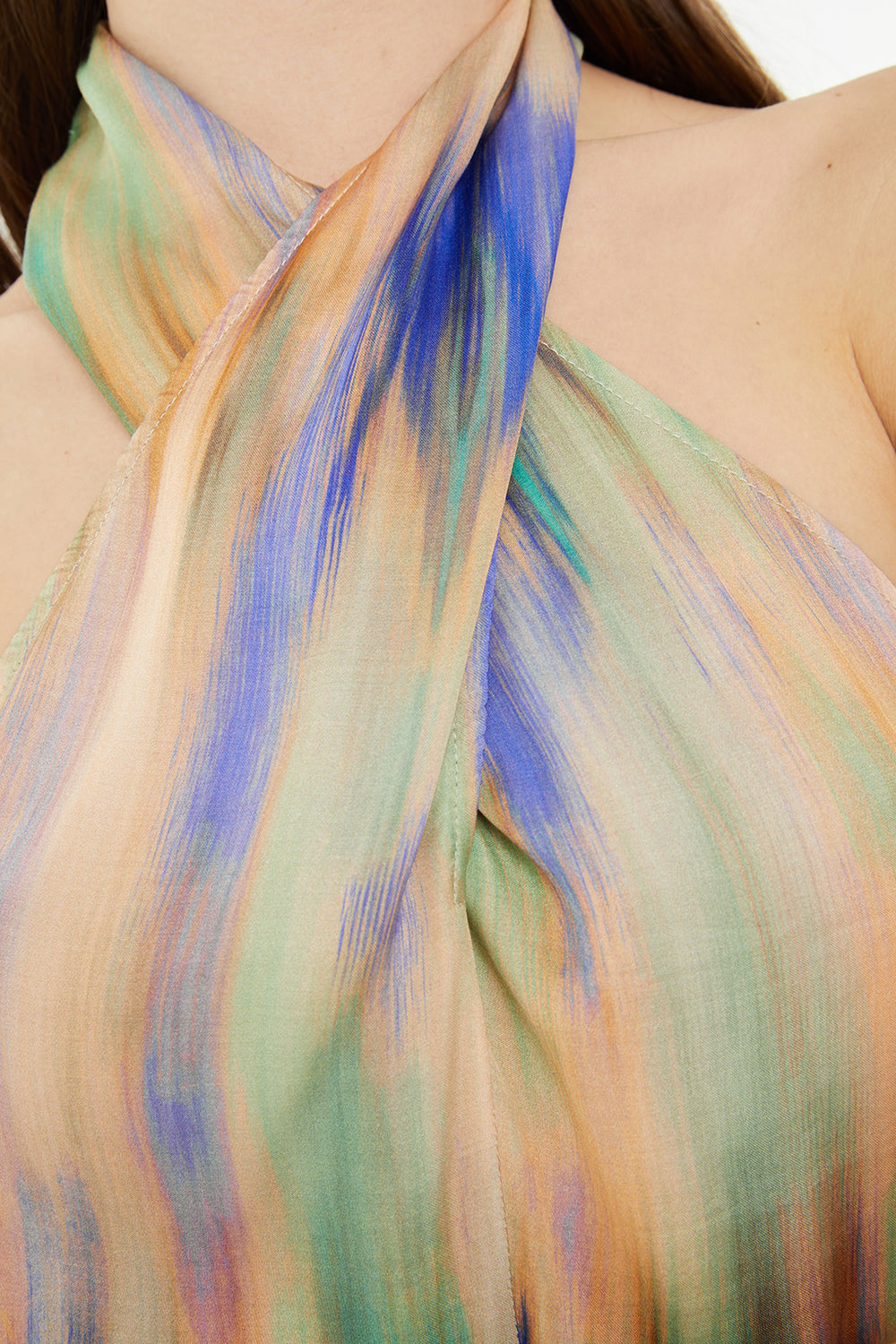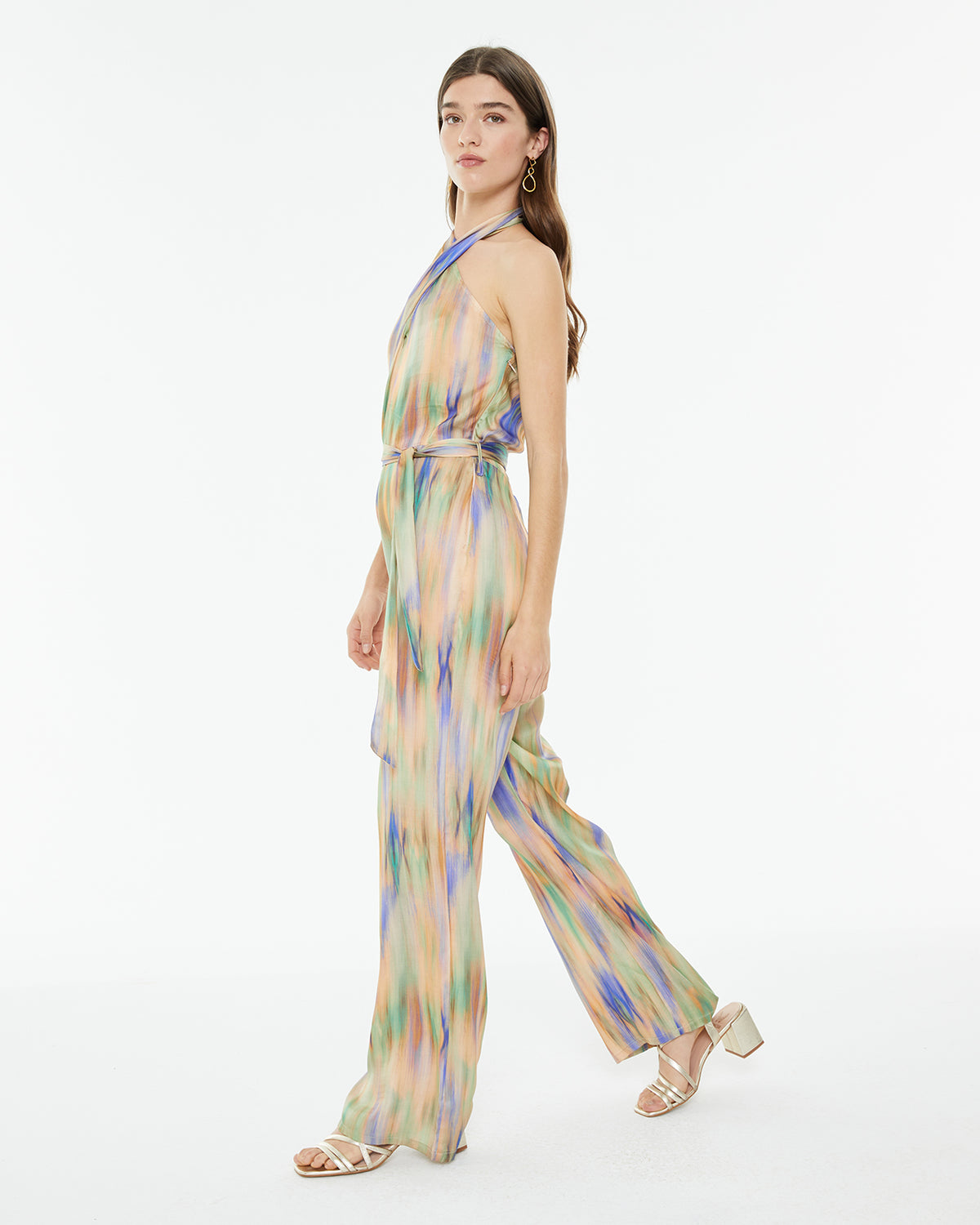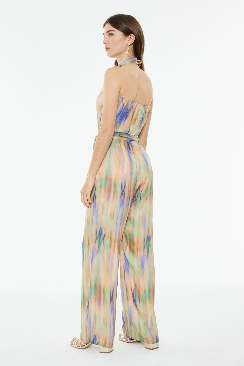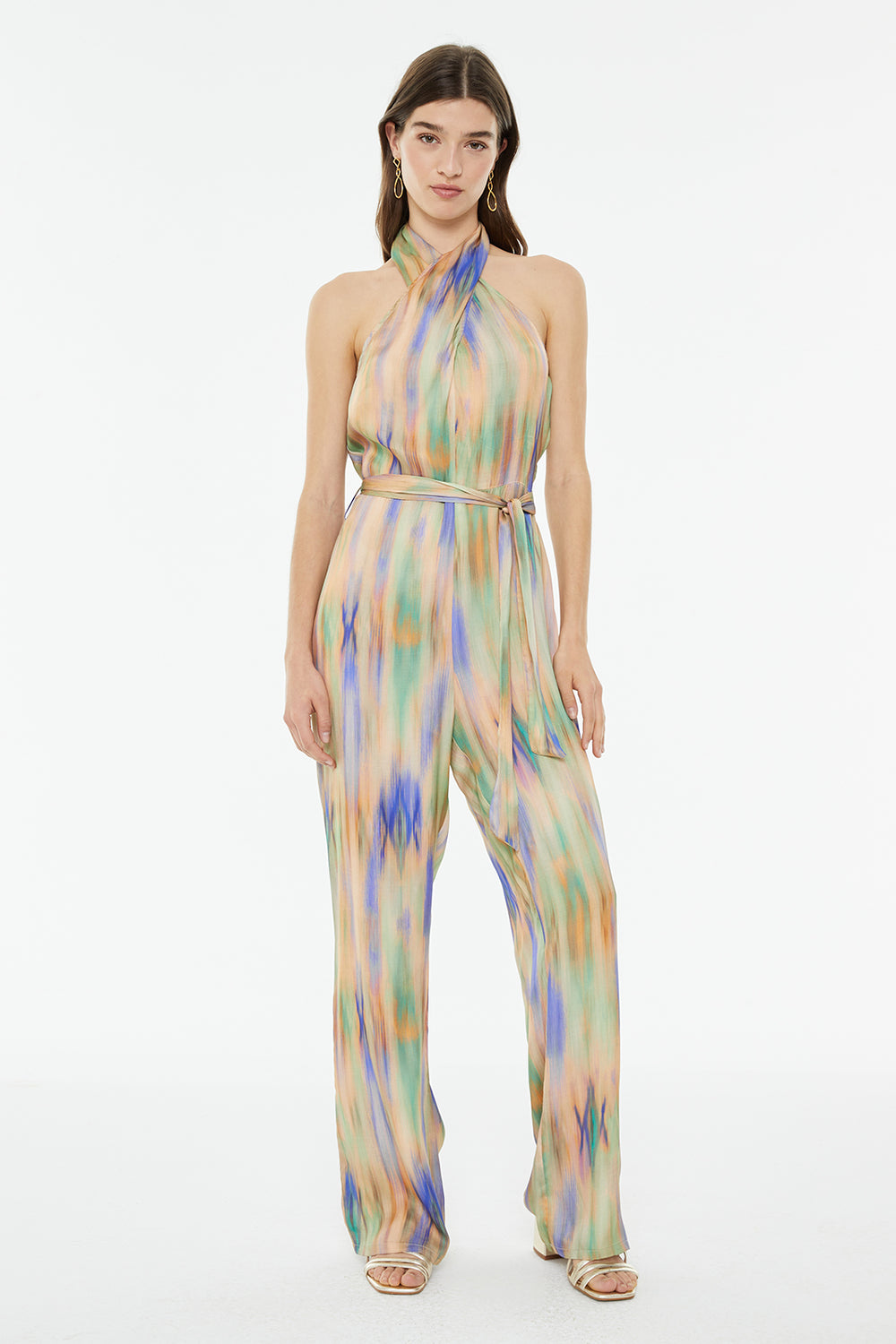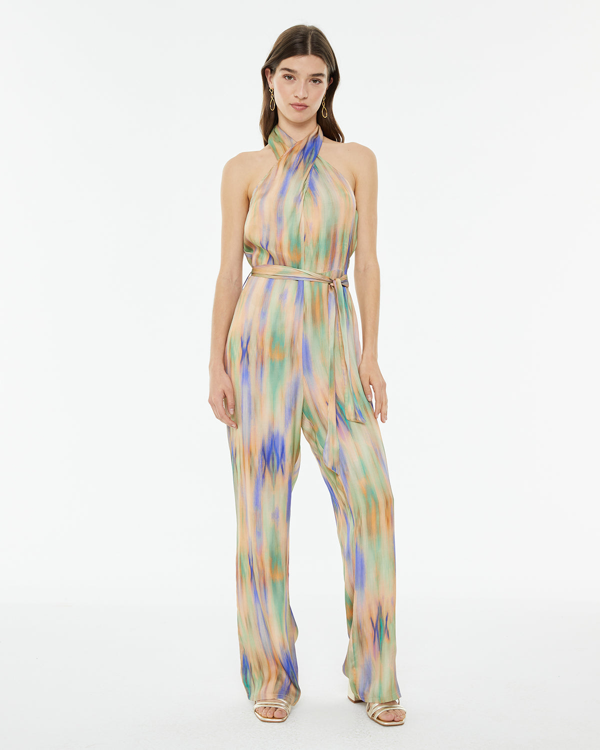 Mono largo de mujer, con un estampado de aguas, escote halter atado con botones en la espalda. Detalle de cinturón a la cintura. Prenda sostenible.