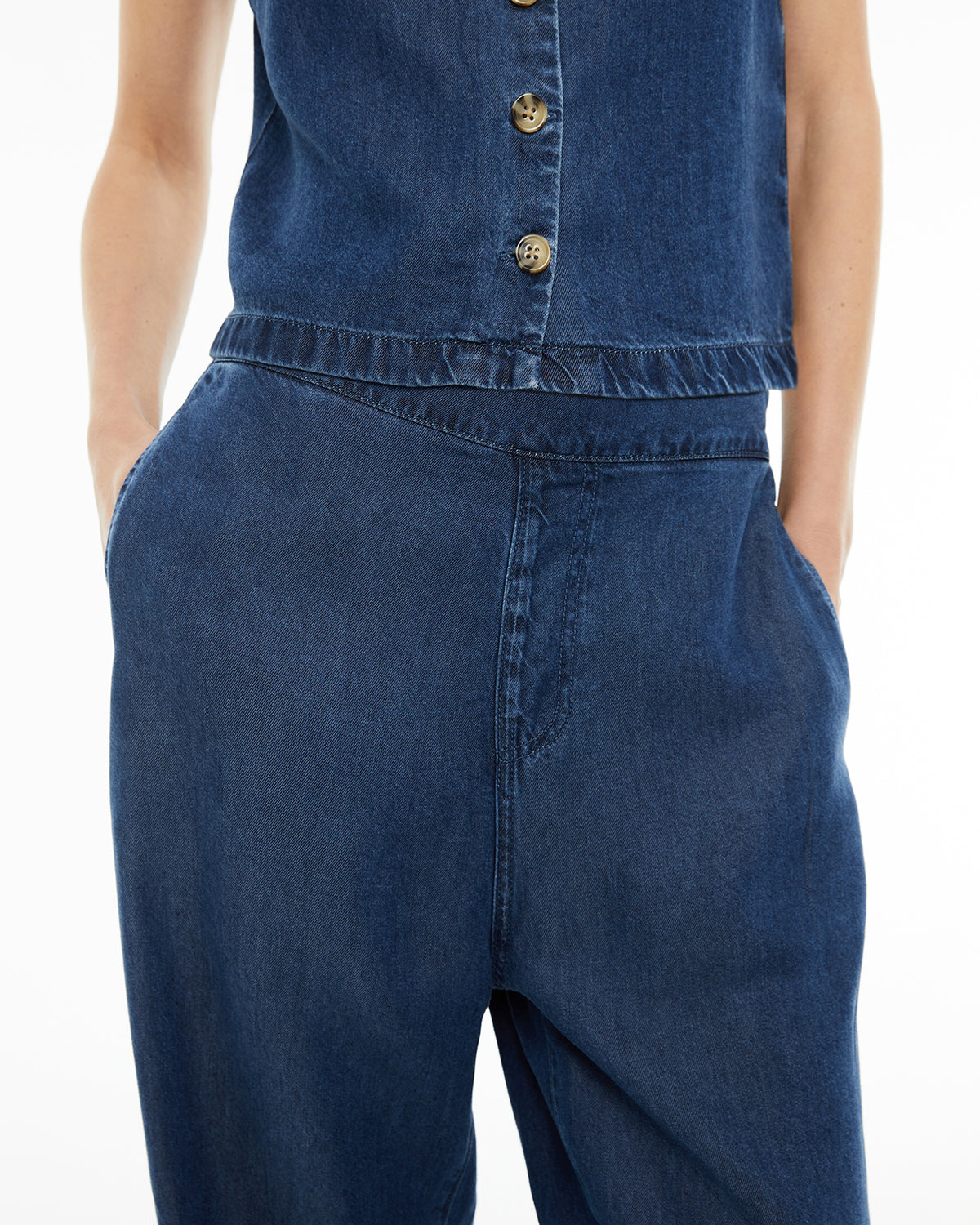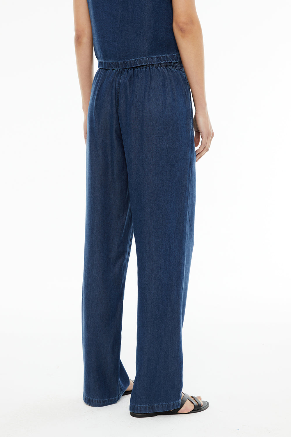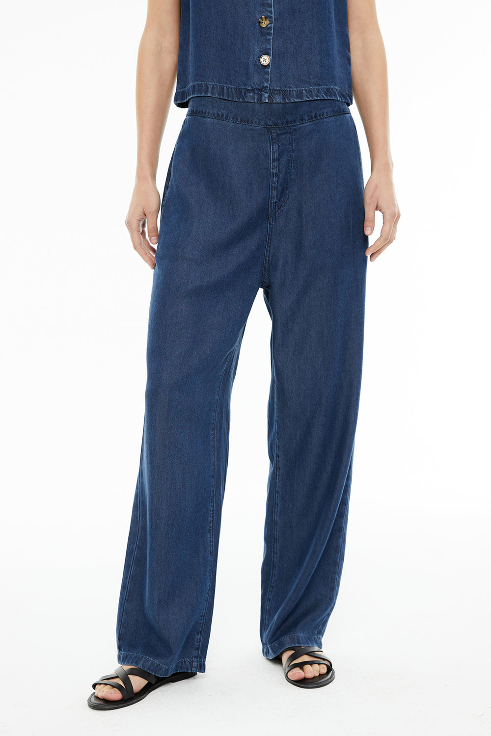 Pantalón de mujer fluido y recto efecto denim con bolsillos en el delantero y goma en la cinturilla. Prenda sostenible.