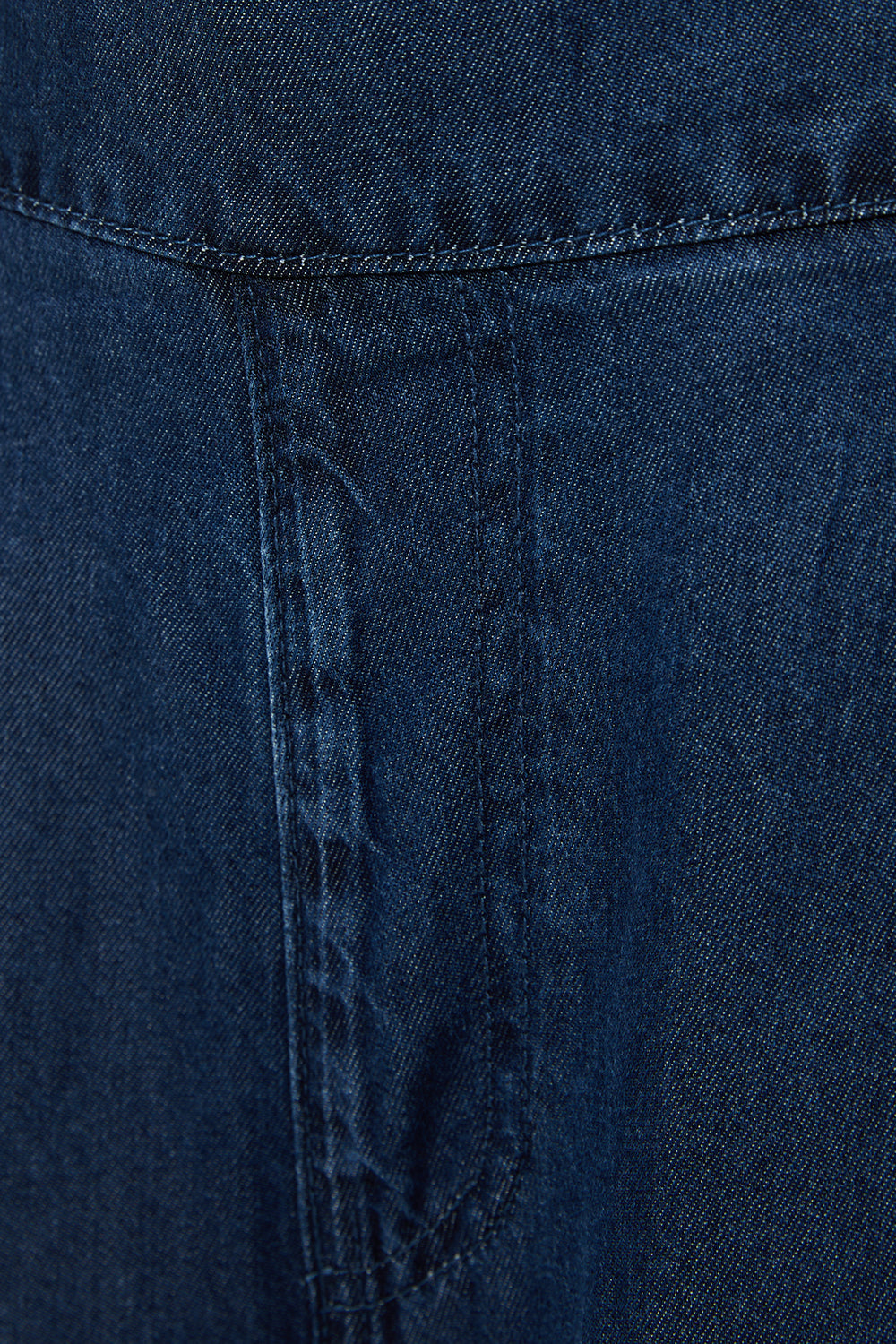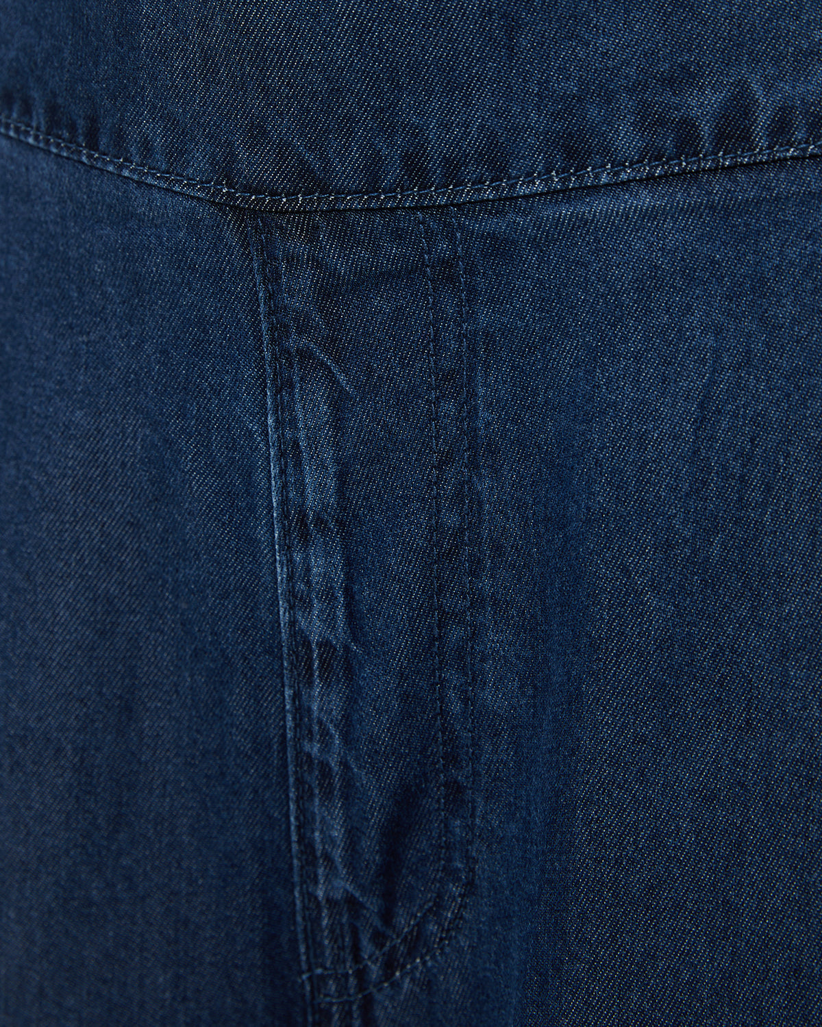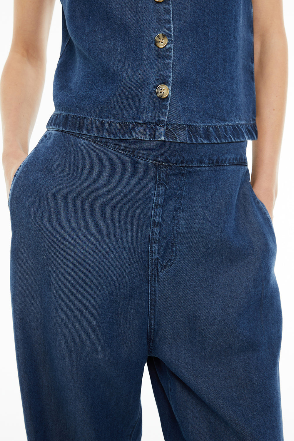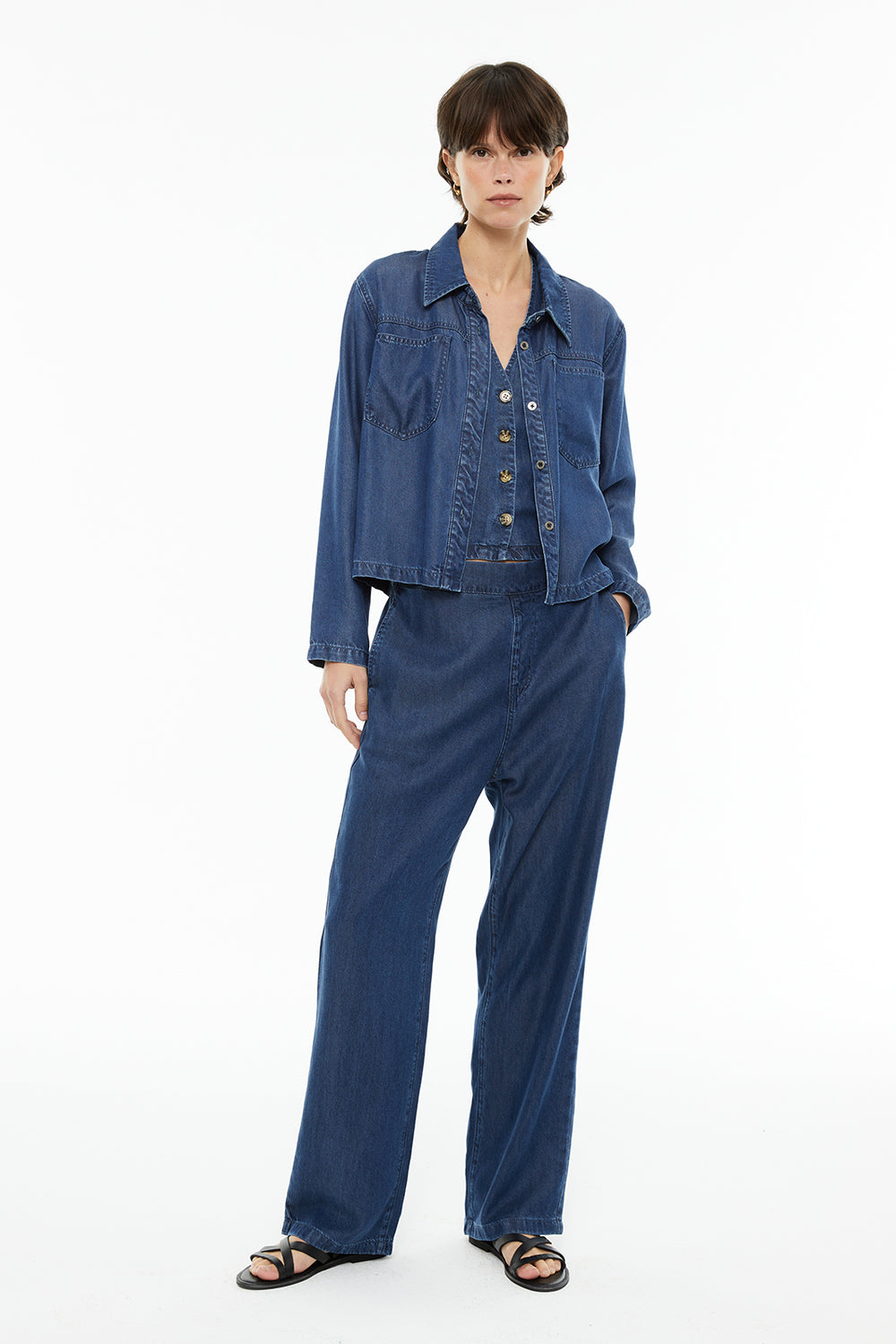 Pantalón de mujer fluido y recto efecto denim con bolsillos en el delantero y goma en la cinturilla. Prenda sostenible.
