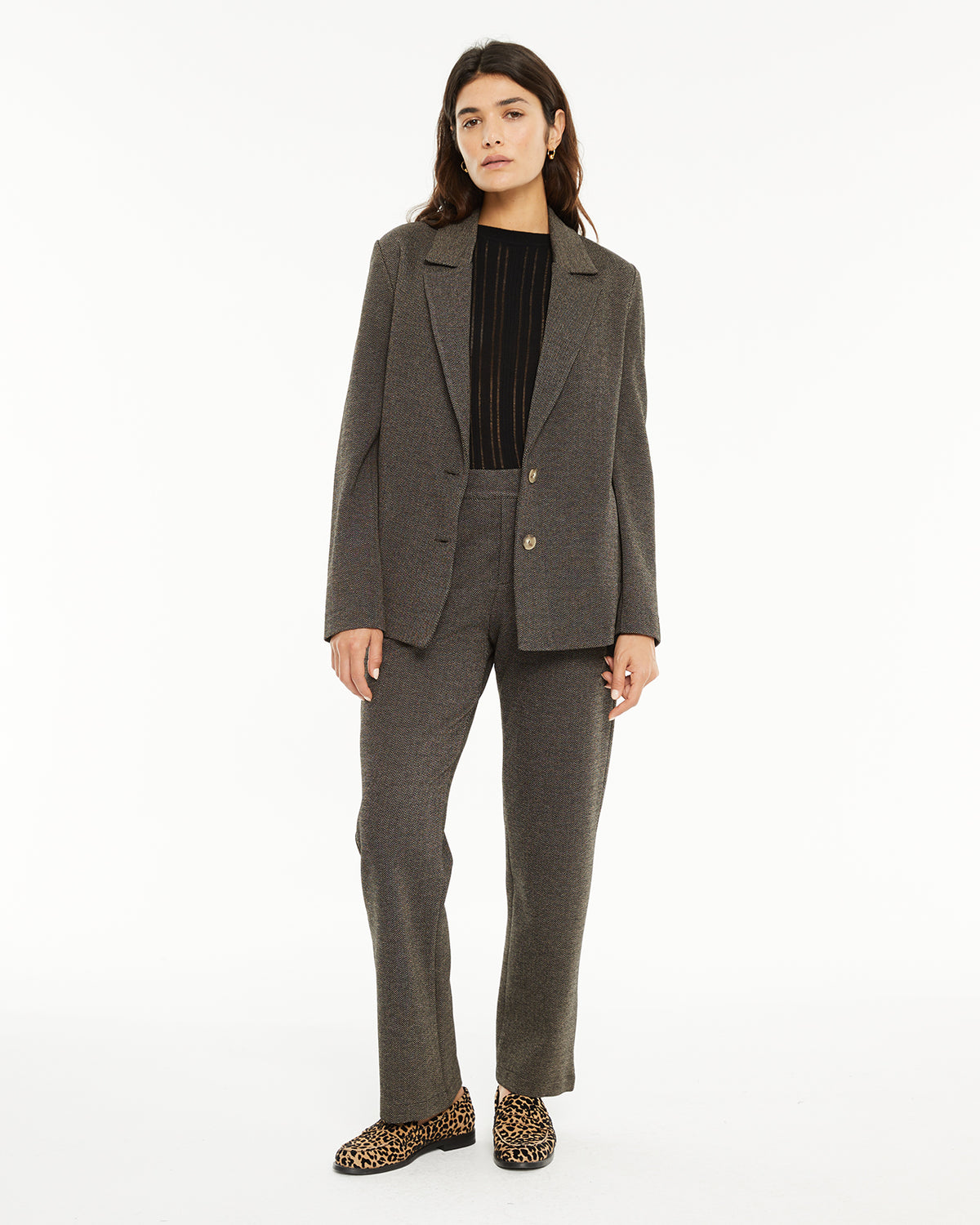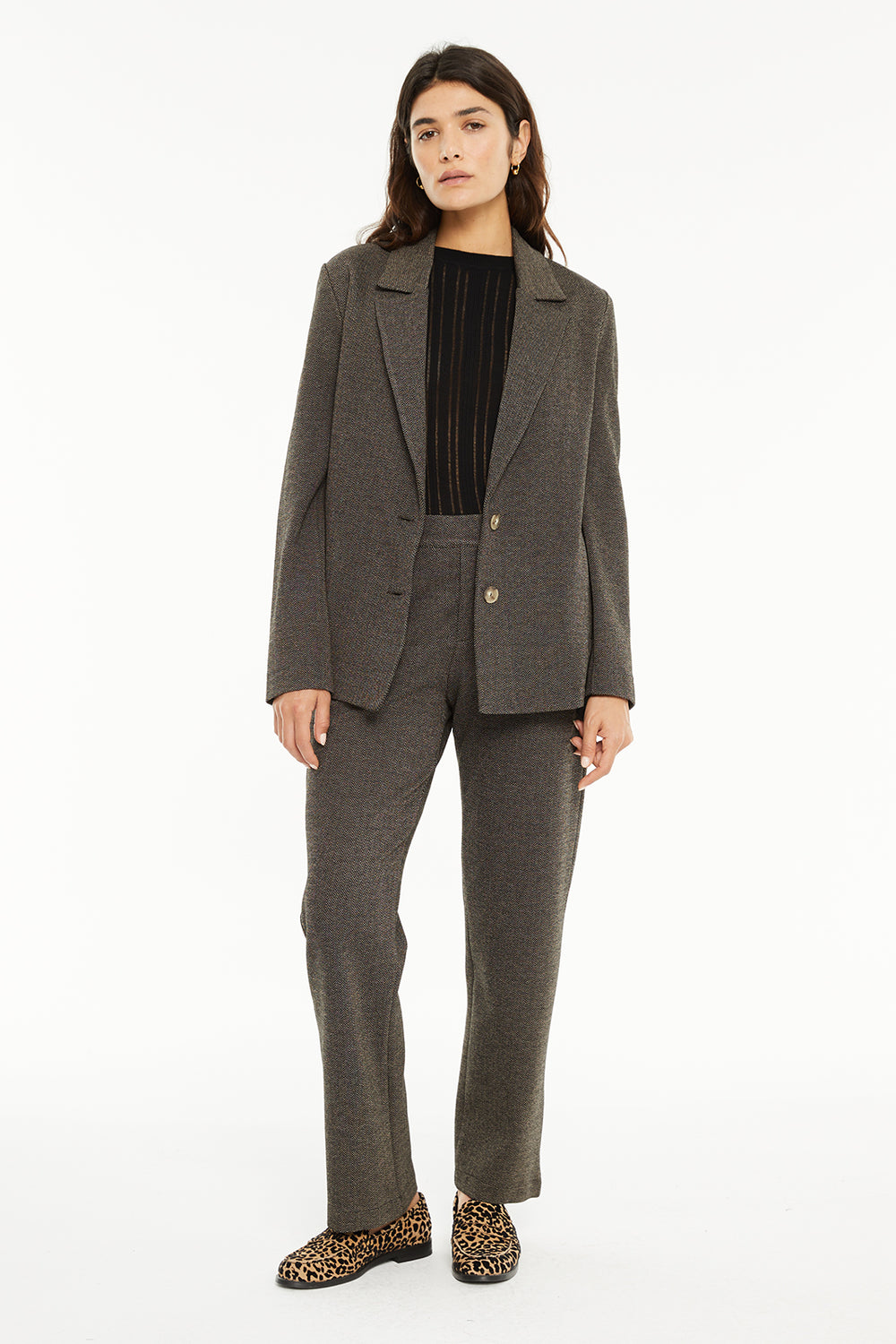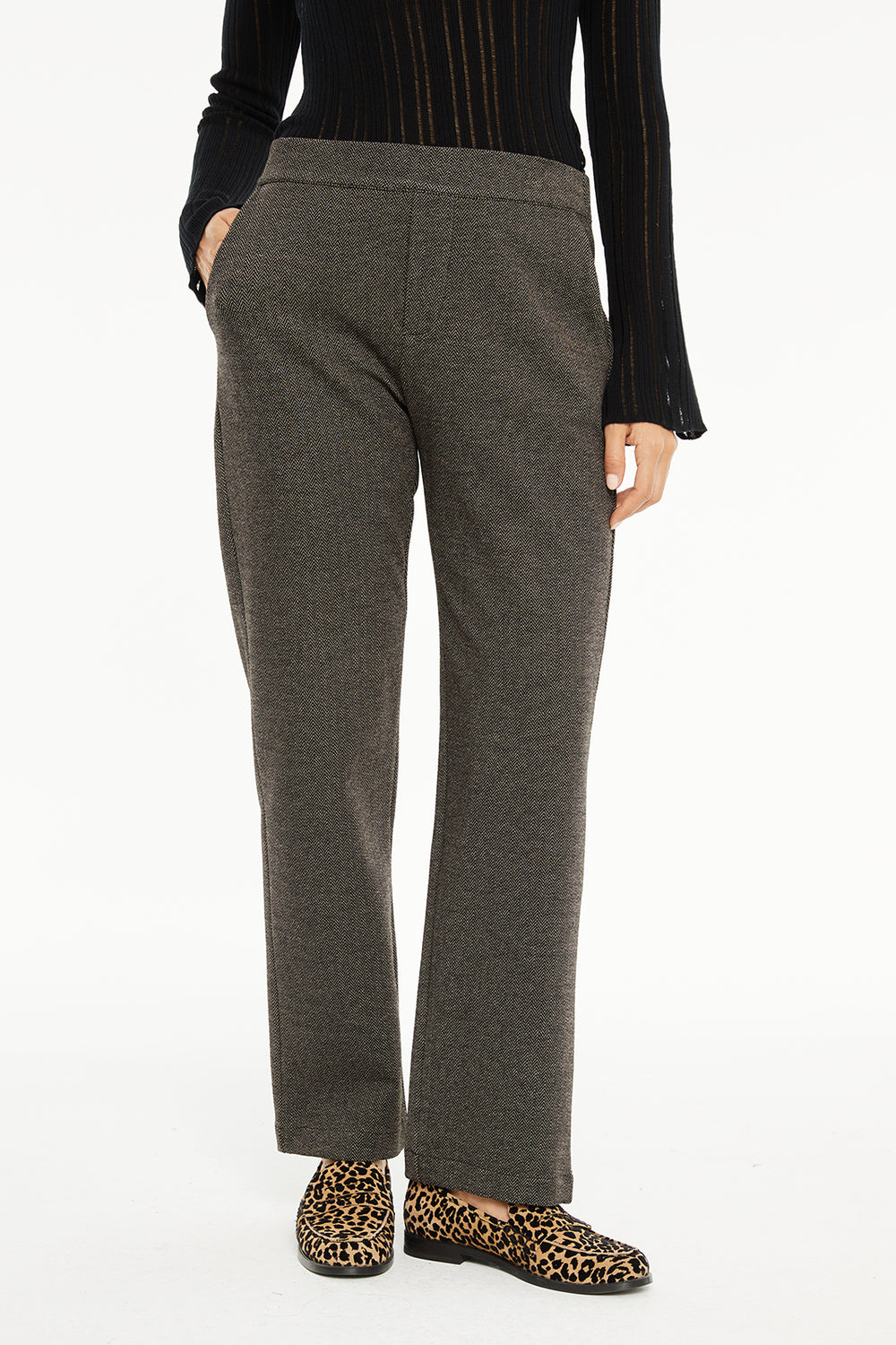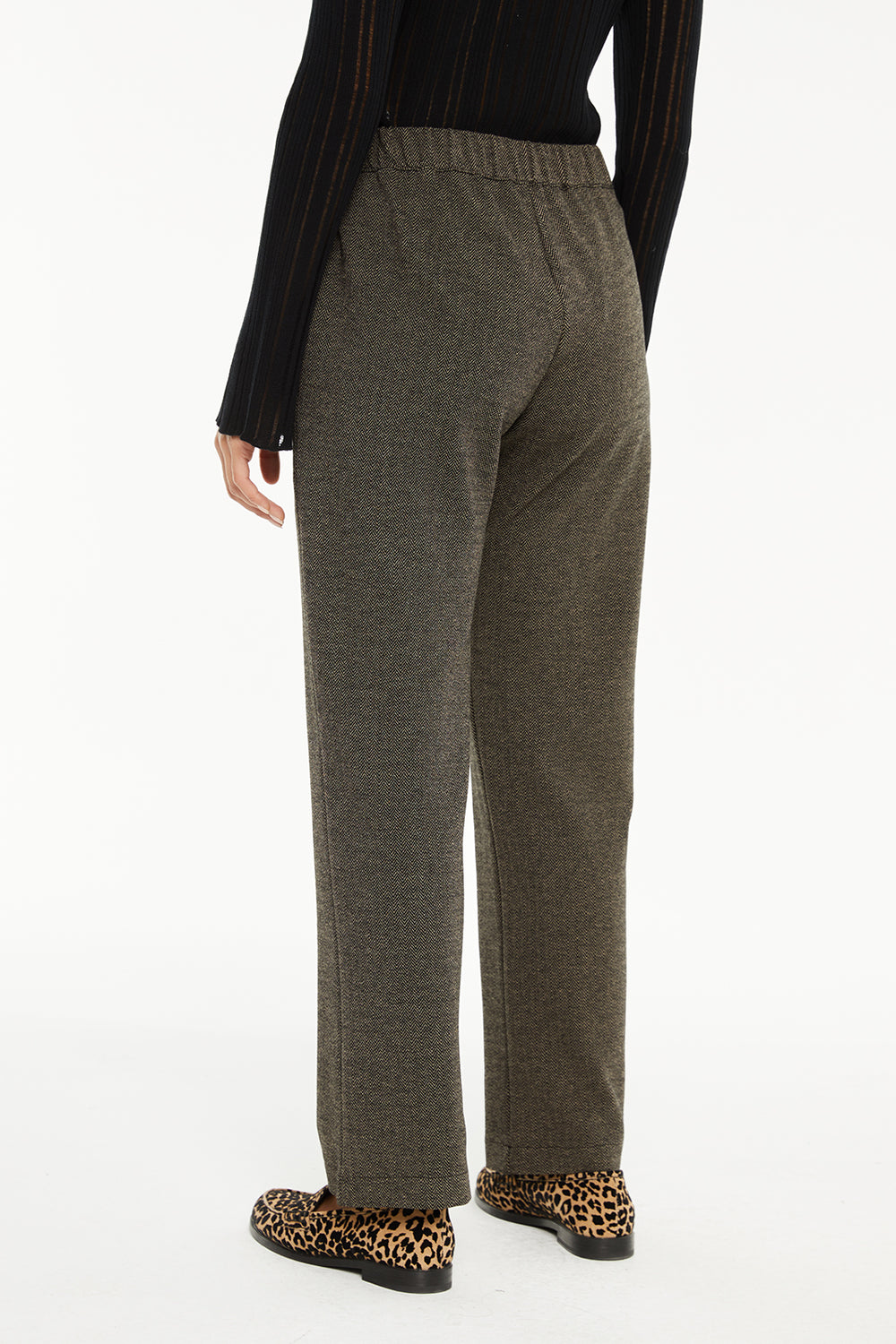 Pantalón de mujer con goma en la cintura, tejido jacquard de espiga y bolsillos laterales.
