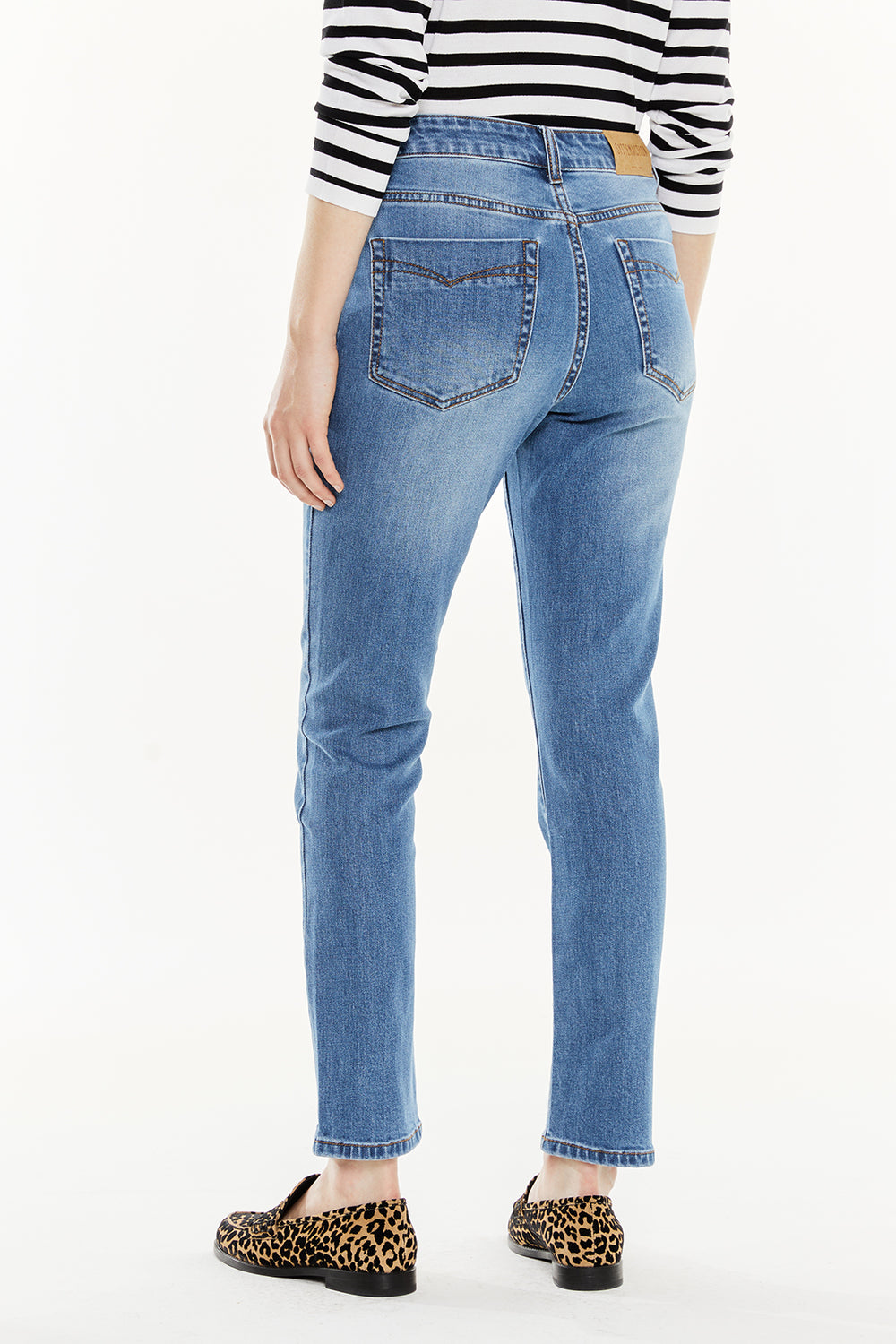 Pantalón denim de mujer de cinco bolsillos, entallado y en color azul.