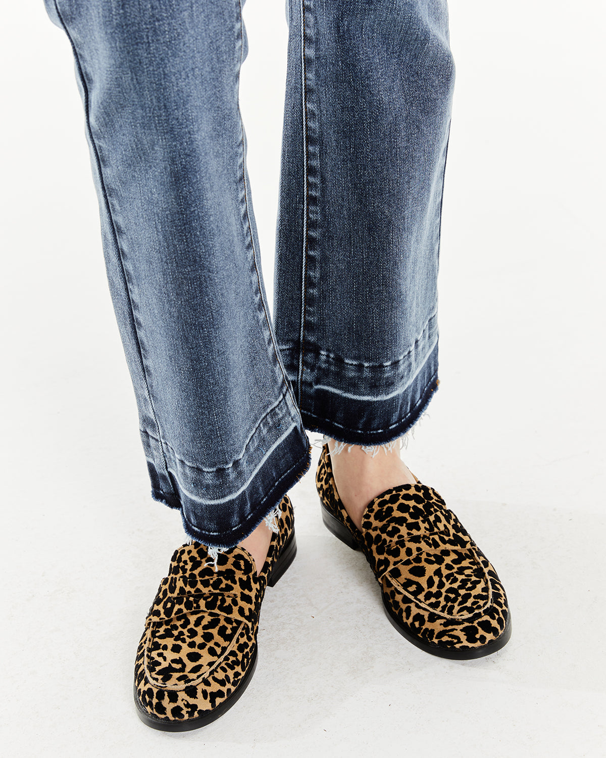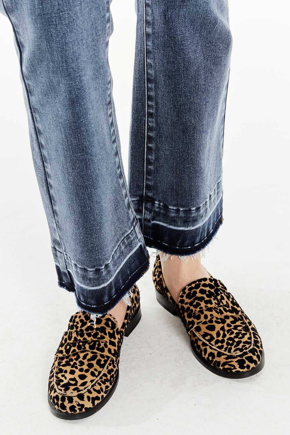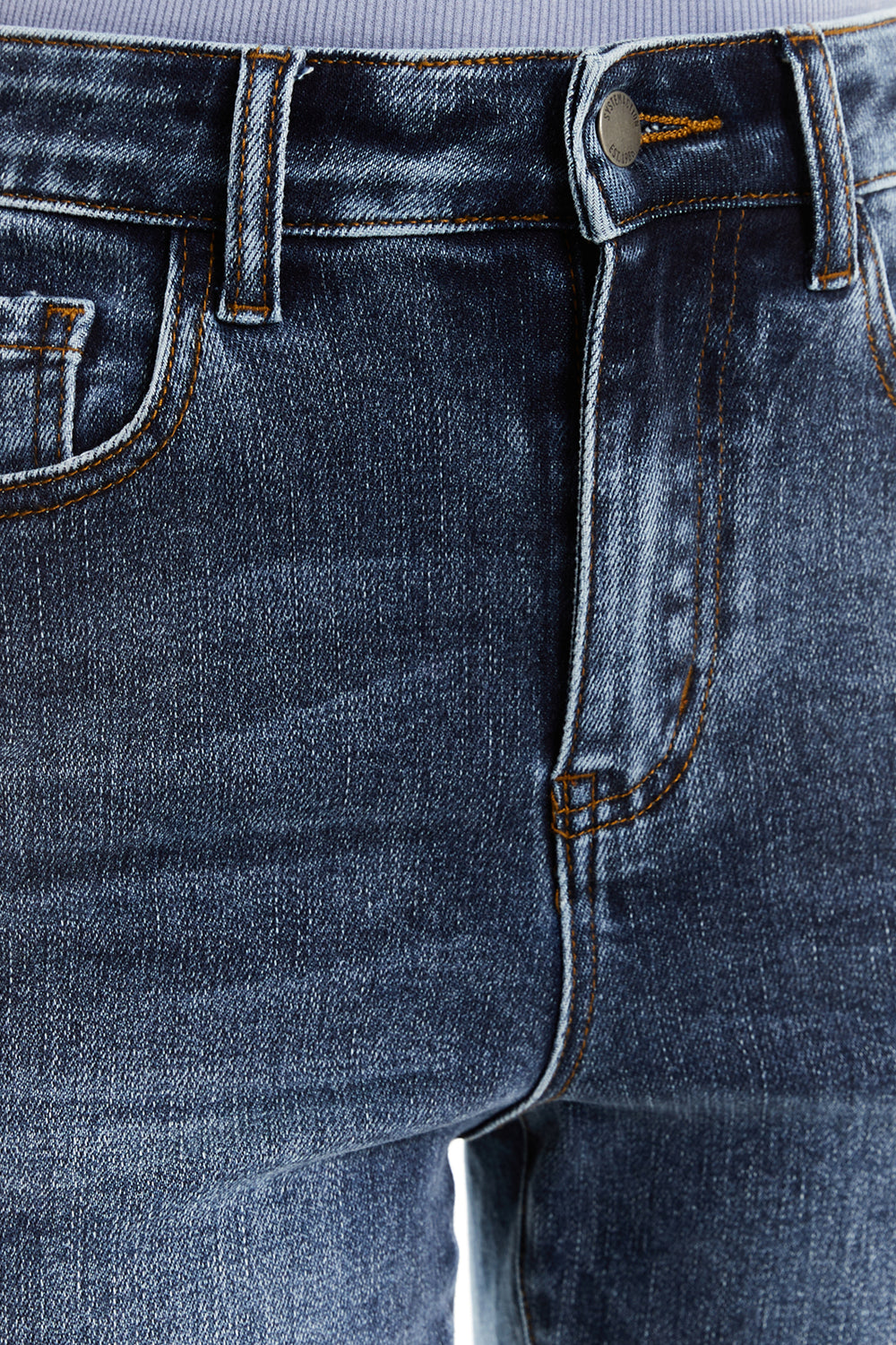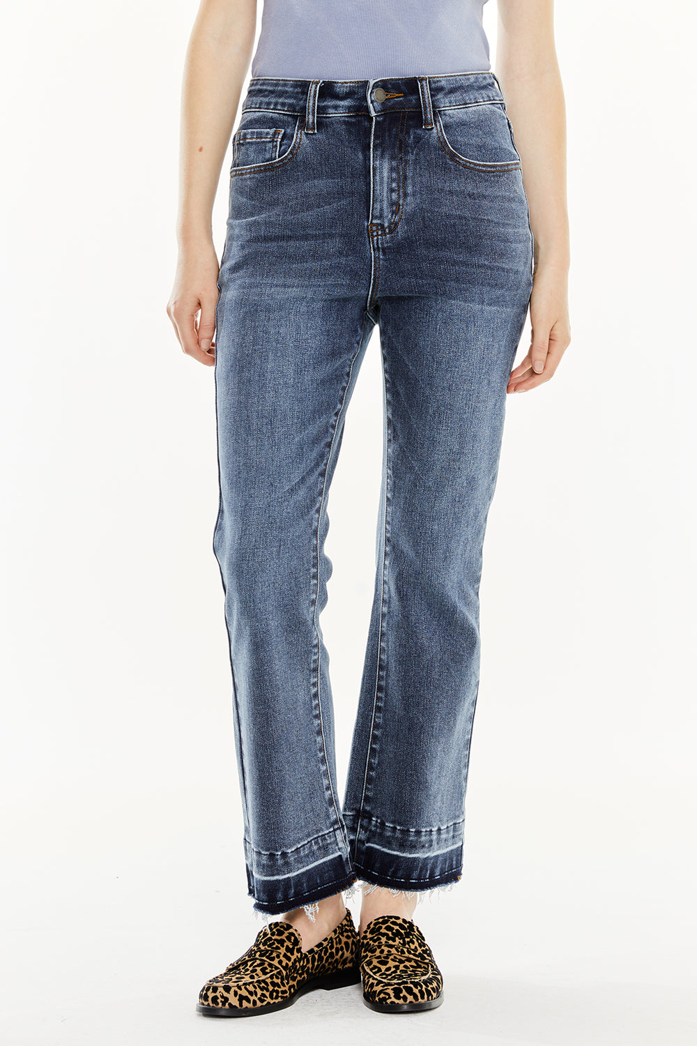 Pantalón denim de mujer tipo flare, con cierre de botón.