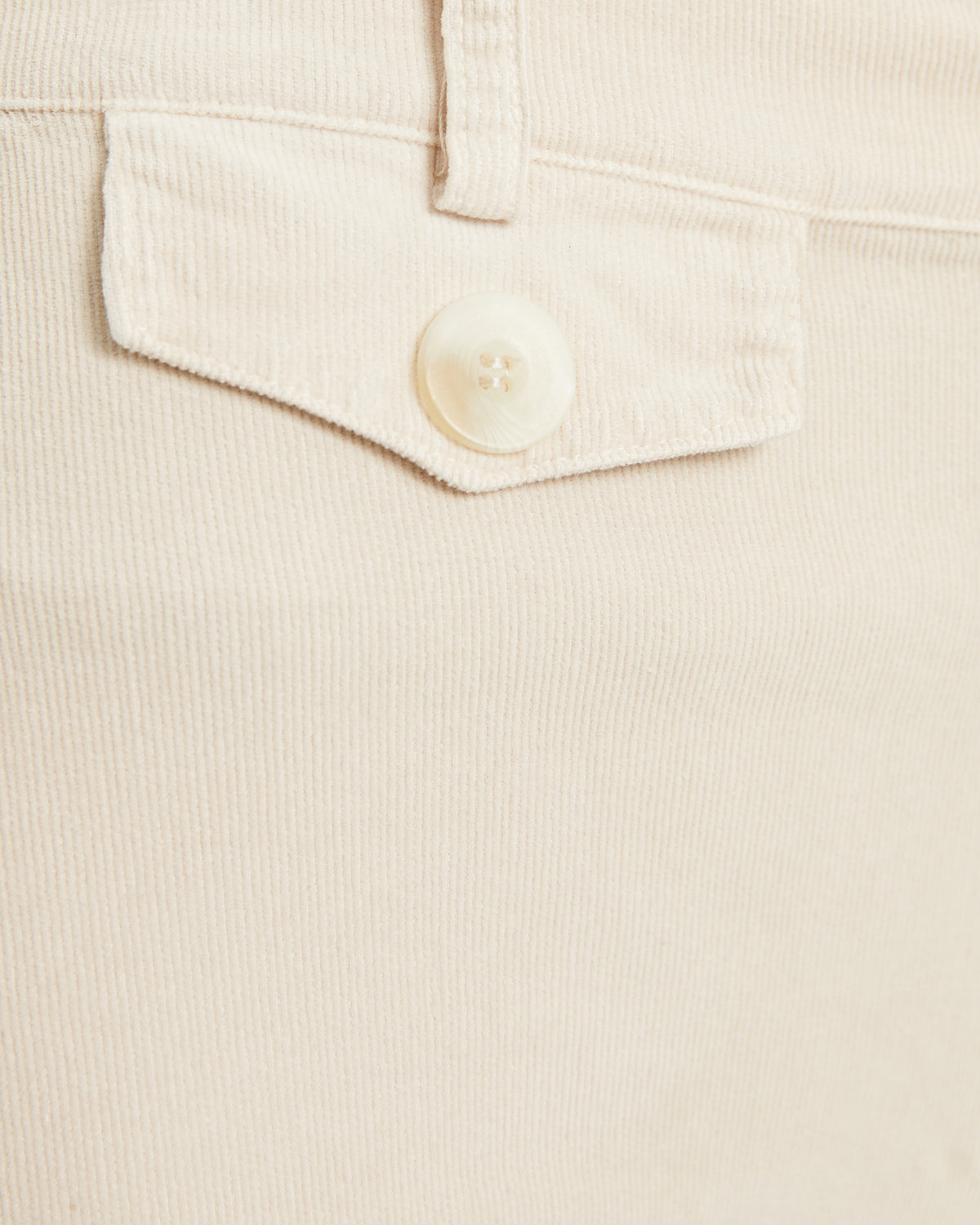 Pantalón de mujer con tejido de micropana, detalle de bolsillos con tapeta y botón en el delantero. Cierre con botón. Prenda sostenible.