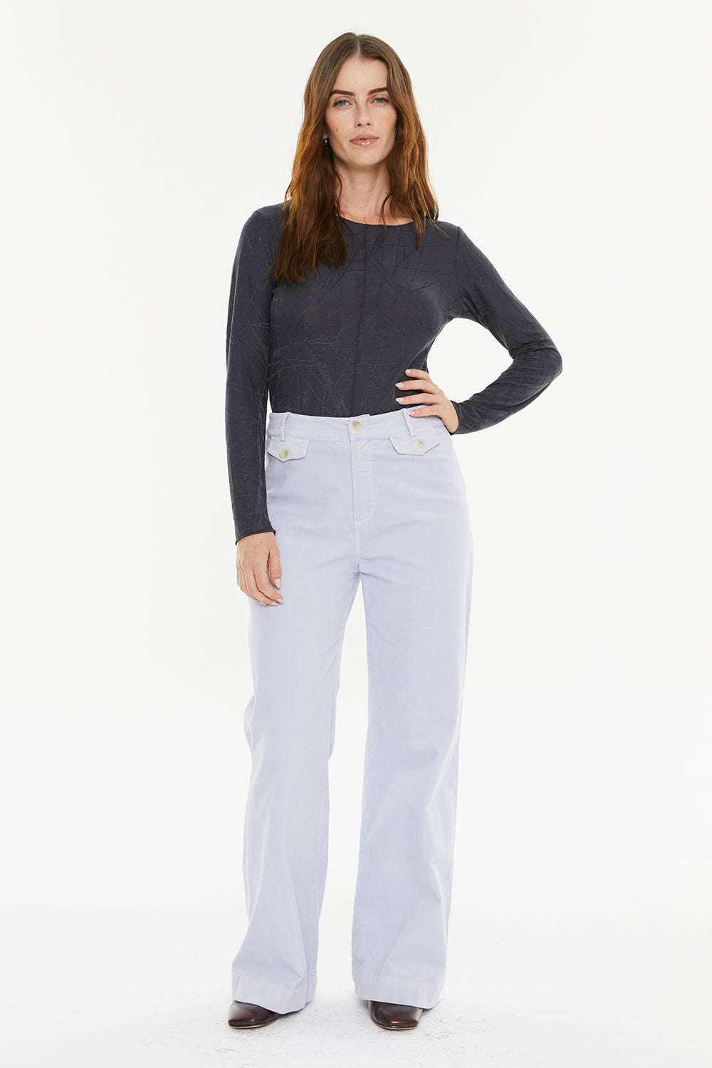 Pantalón de mujer con tejido de micropana, detalle de bolsillos con tapeta y botón en el delantero. Cierre con botón. Prenda sostenible.