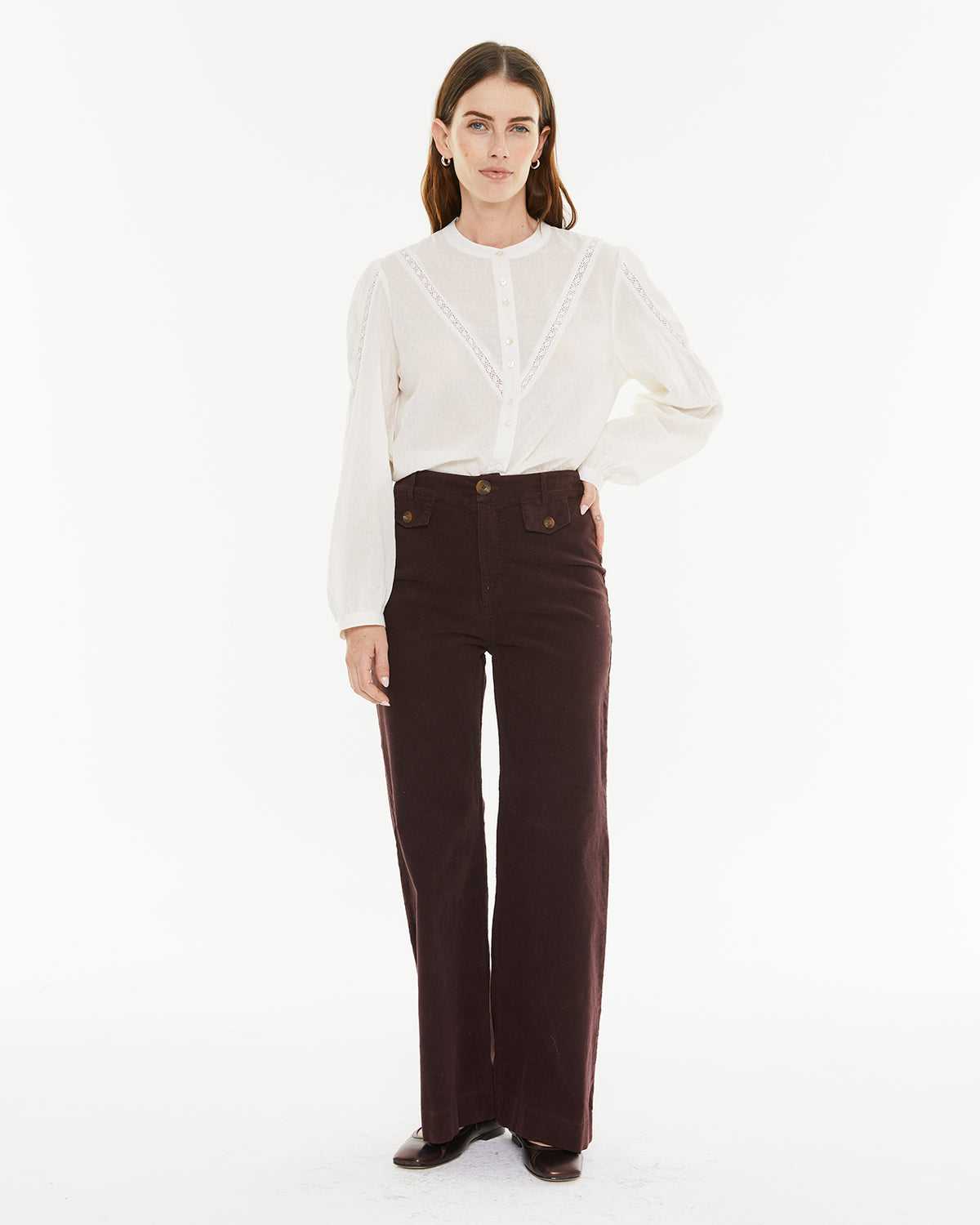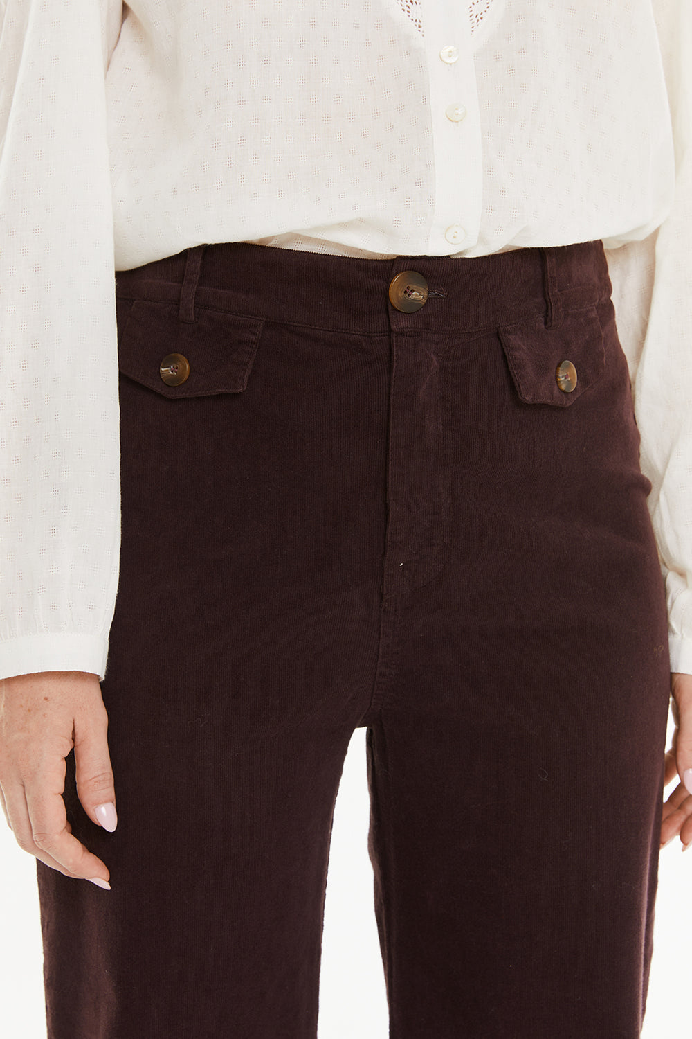 Pantalón de mujer con tejido de micropana, detalle de bolsillos con tapeta y botón en el delantero. Cierre con botón. Prenda sostenible.