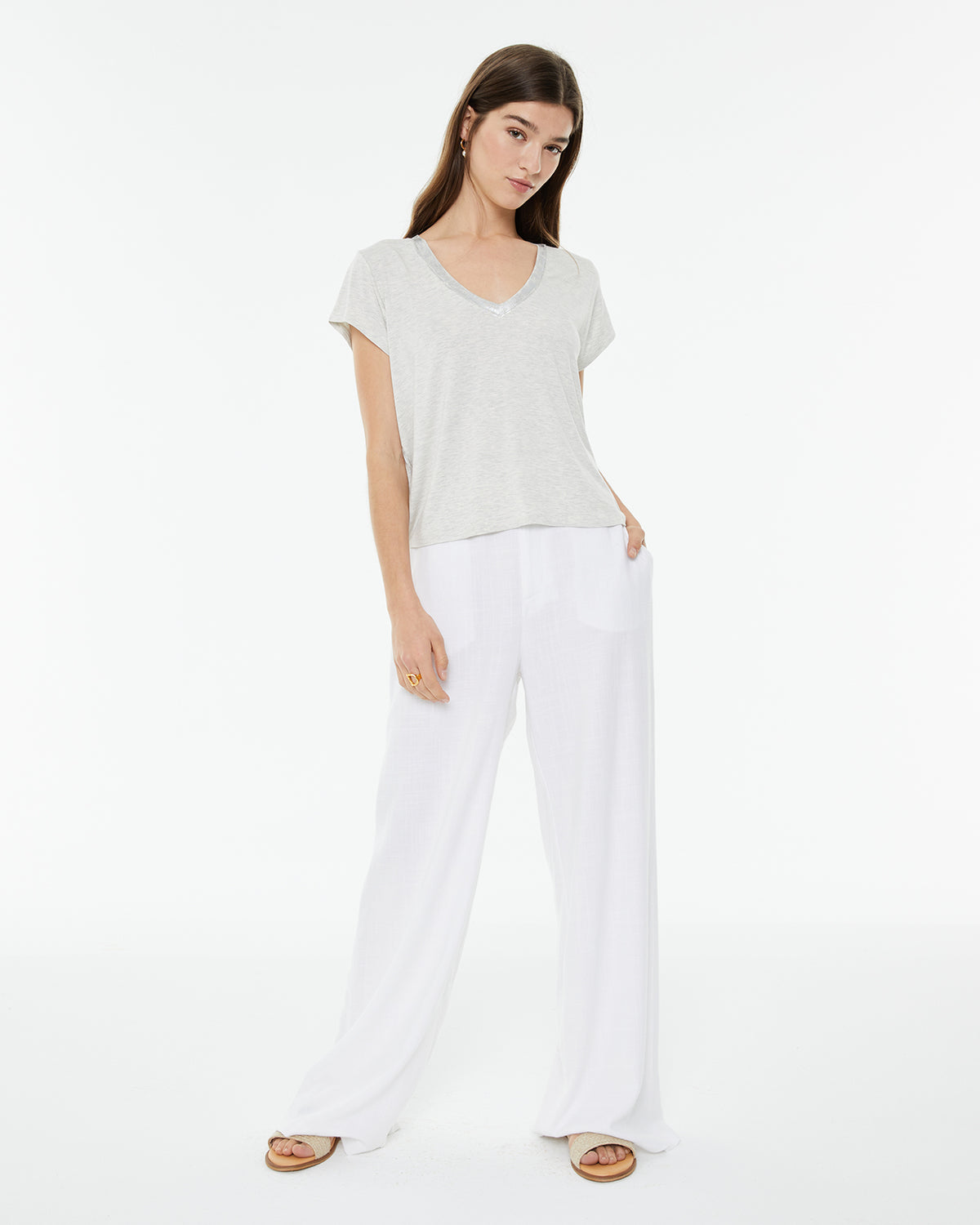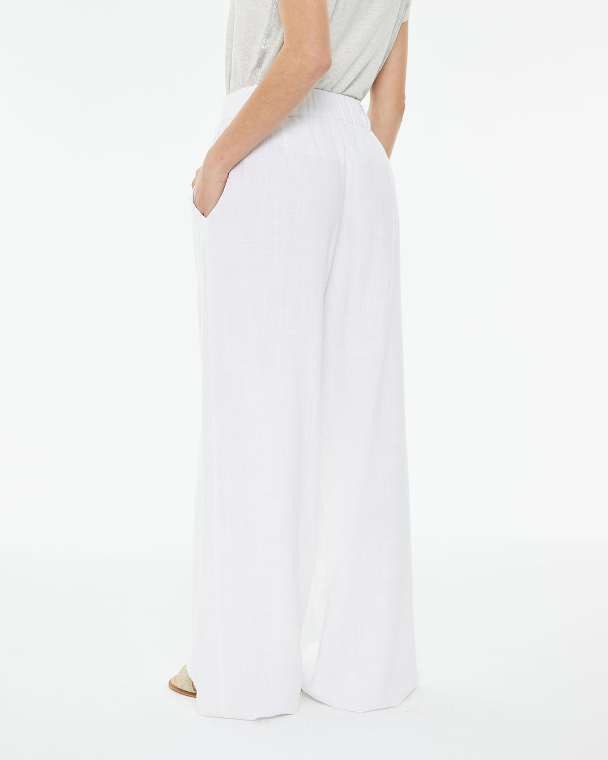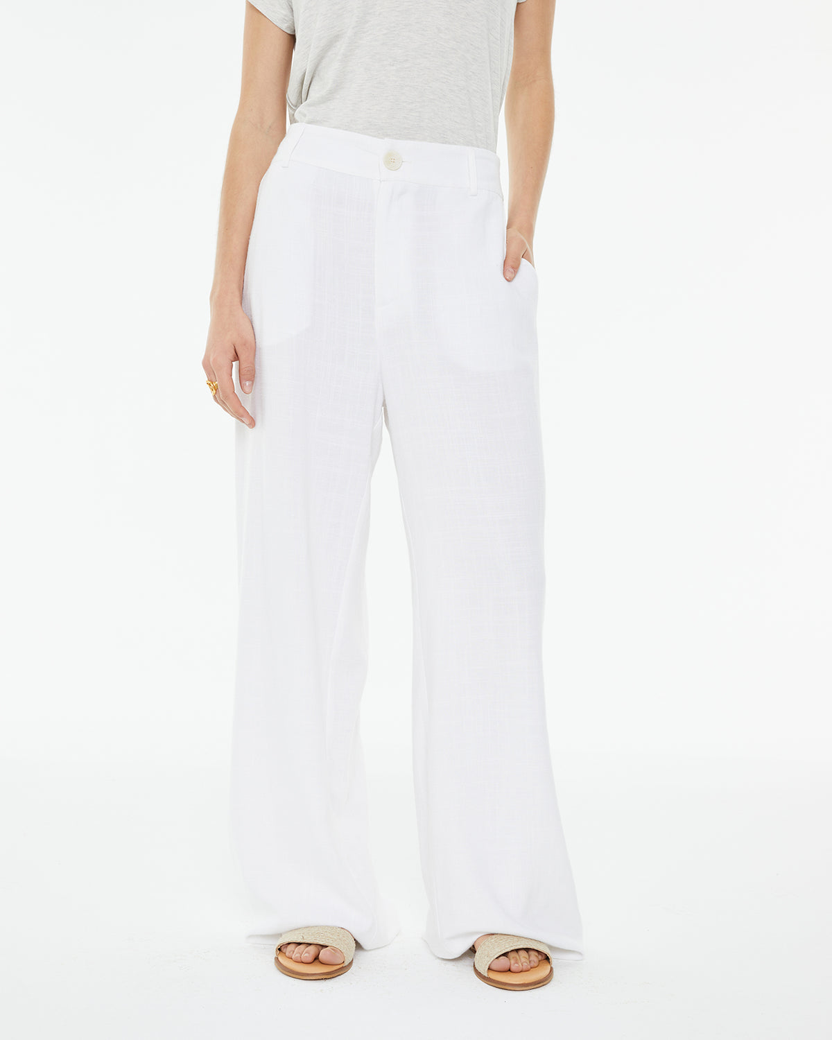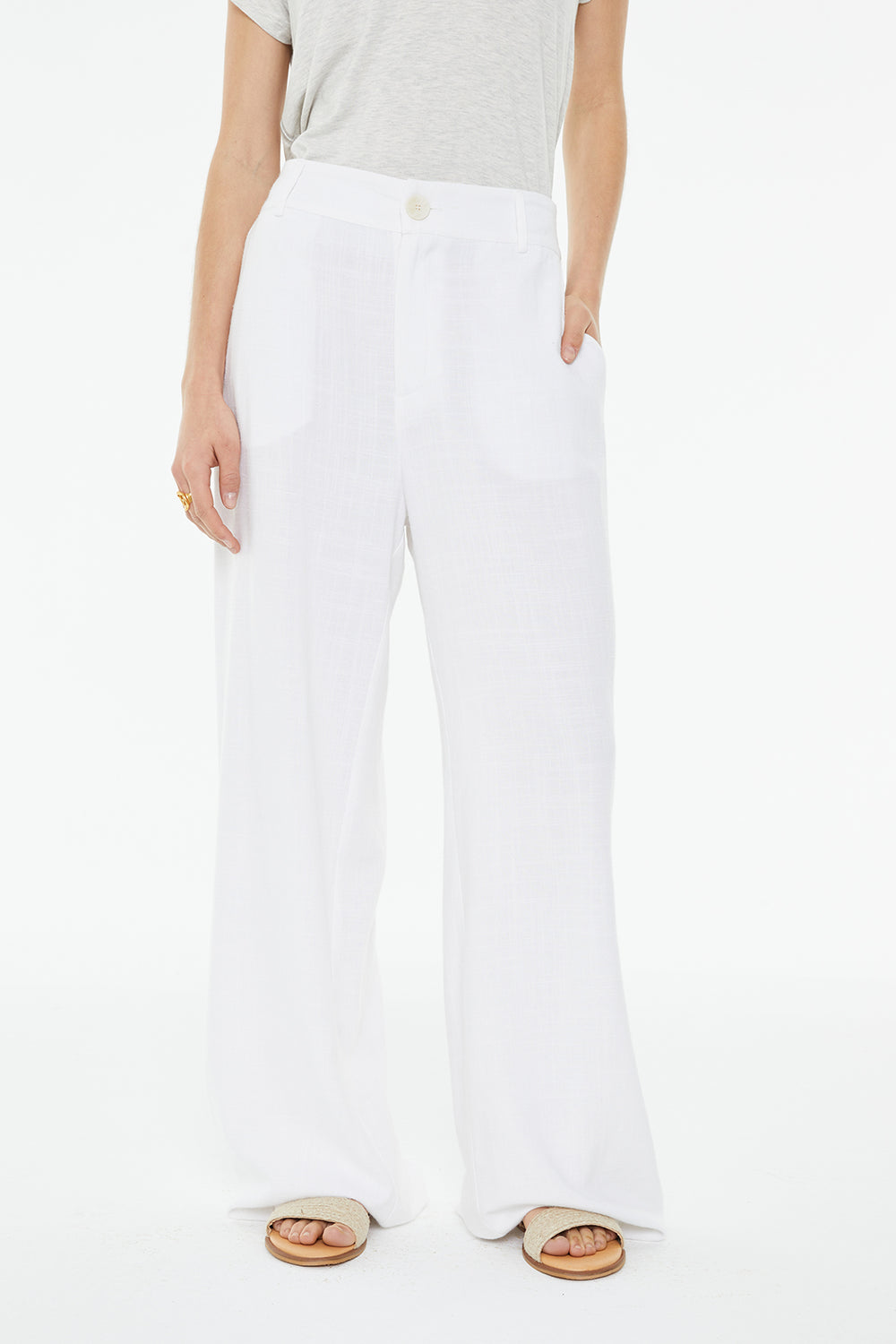 Pantalón mujer palazzo con cierre de botón y contiene lino.