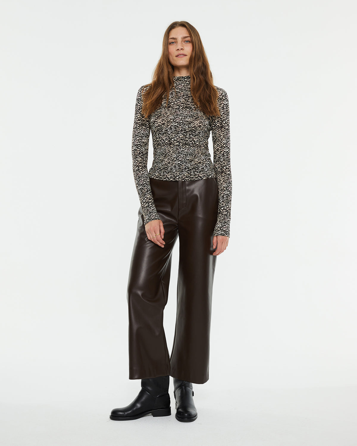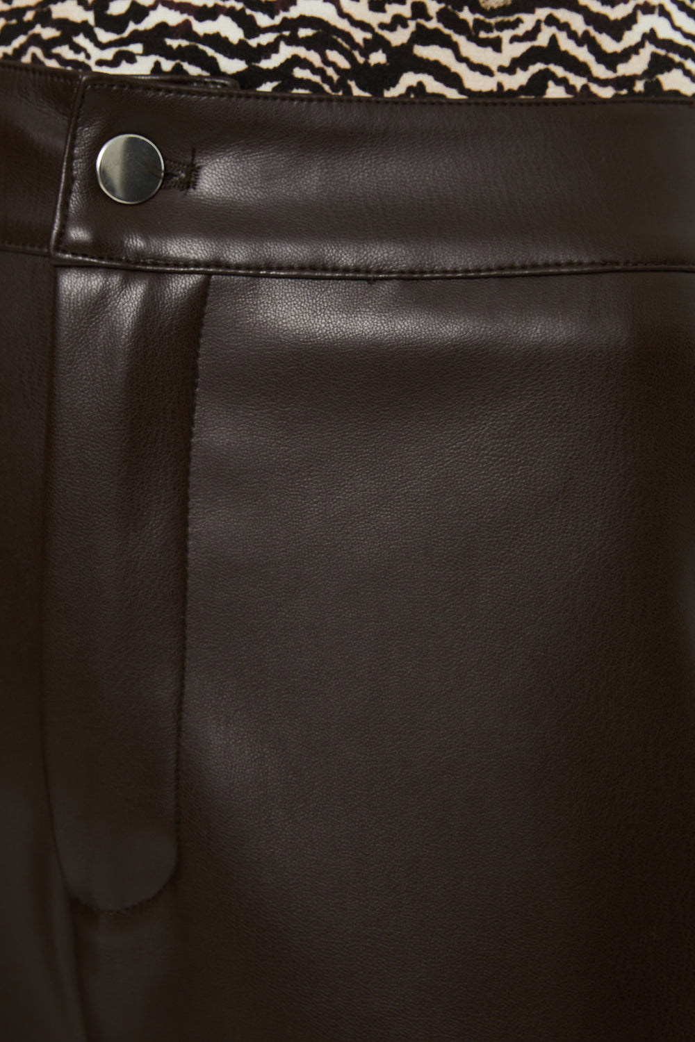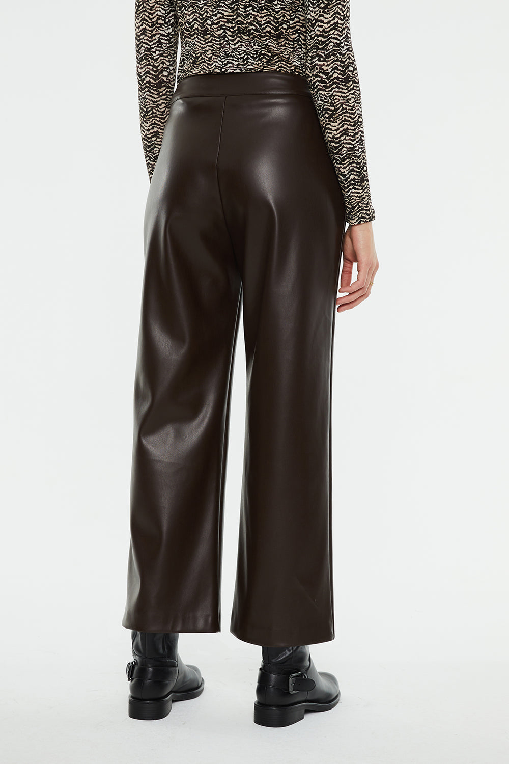 Pantalón de mujer recto efecto piel con bolsillos en el delantero y goma en la cinturilla.