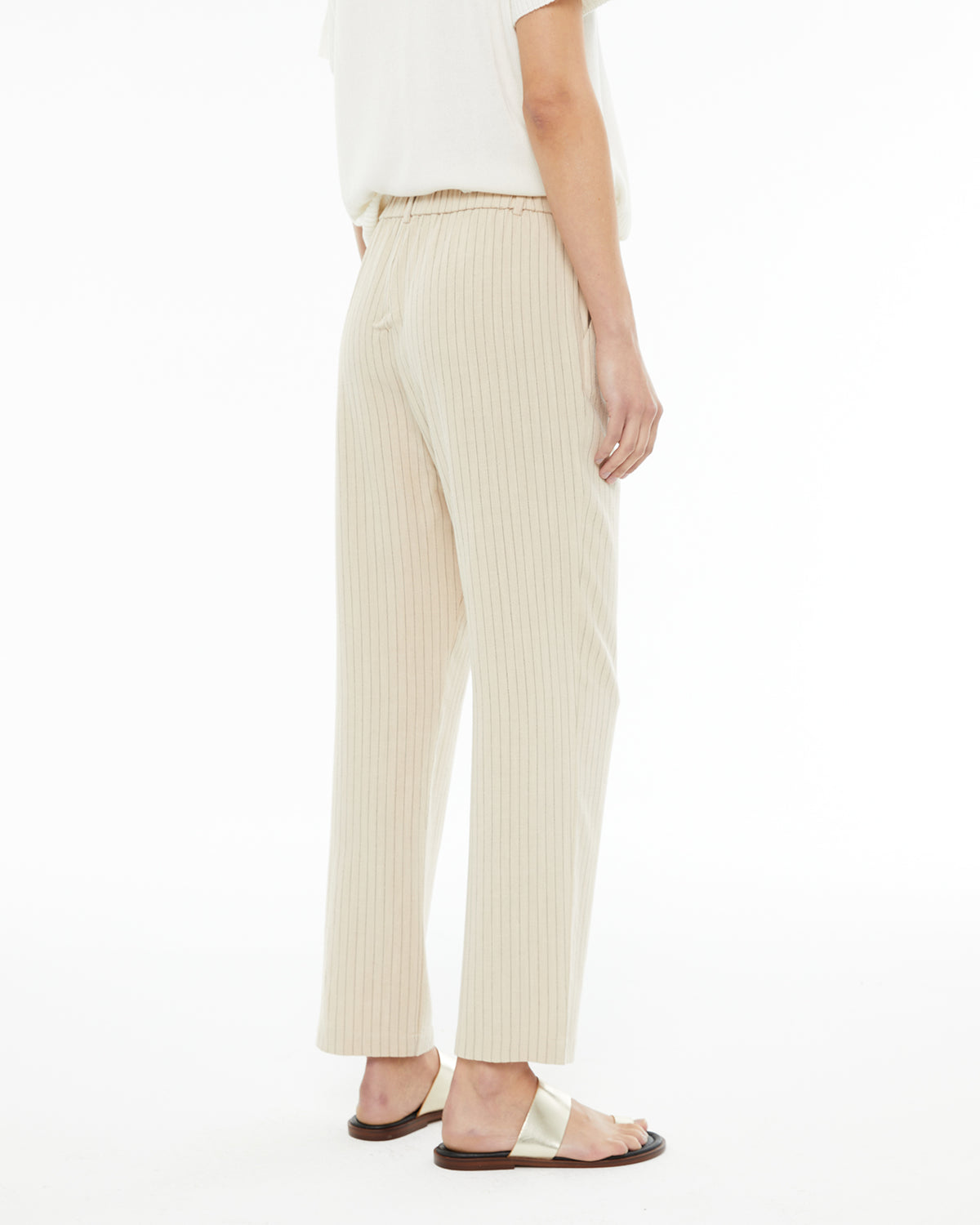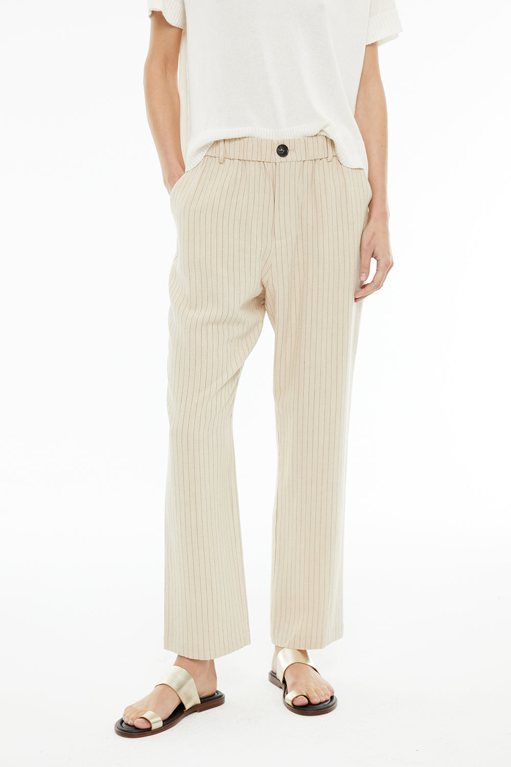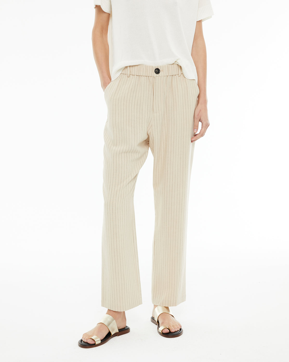Pantalón de mujer raya diplomática, recto con bolsillos laterales y goma en la cintura, cierre de botón y cremallera. Prenda sostenible.
