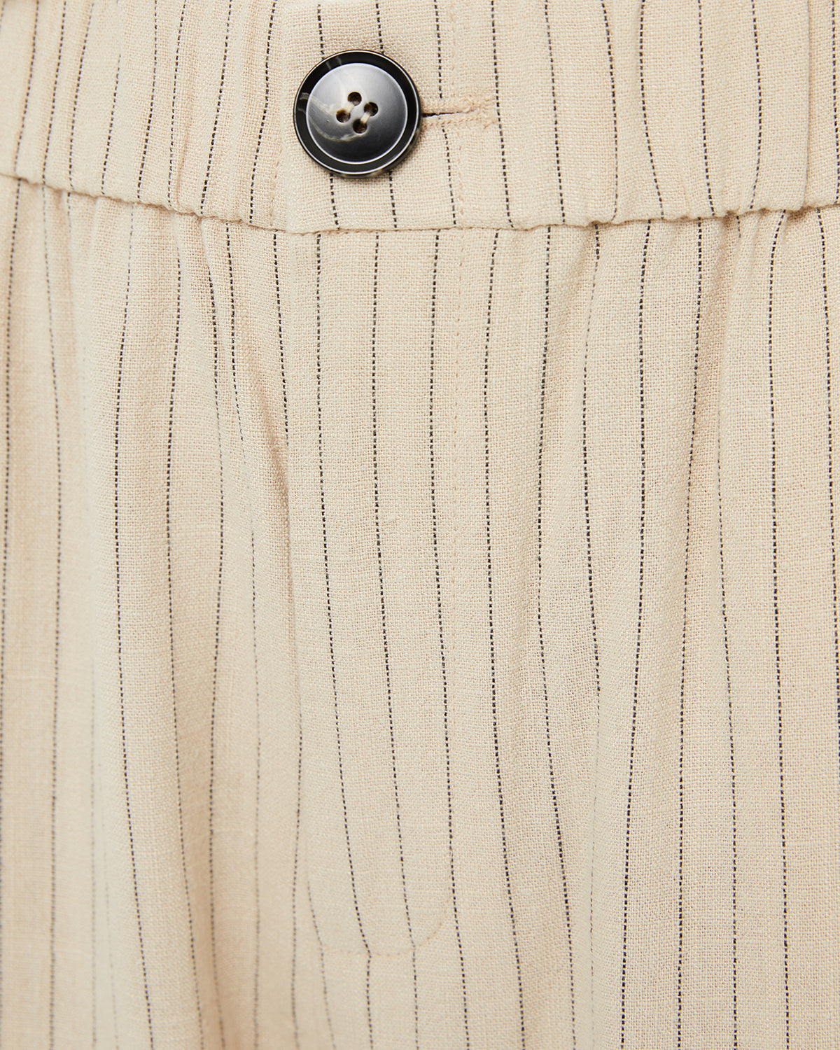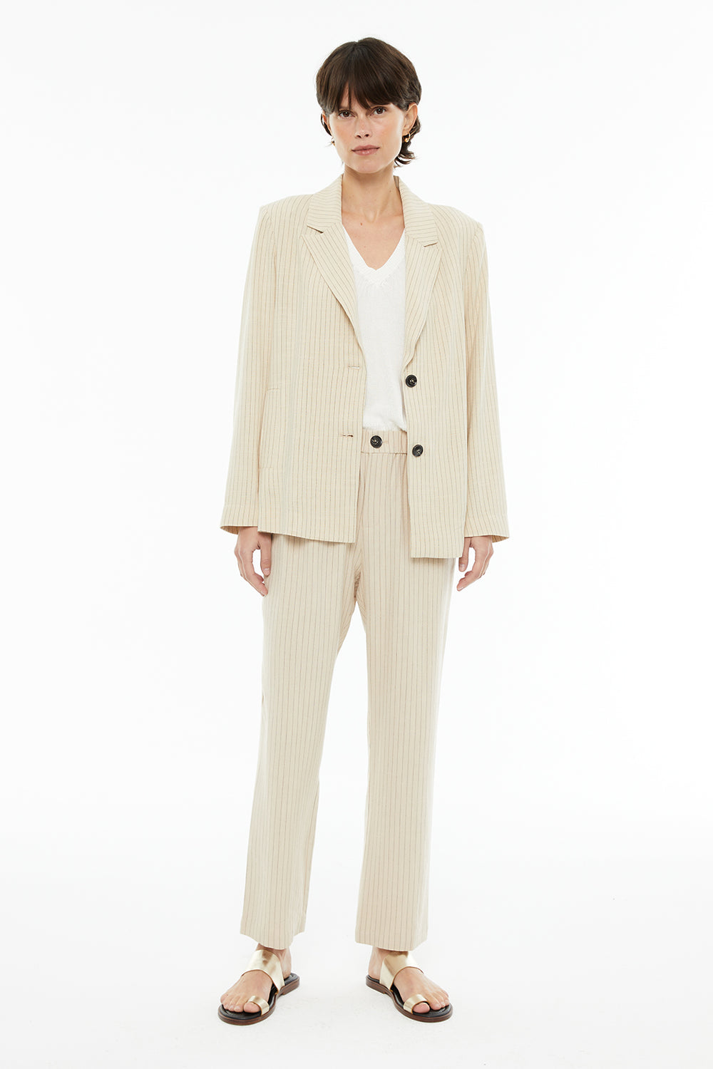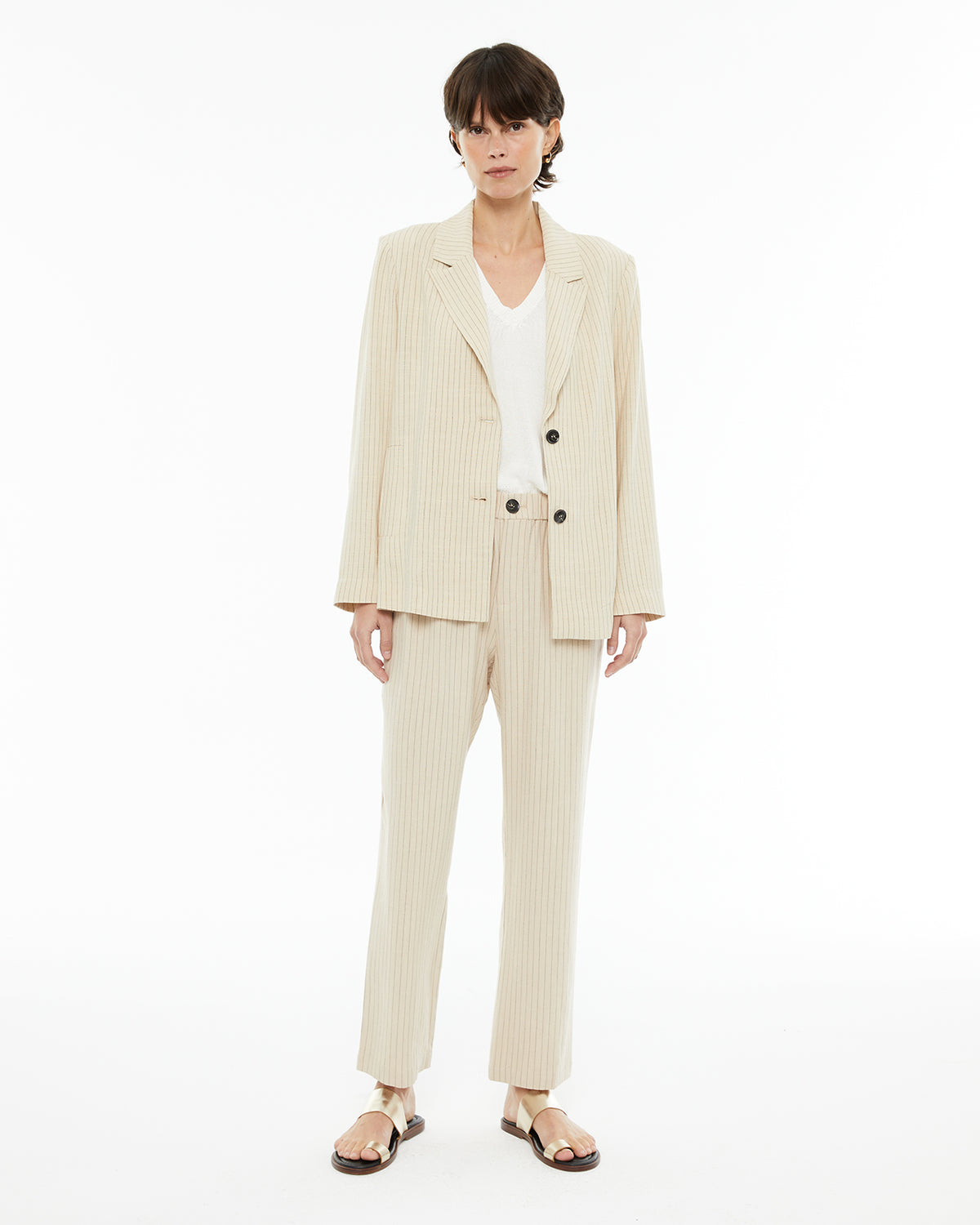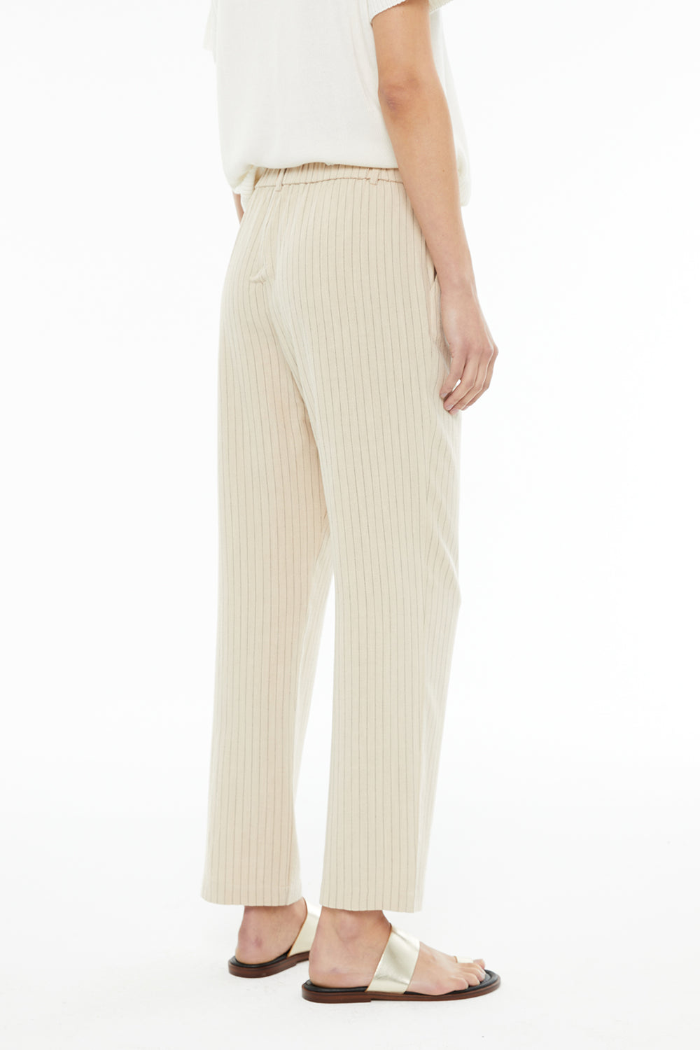 Pantalón de mujer raya diplomática, recto con bolsillos laterales y goma en la cintura, cierre de botón y cremallera. Prenda sostenible.