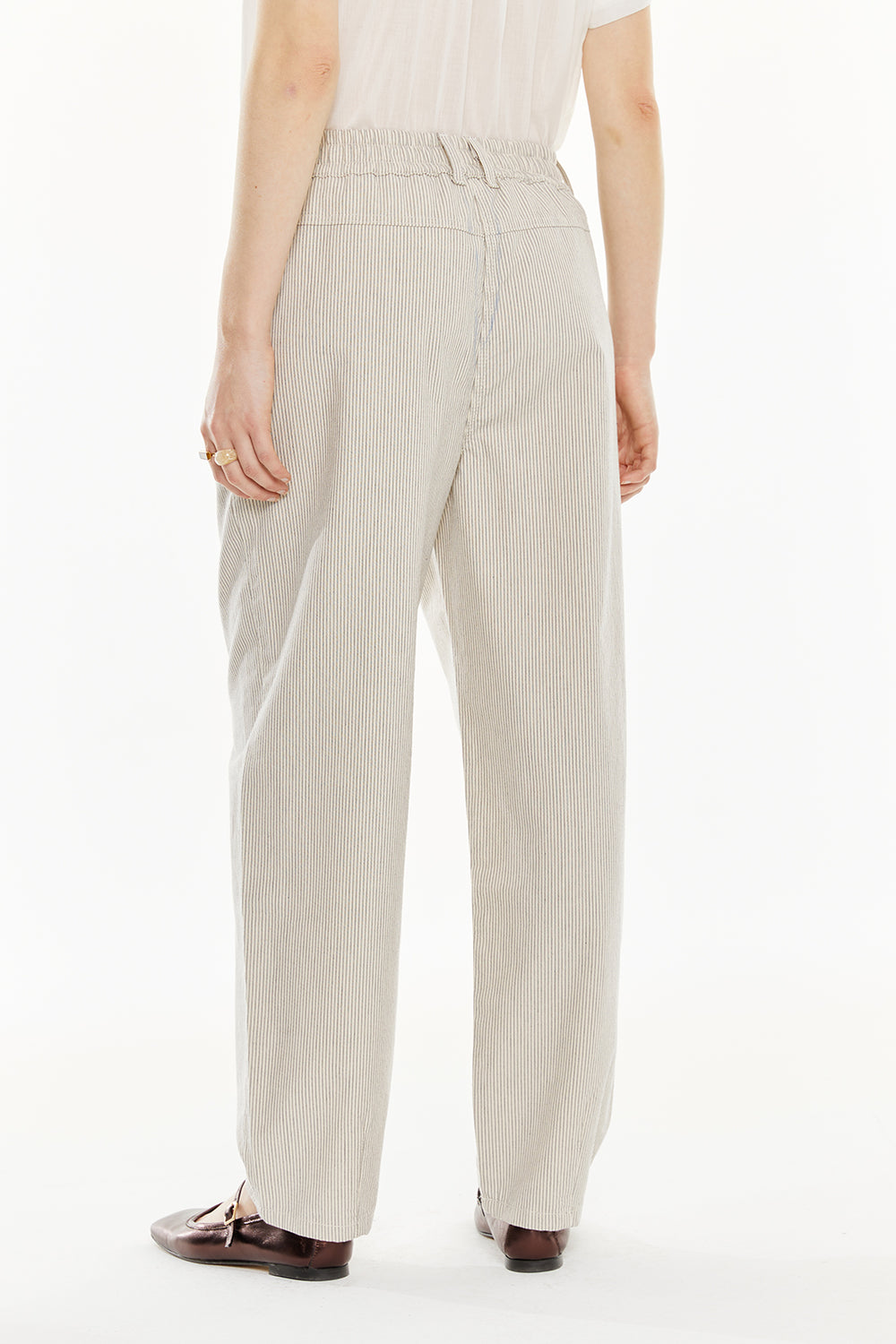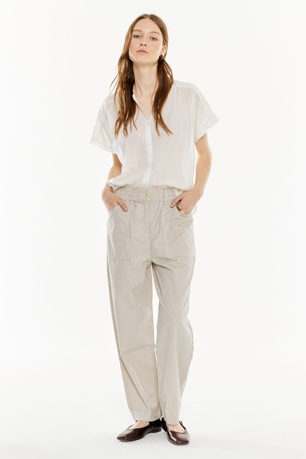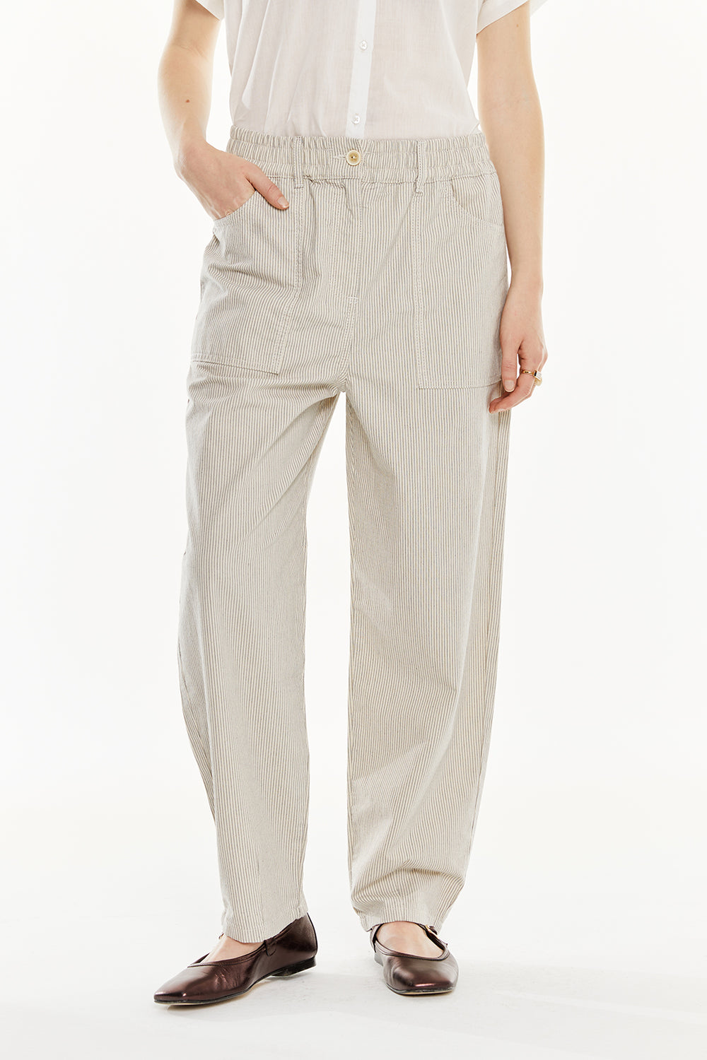 Pantalón de rayas de mujer con goma en la cintura y botón. Detalle de bolsillos grandes en el delantero.