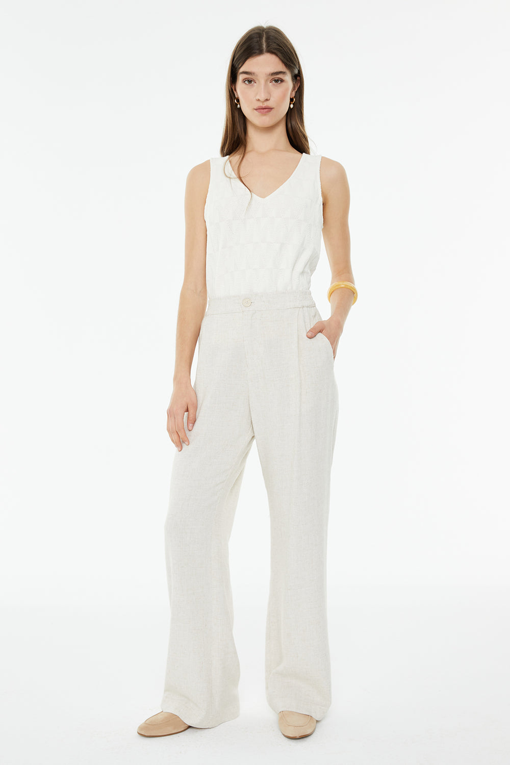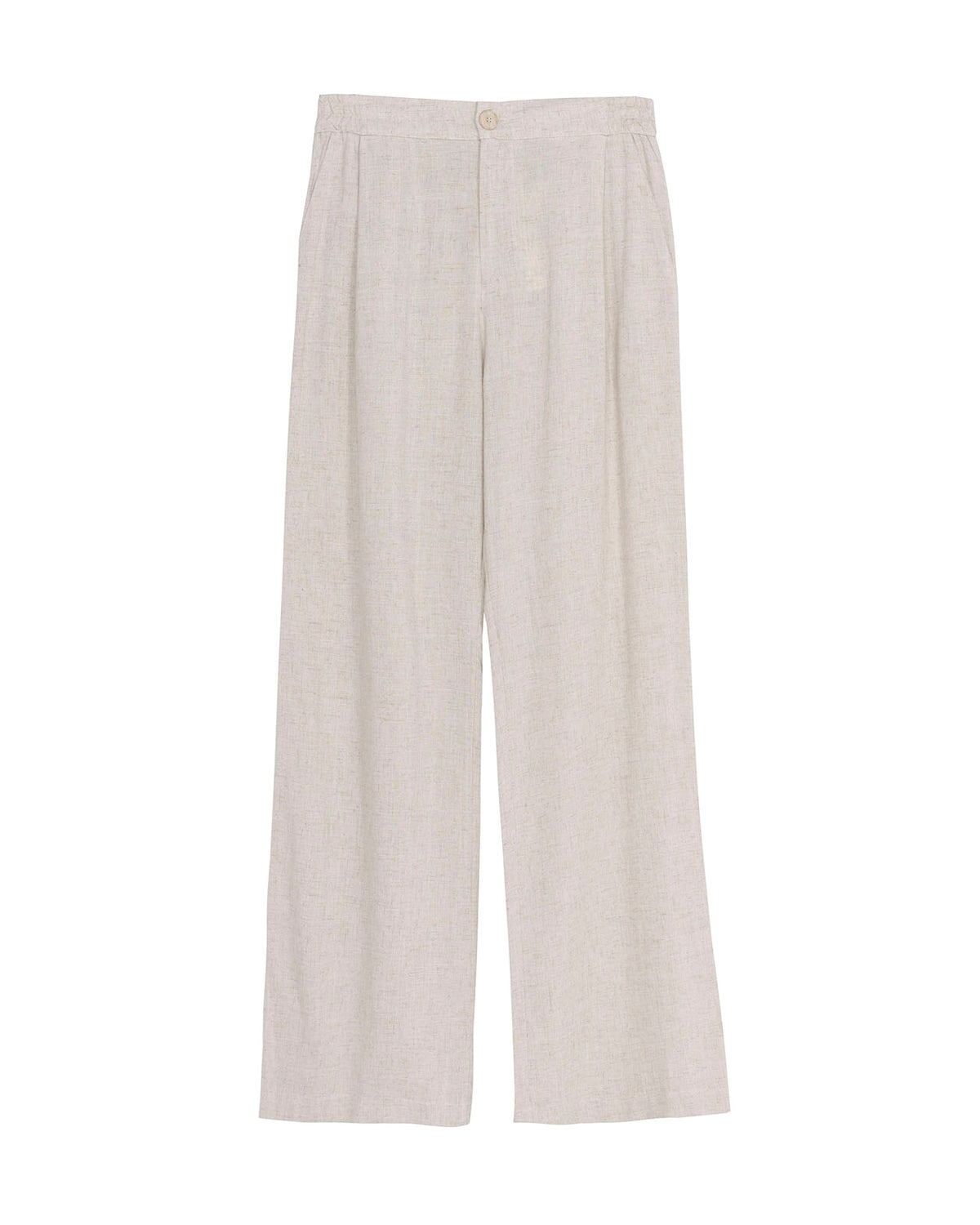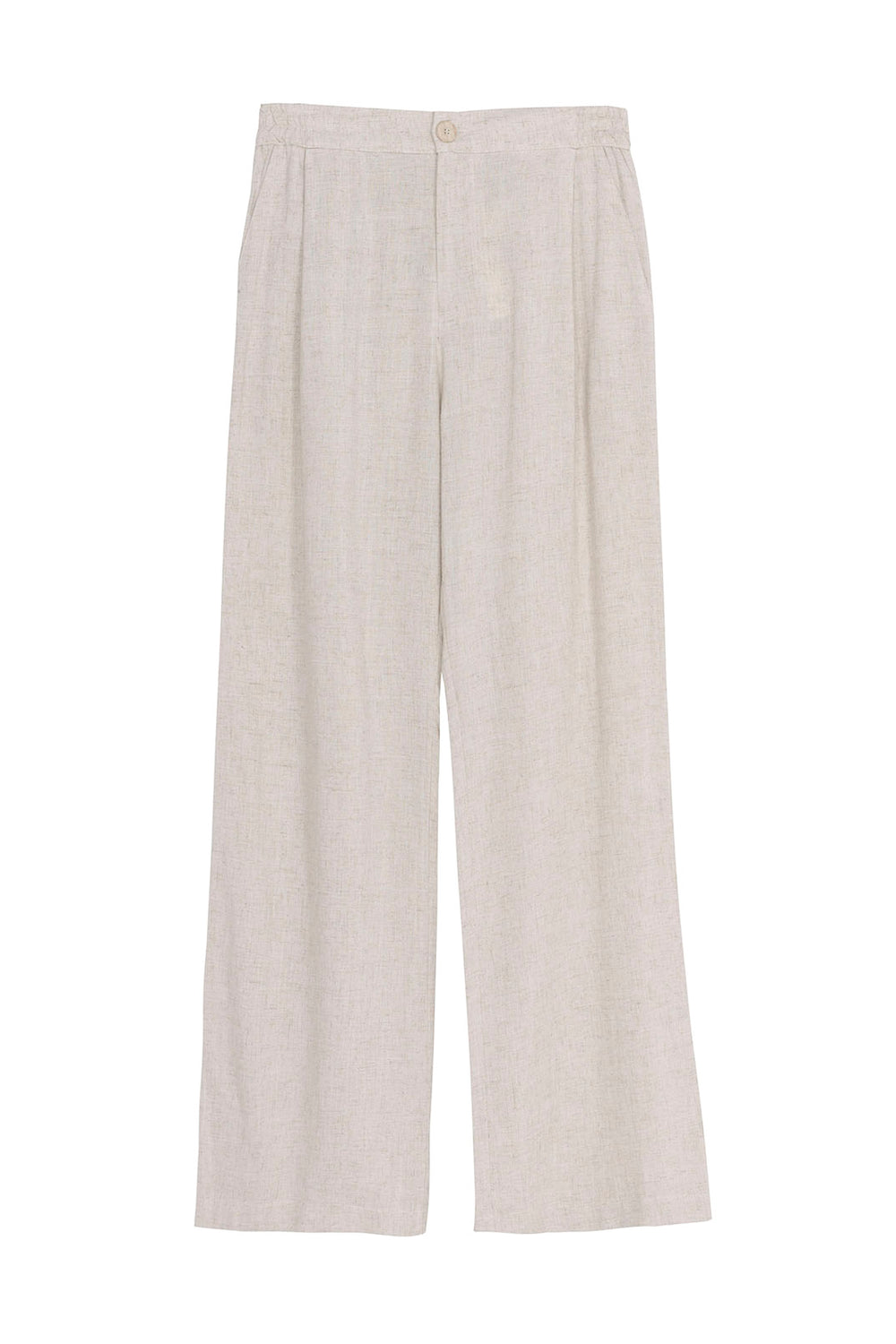 Pantalón de mujer recto con bolsillos laterales y goma en la cintura solo en espalda y cierre de botón y cremallera.
