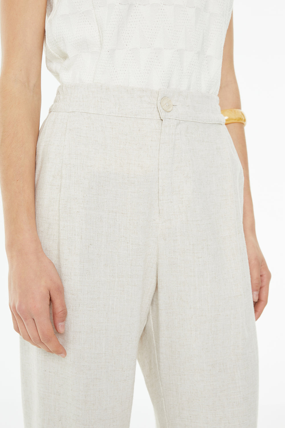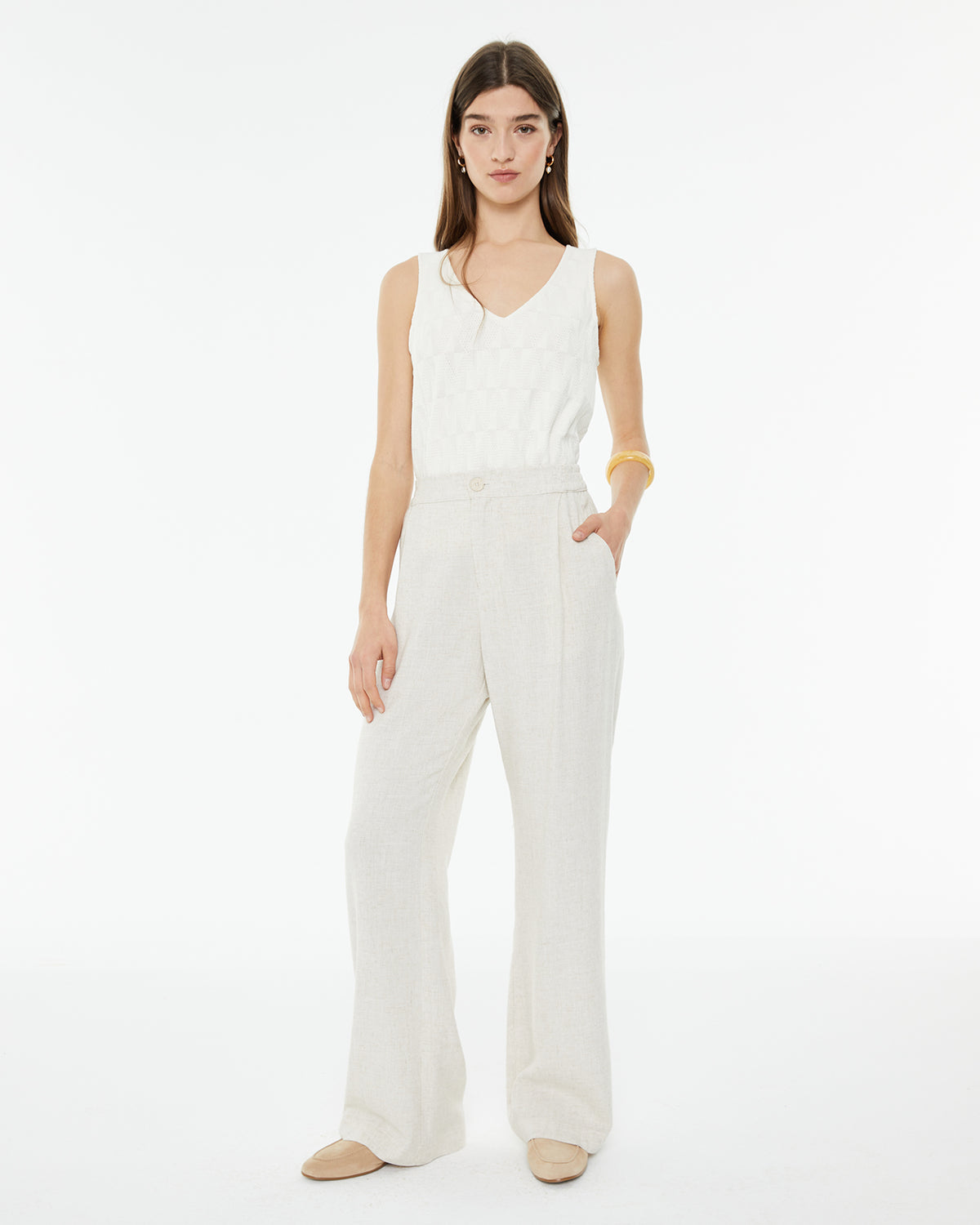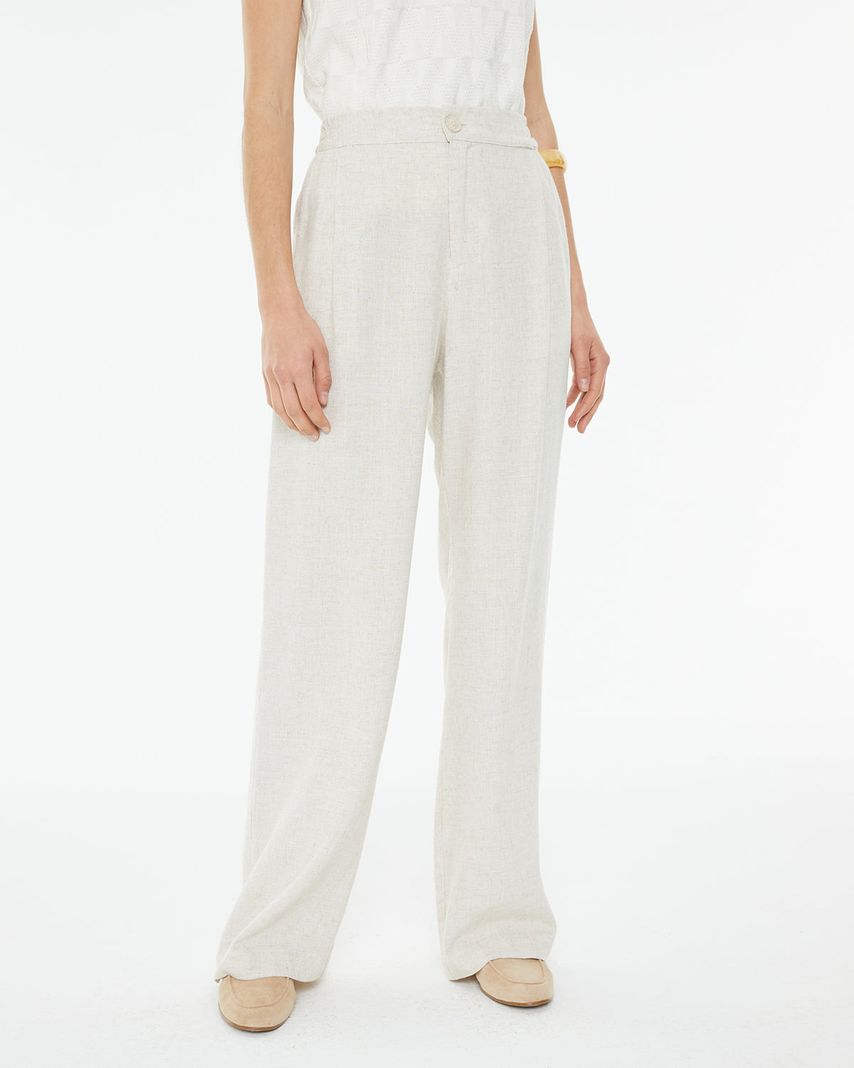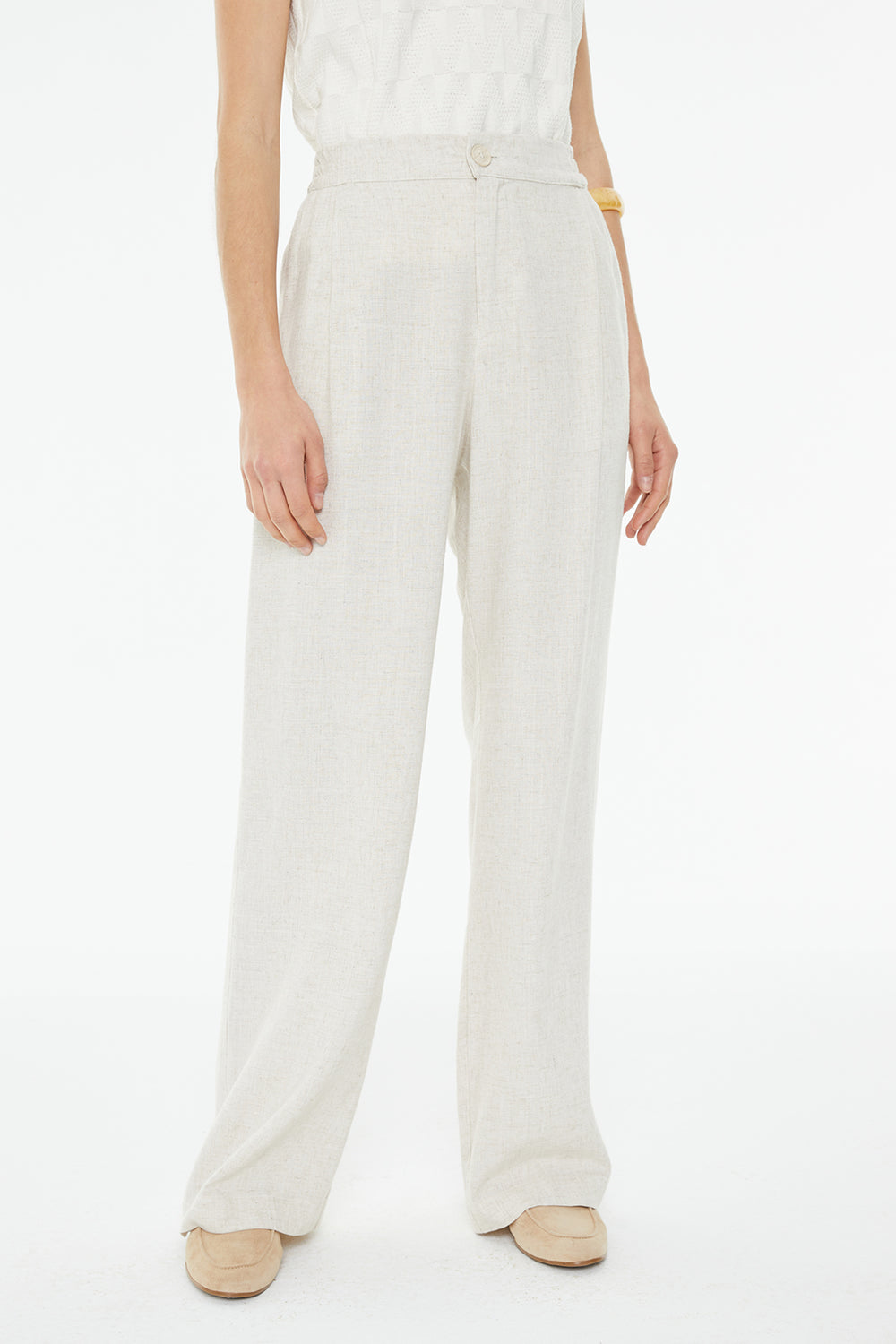 Pantalón de mujer recto con bolsillos laterales y goma en la cintura solo en espalda y cierre de botón y cremallera.
