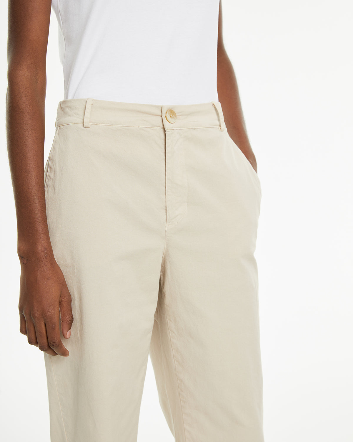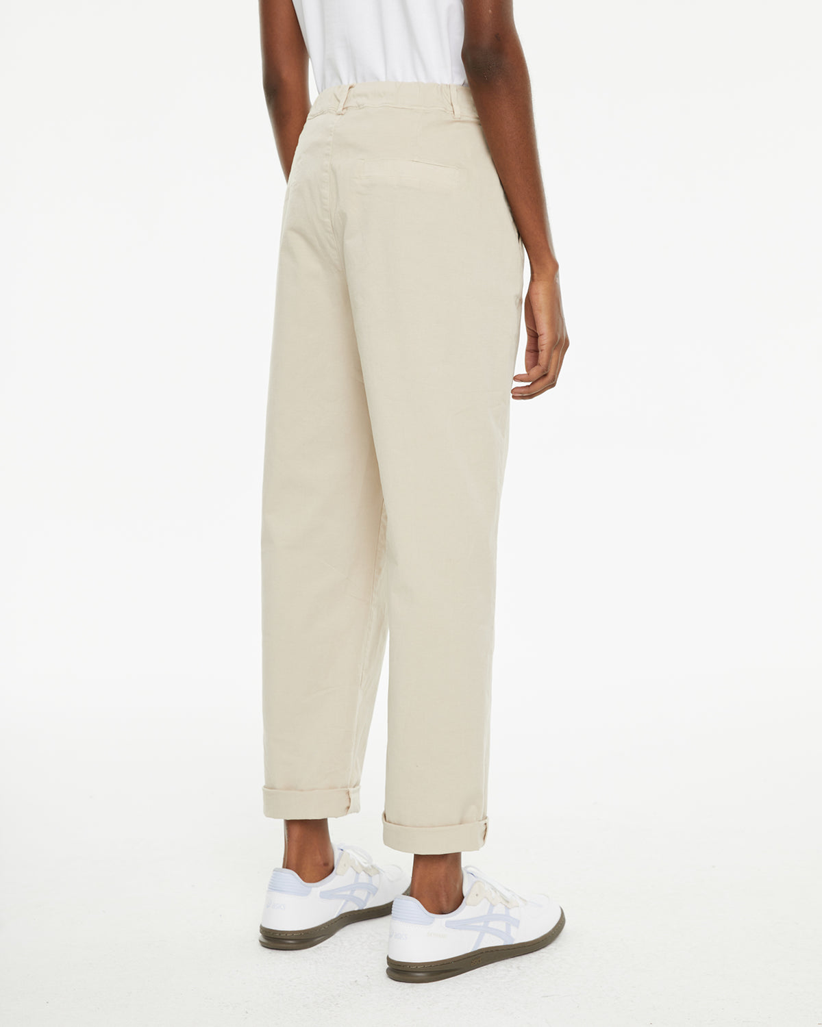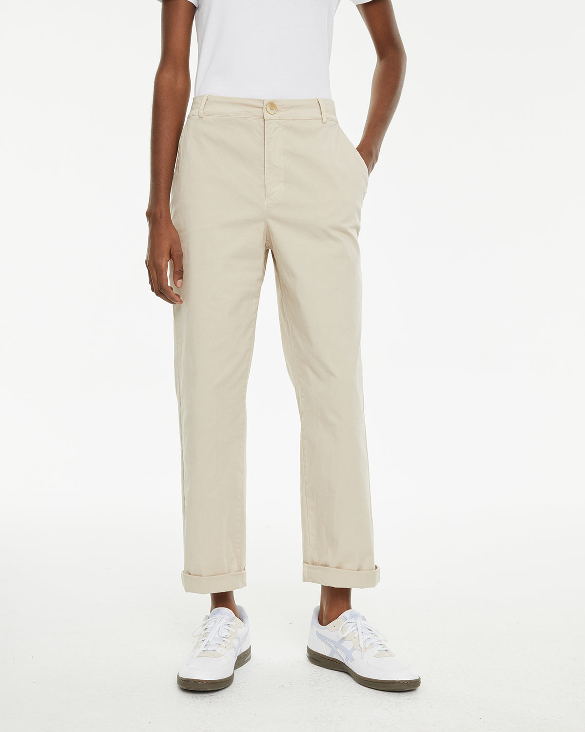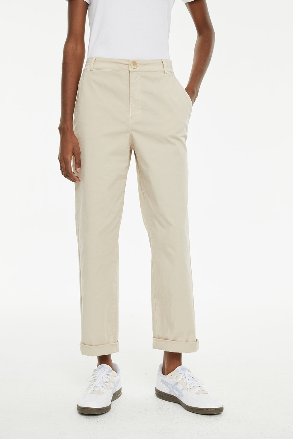 Pantalón de mujer de tiro medio con pinzas delanteras y bolsillos laterales. Cierre delantero con cremallera y botón. Prenda sostenible.