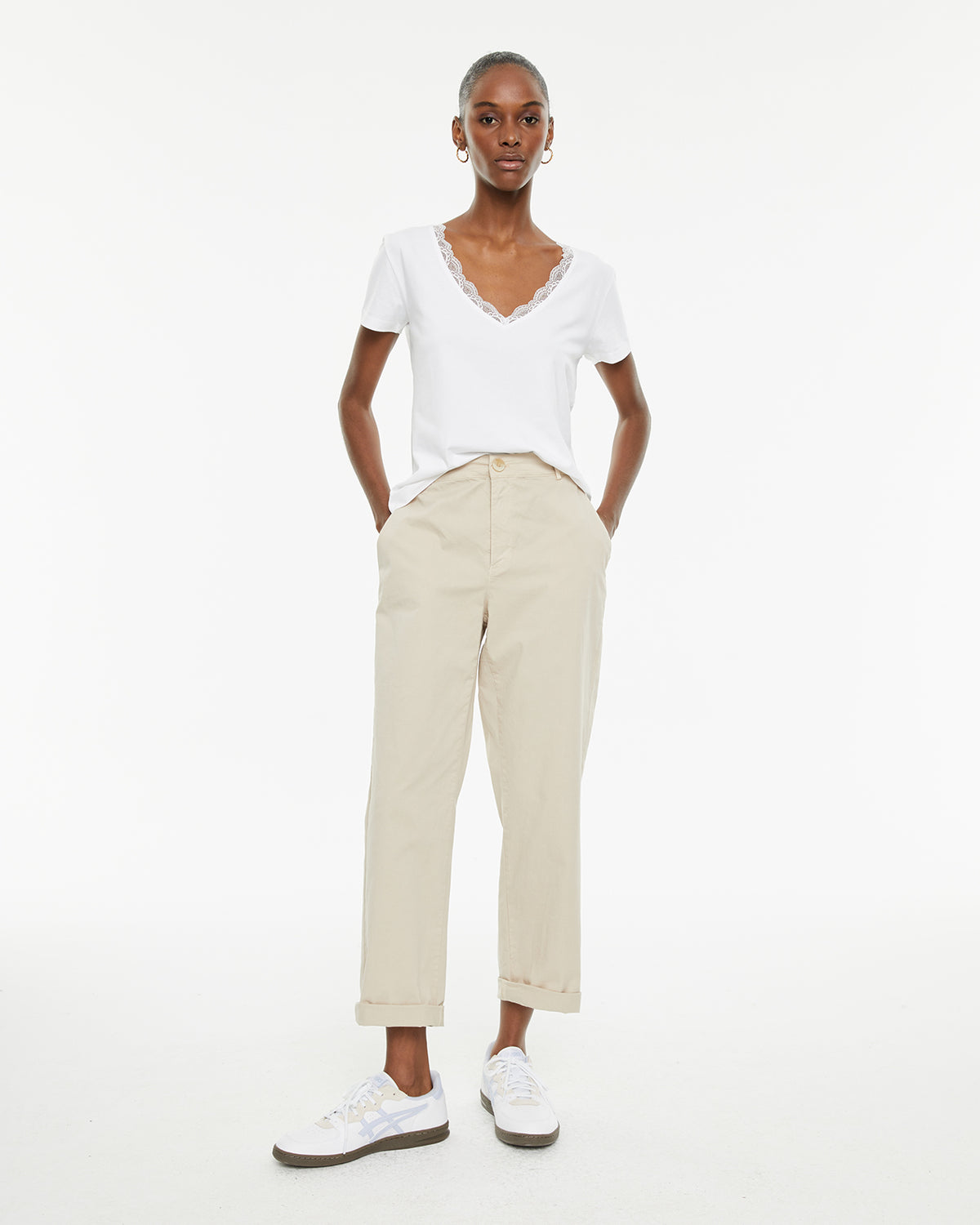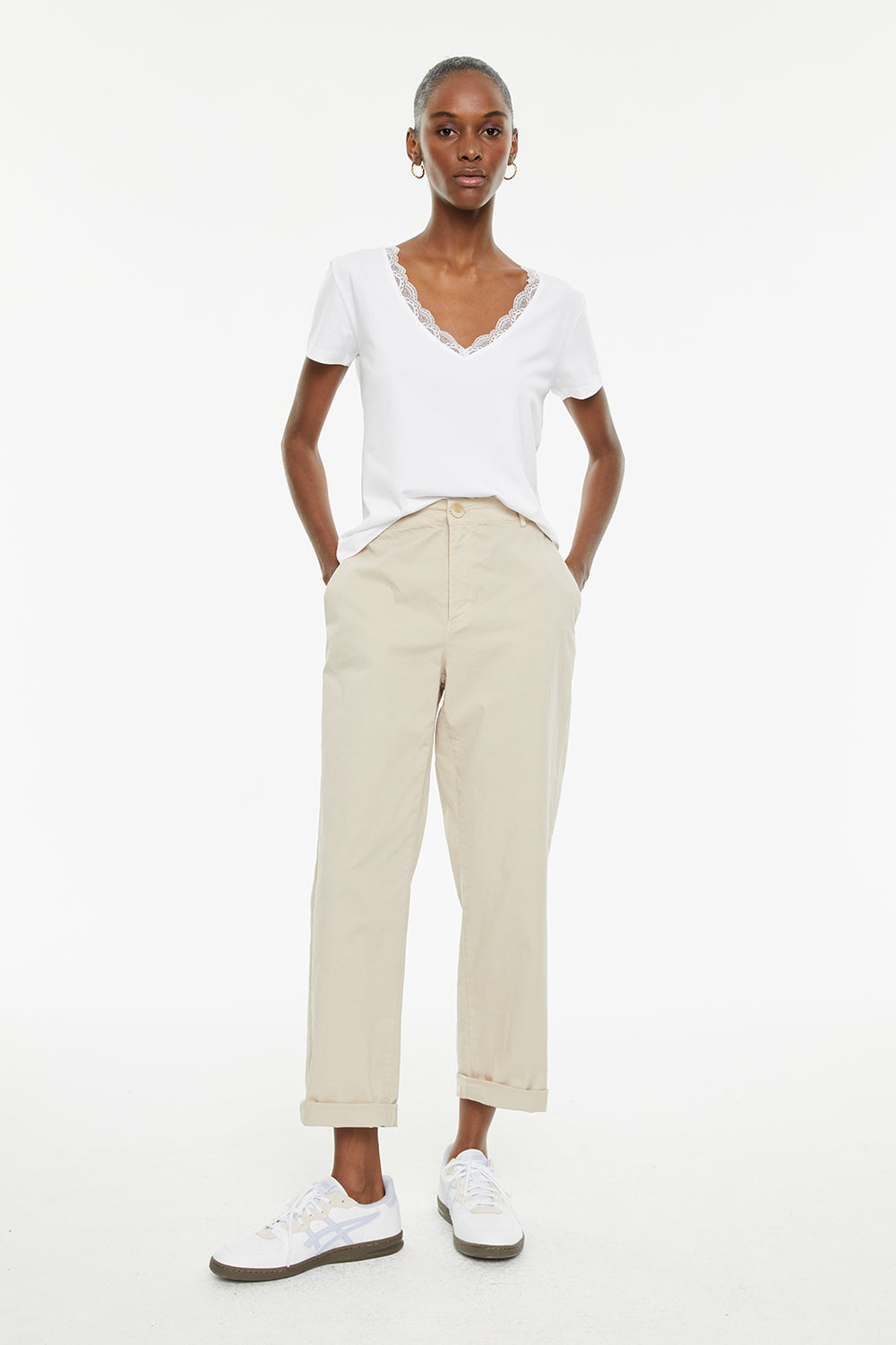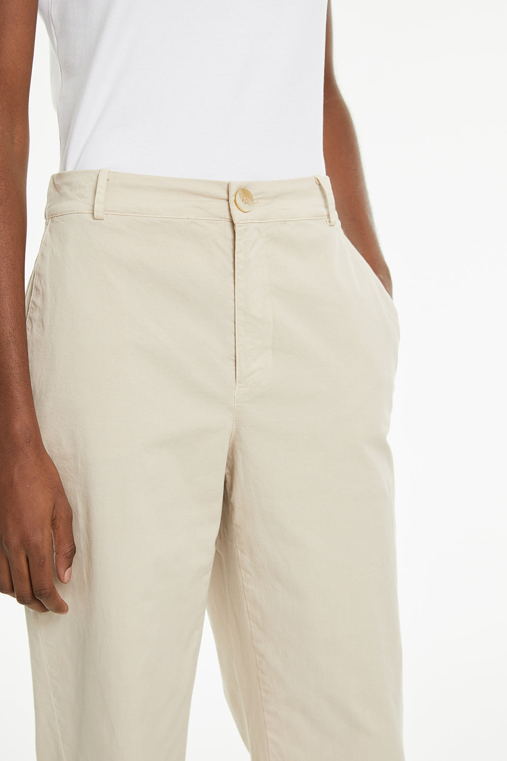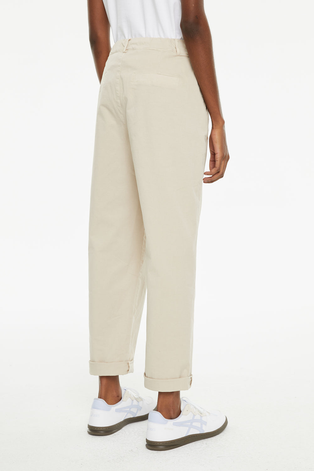 Pantalón de mujer de tiro medio con pinzas delanteras y bolsillos laterales. Cierre delantero con cremallera y botón. Prenda sostenible.