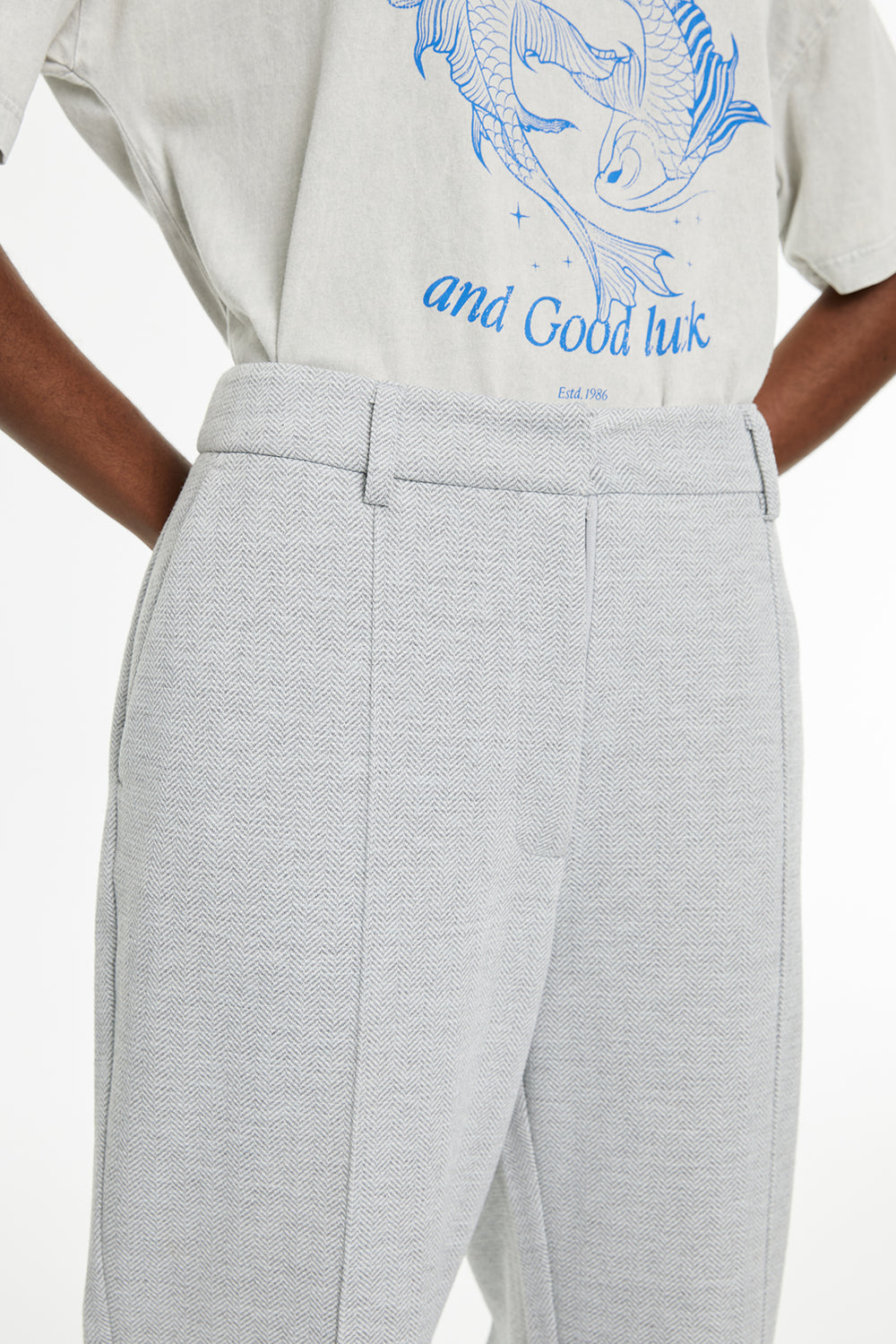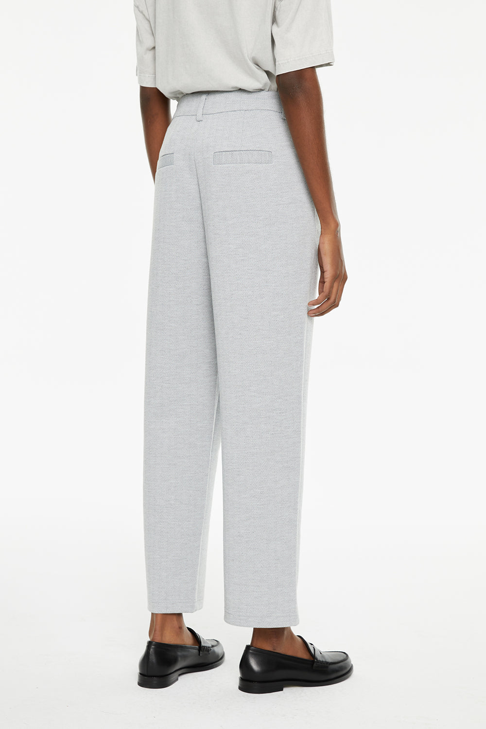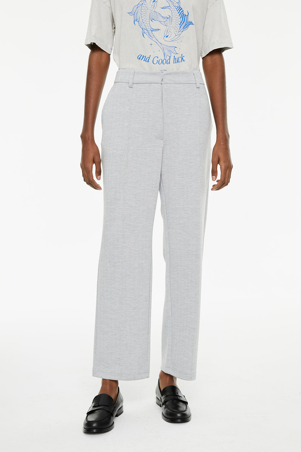 Pantalón de mujer en tejido de jacquard, confort con cierre frontal con cremallera y cierre interior, tiro medio y Bolsillos laterales.