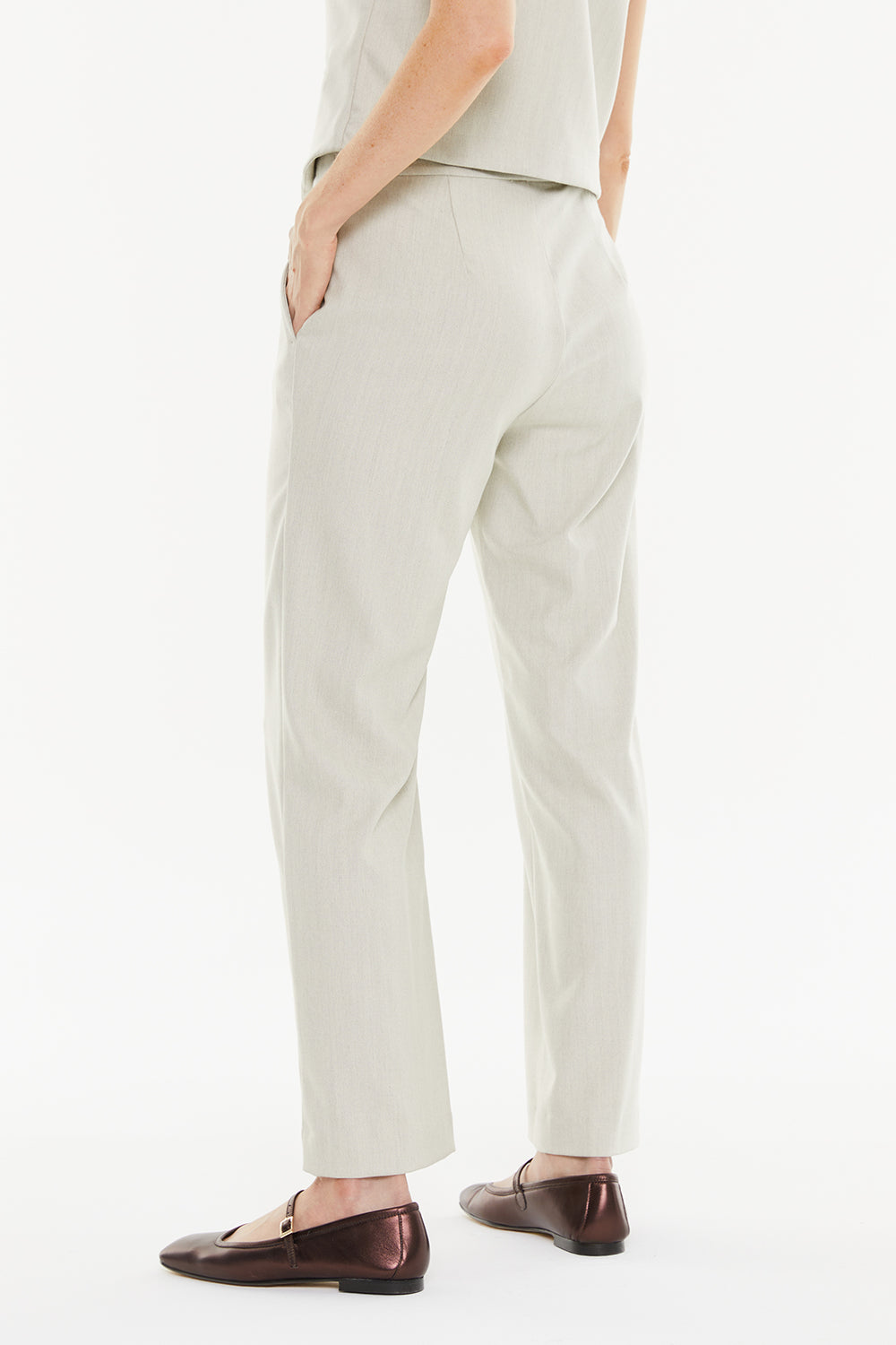 Pantalón tipo flare de mujer, con pinzas en el delantero, bolsillos laterales y cierre con botón.