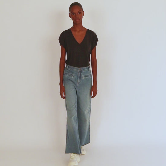 Pantalón vaquero de mujer wide leg, tiro medio, Bolsillos delanteros tipo vivo. Cierre con cremallera y botón metálico