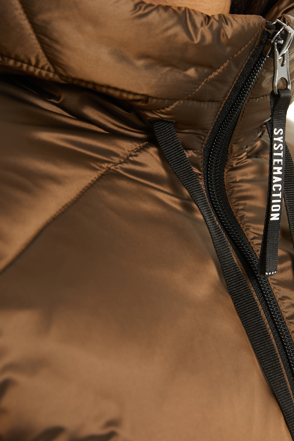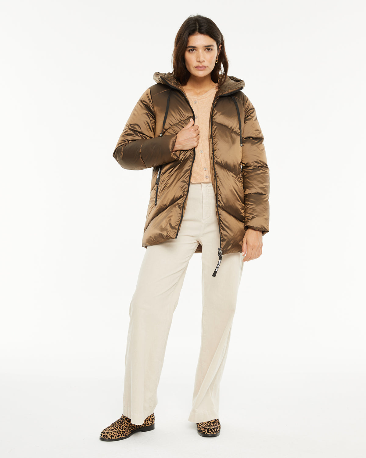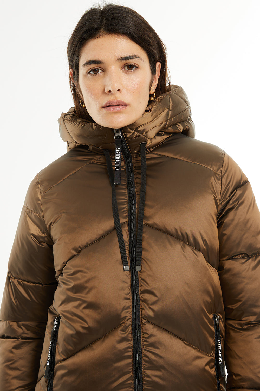 Plumón de mujer con capucha y cordón. Cierre con cremallera. Efecto metalizado.