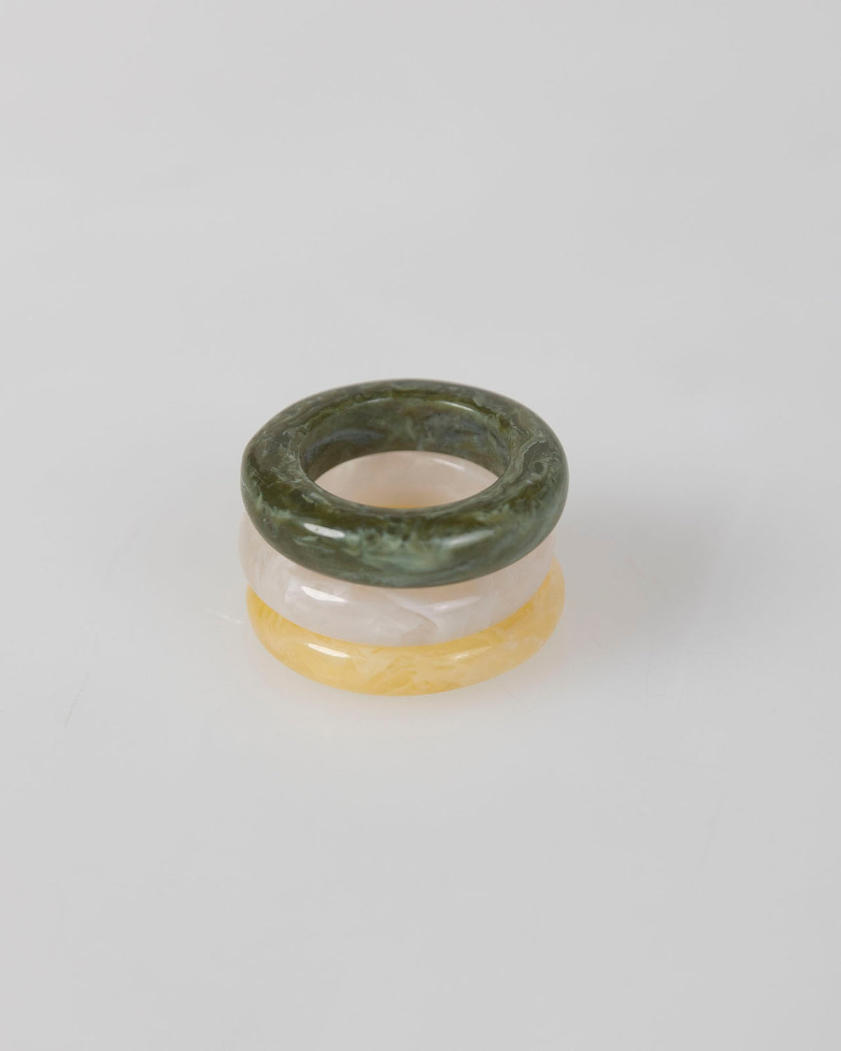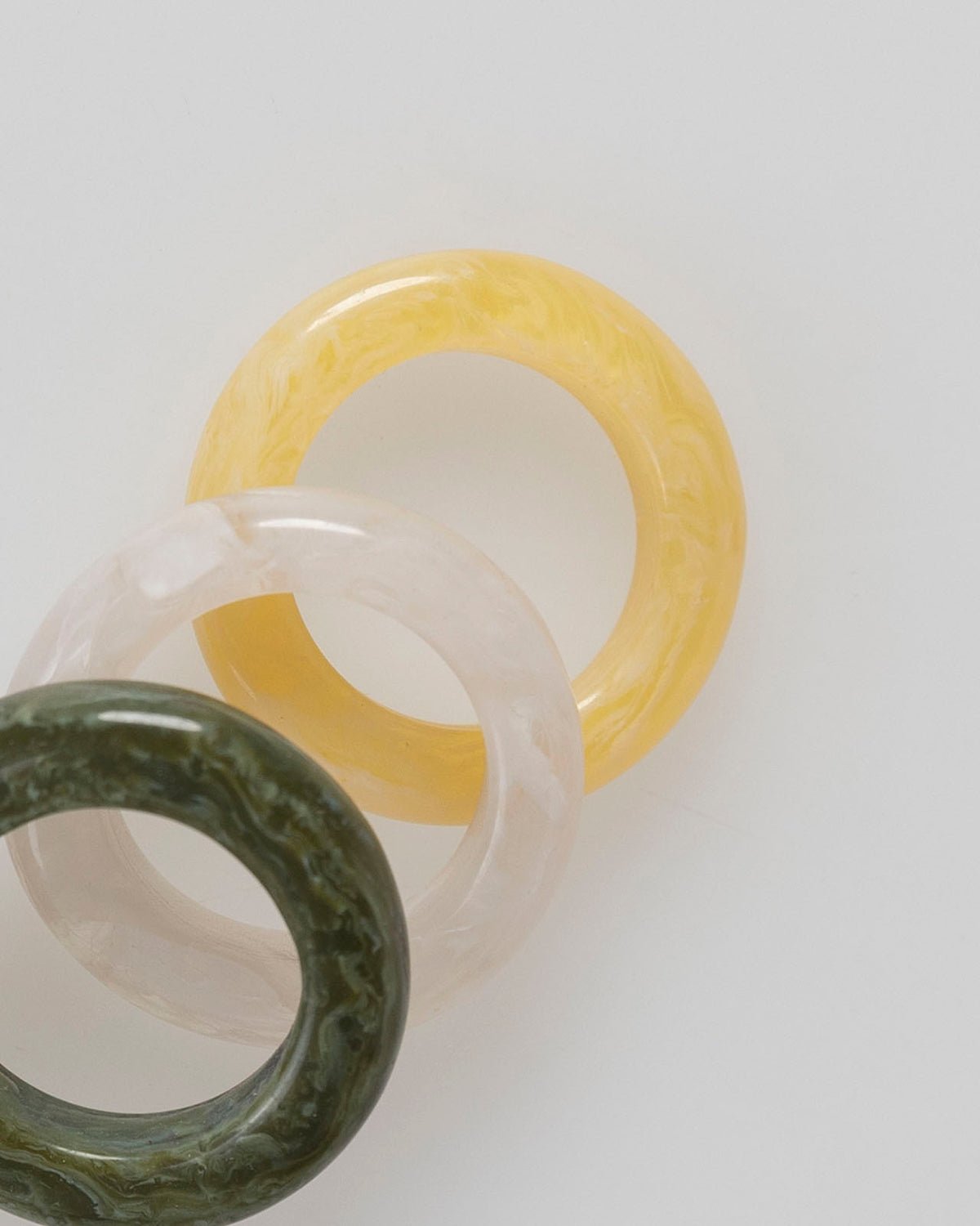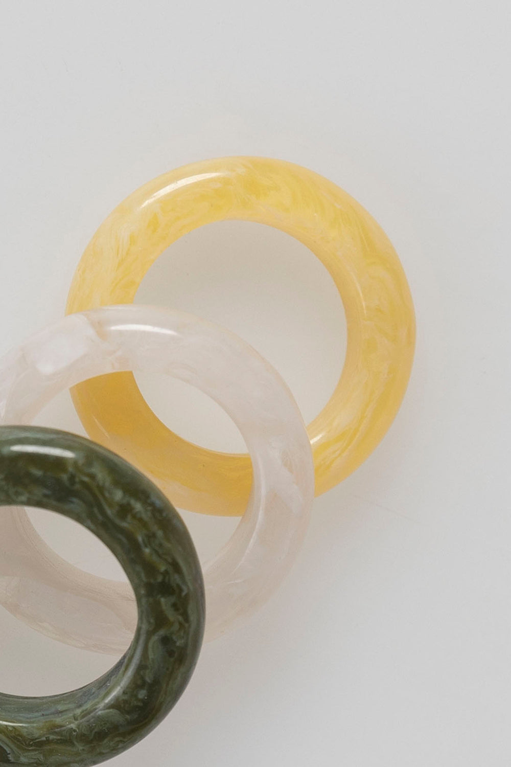 Set tres anillos rígidos en color verde, amarillo y crudo.