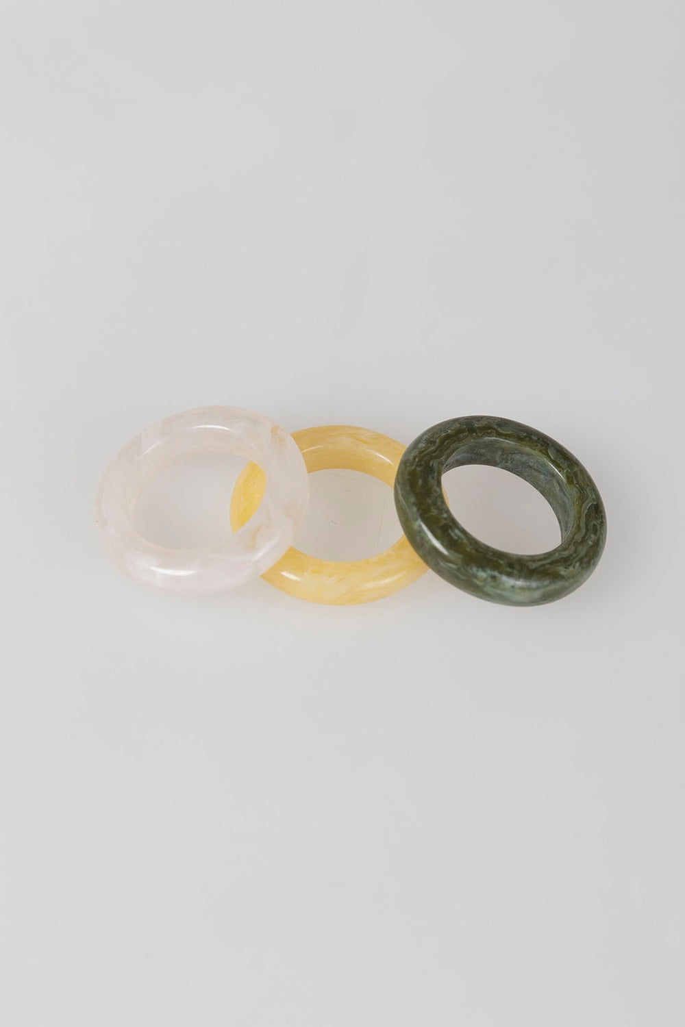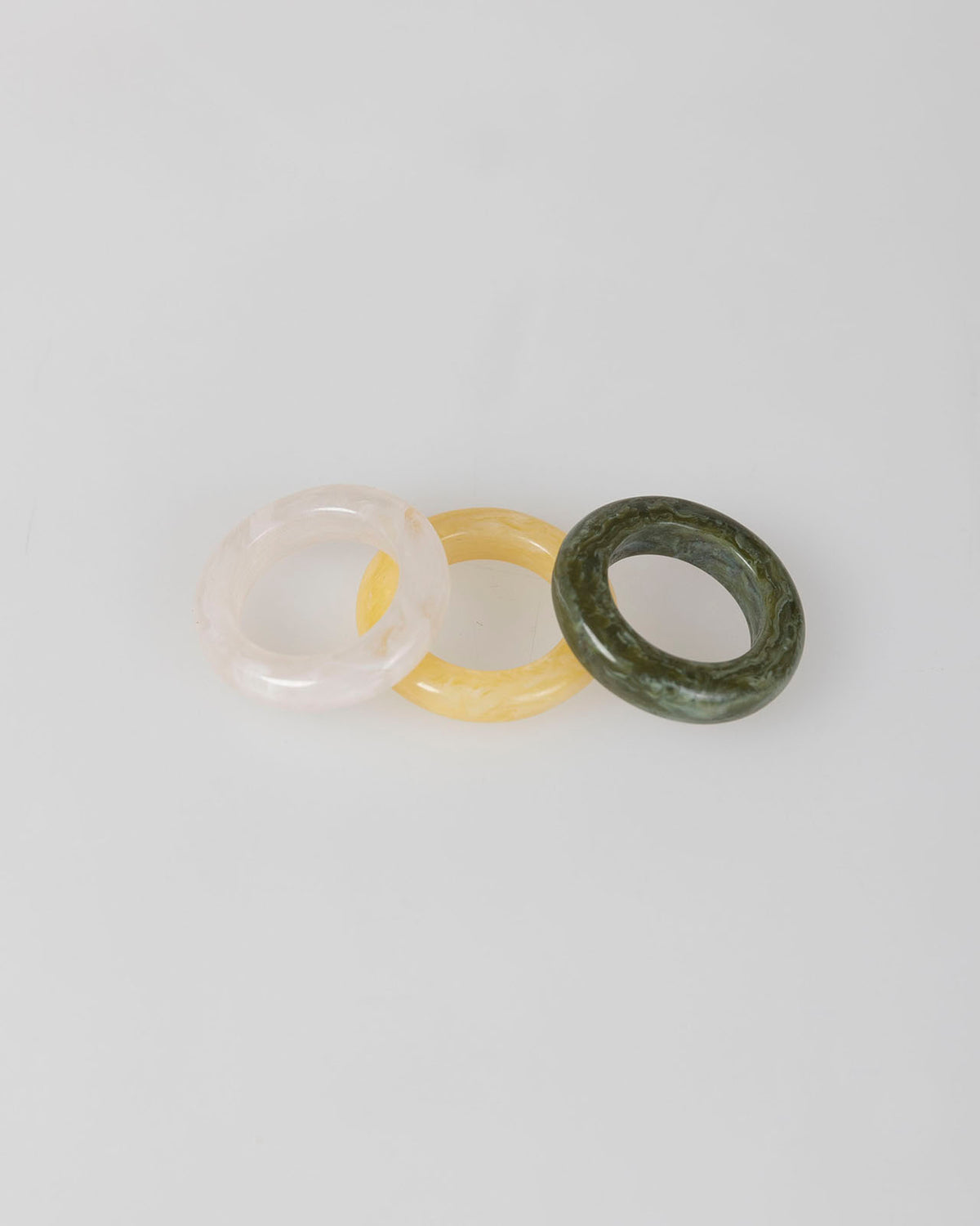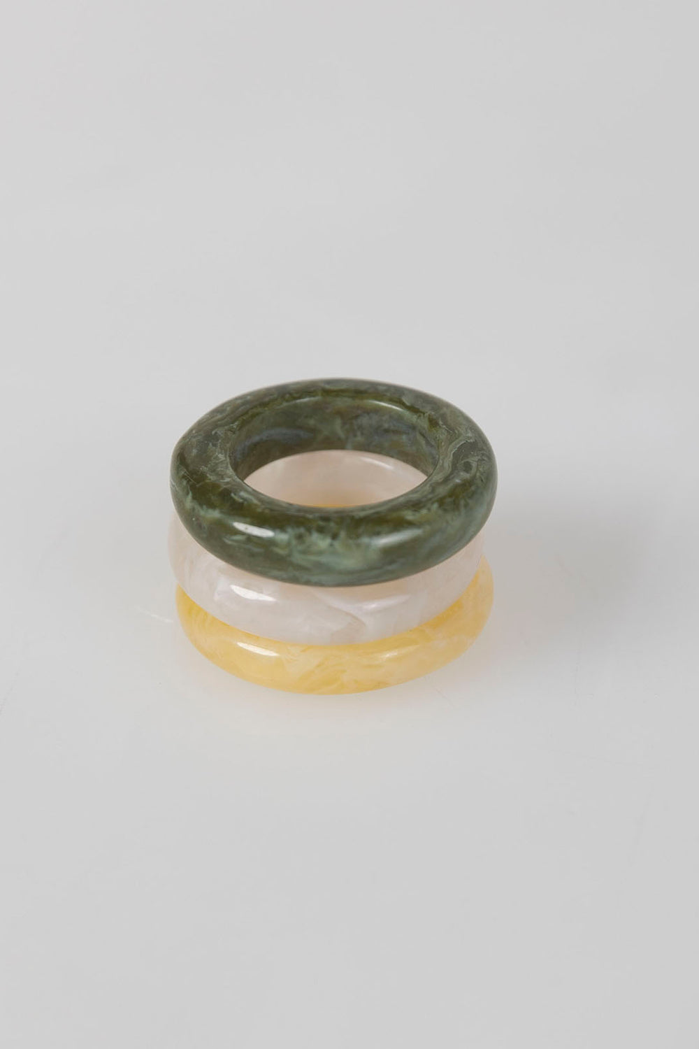 Set tres anillos rígidos en color verde, amarillo y crudo.