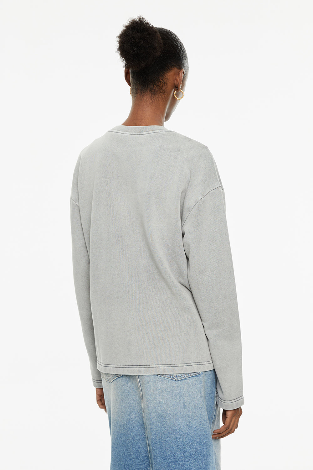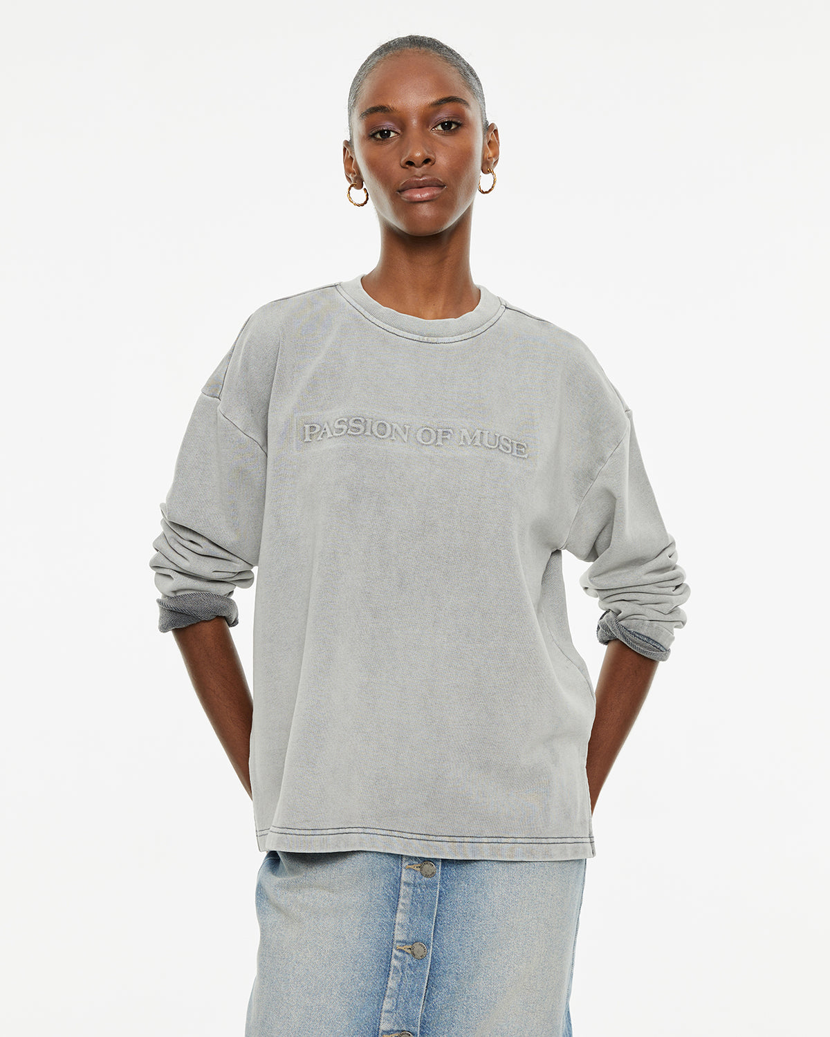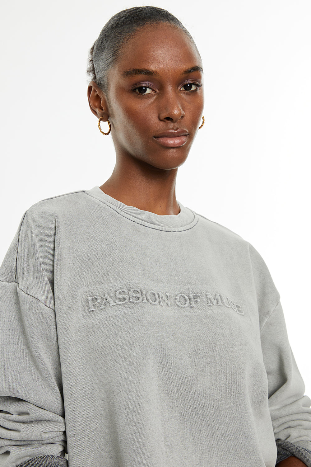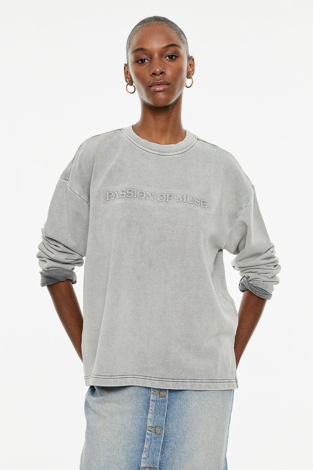 Sudadera de mujer regular fit de manga larga abullonada y cuello redondo. Tinte especial en color gris claro efecto desgastado y detalle de frase en relieve.