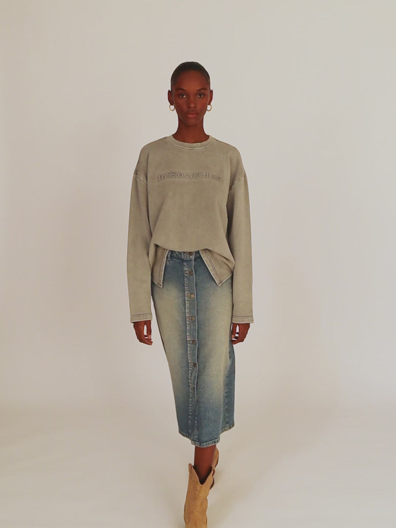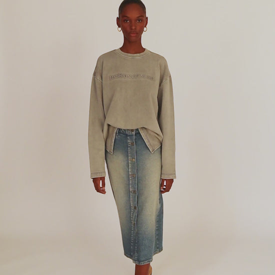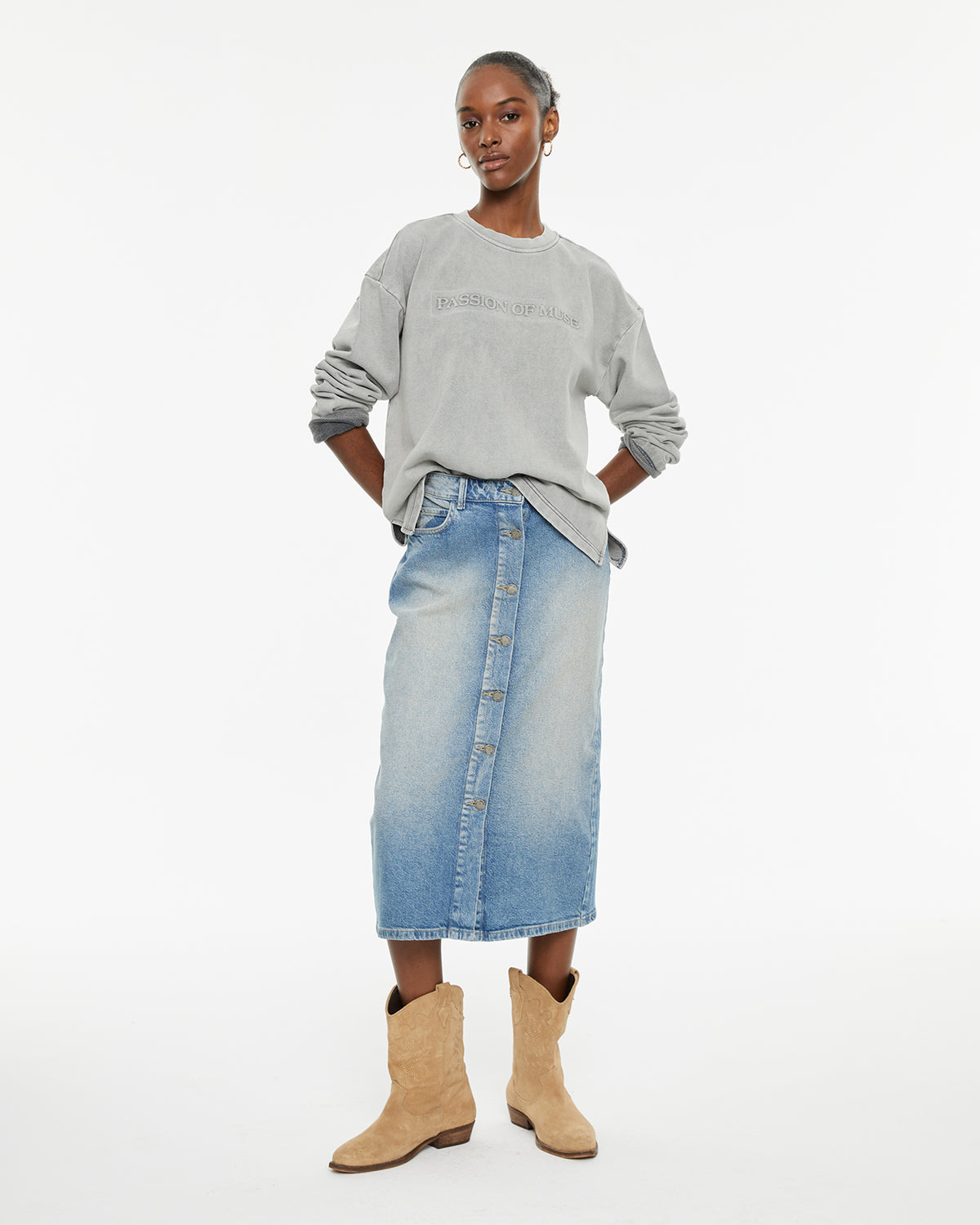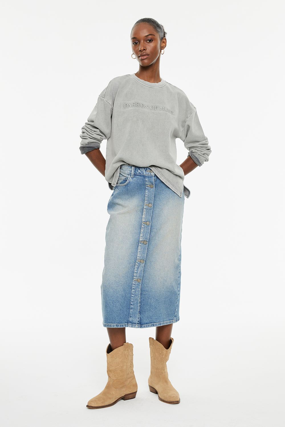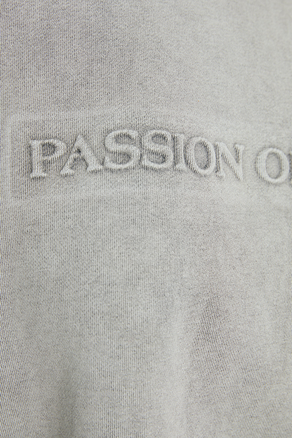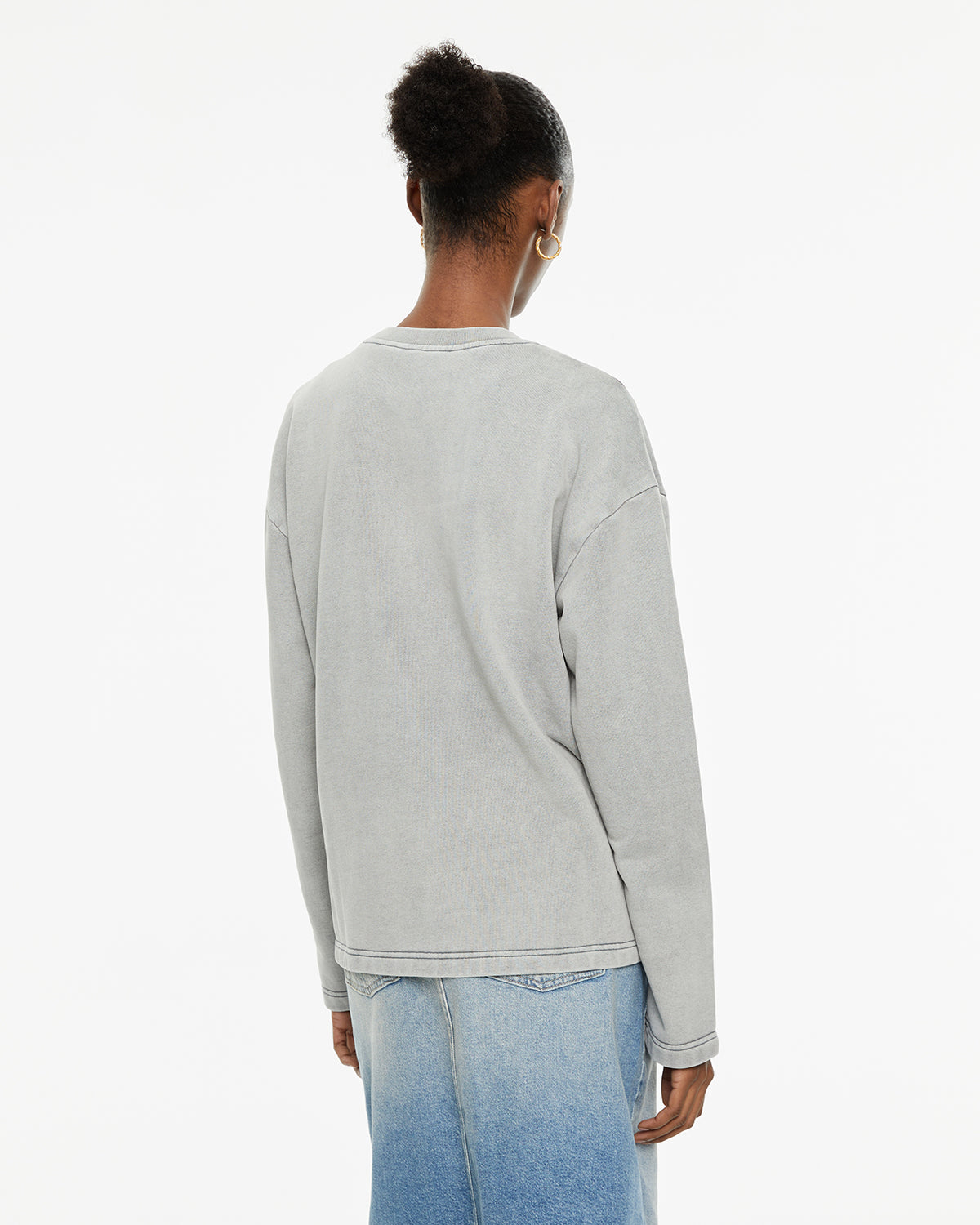 Sudadera de mujer regular fit de manga larga abullonada y cuello redondo. Tinte especial en color gris claro efecto desgastado y detalle de frase en relieve.