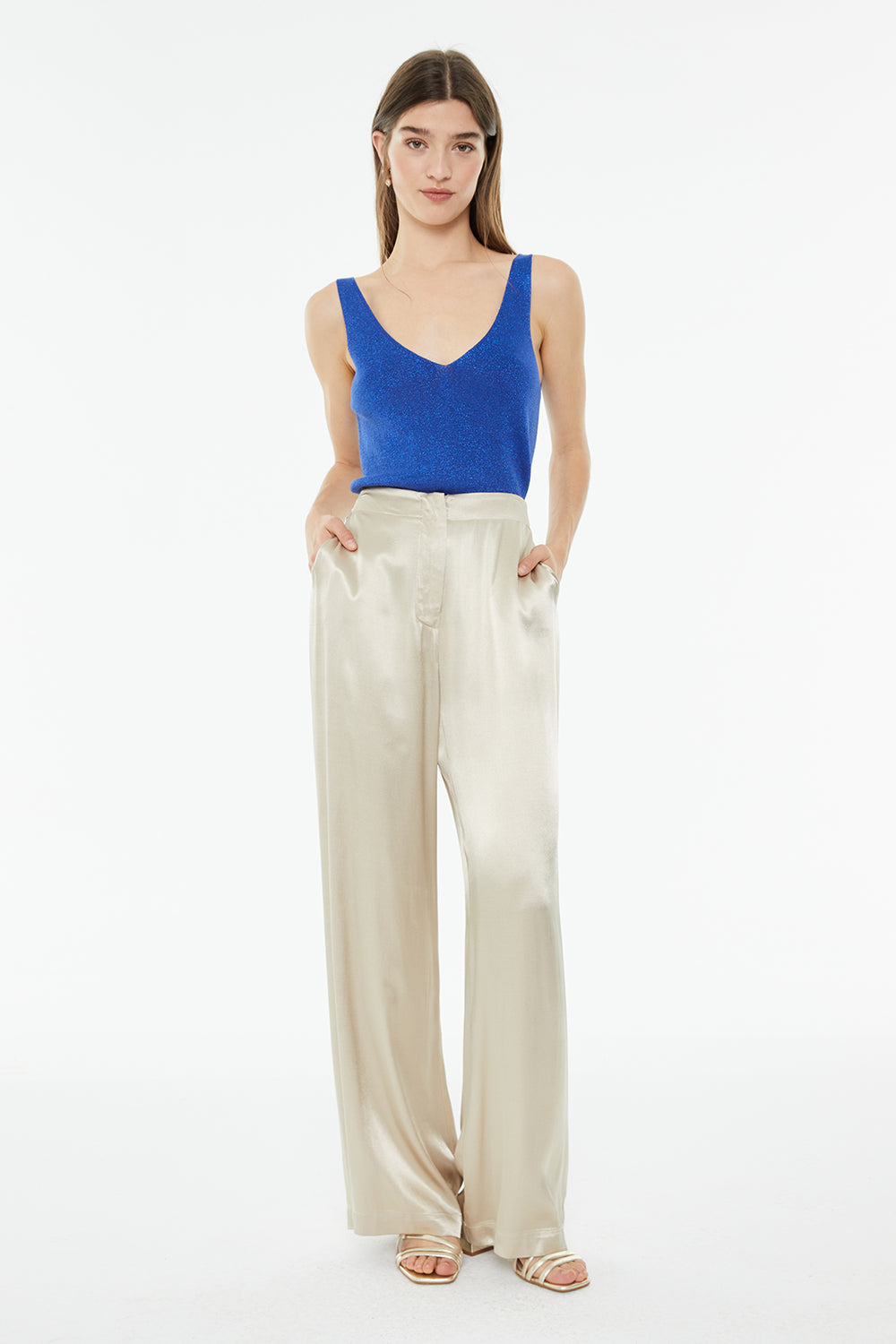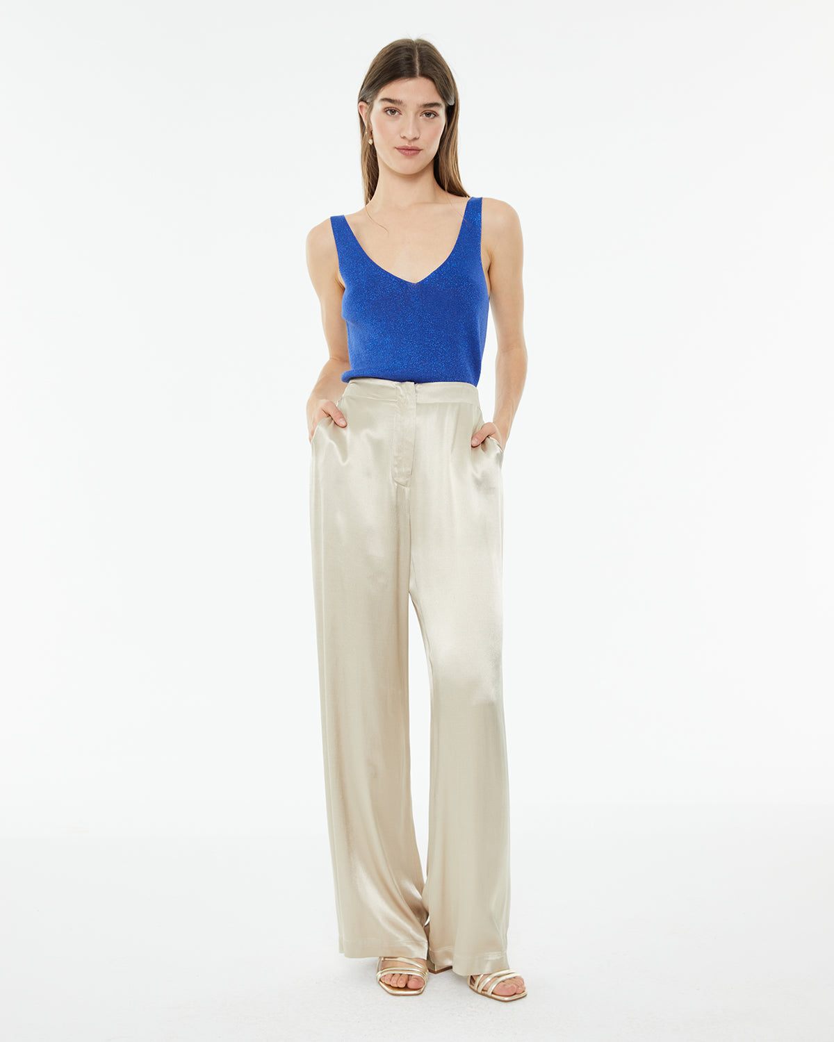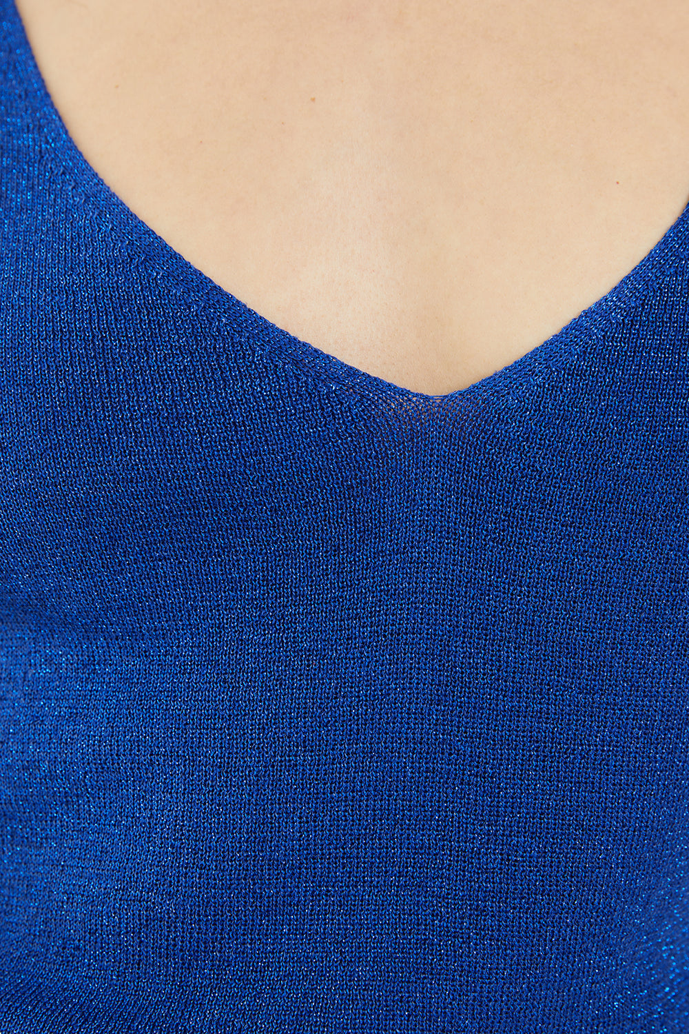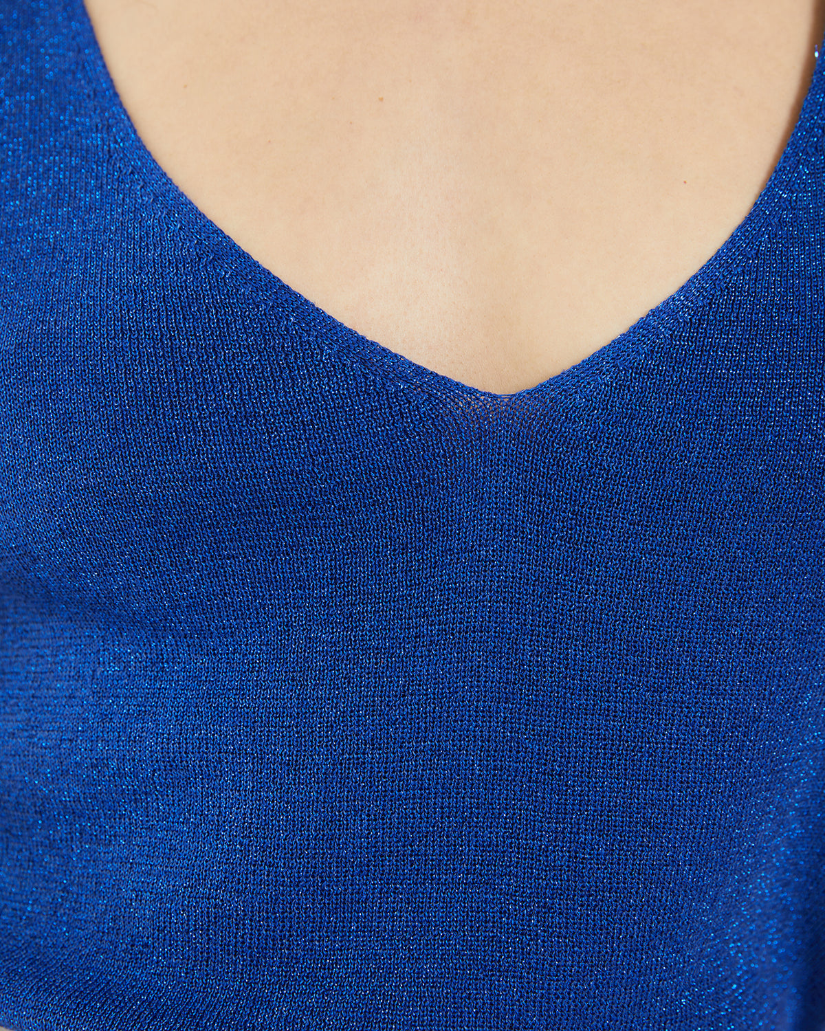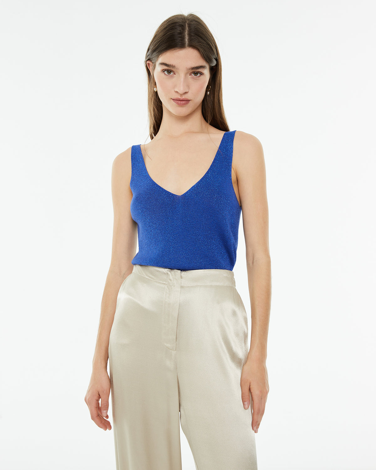 Top de mujer ajustado con brillo, de tirantes y con cuello pico.
