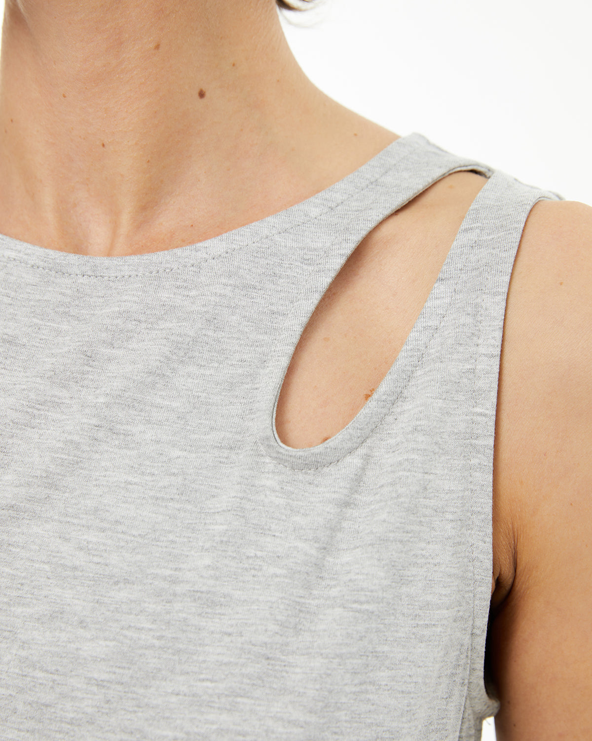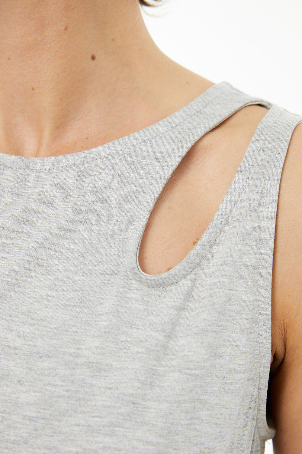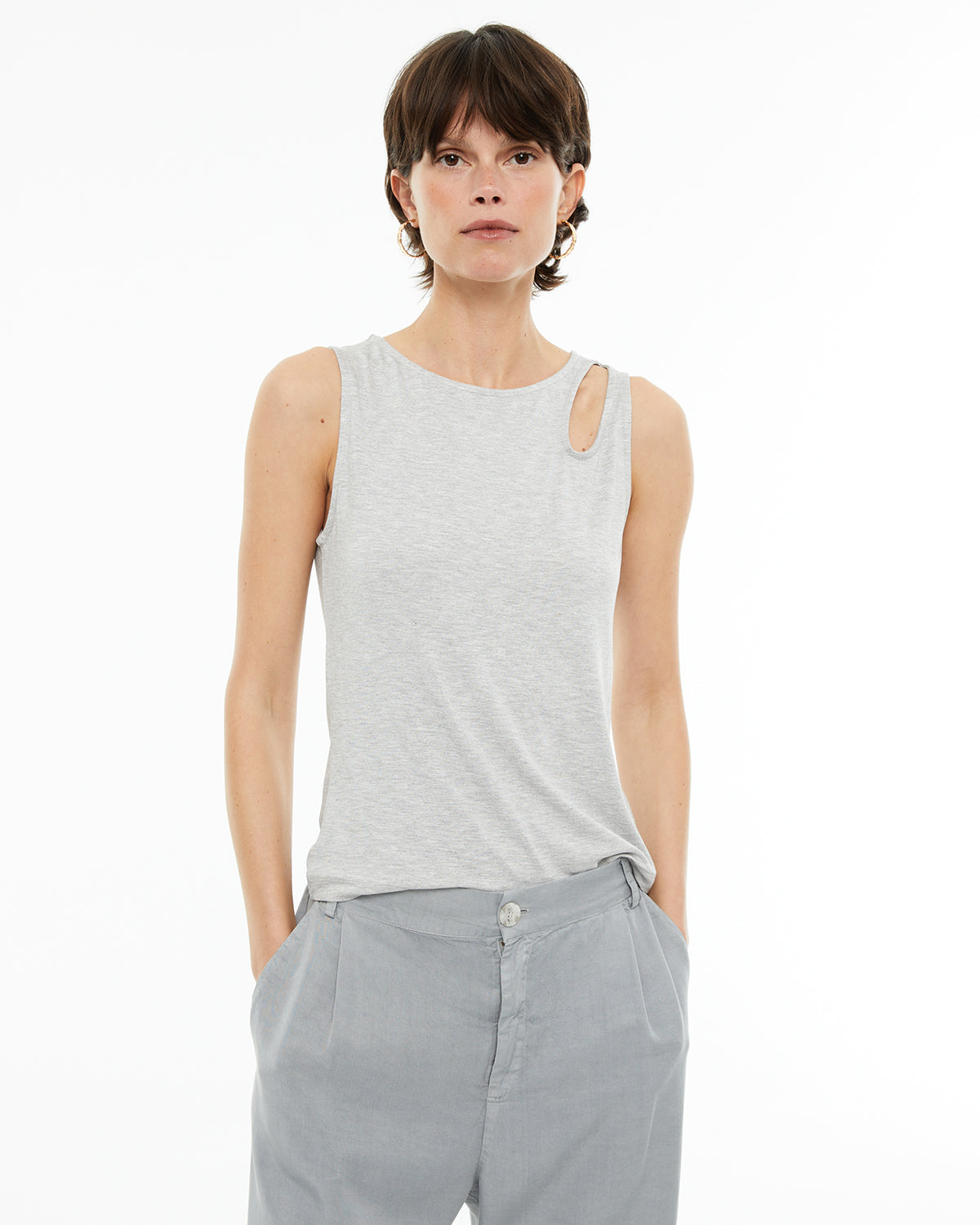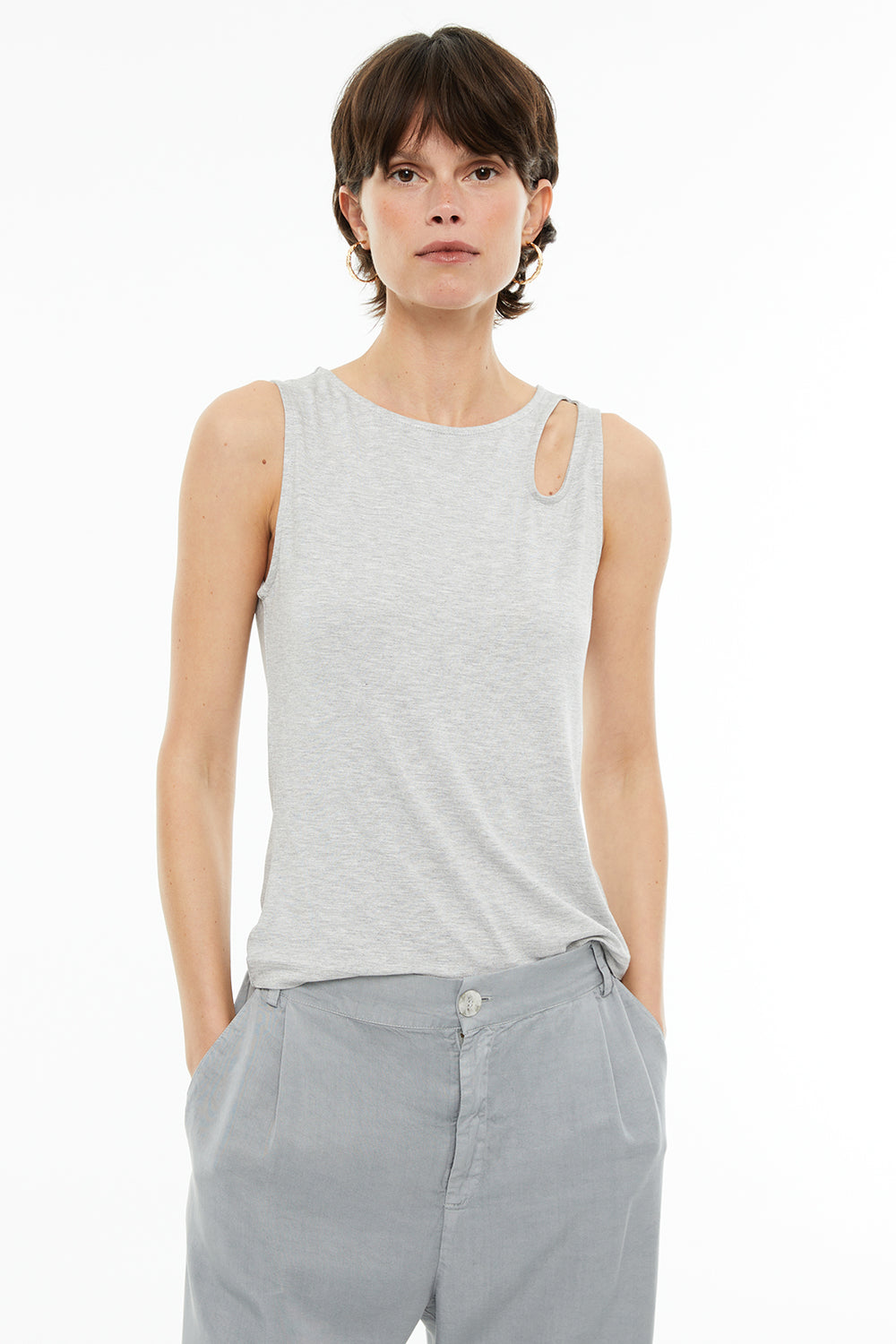 Top de mujer ajustado, sin mangas con cut-out en el hombro y con cuello redondo.