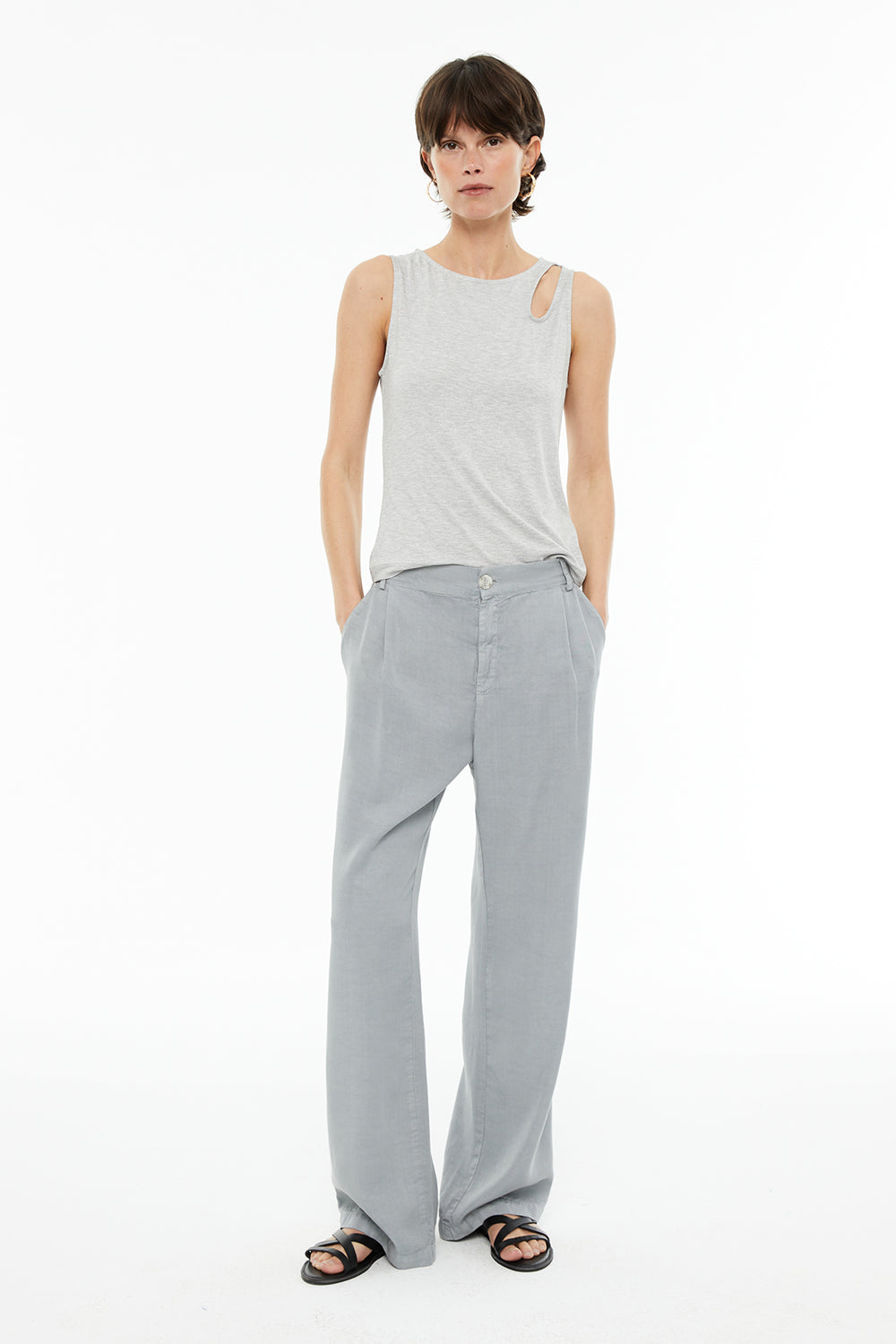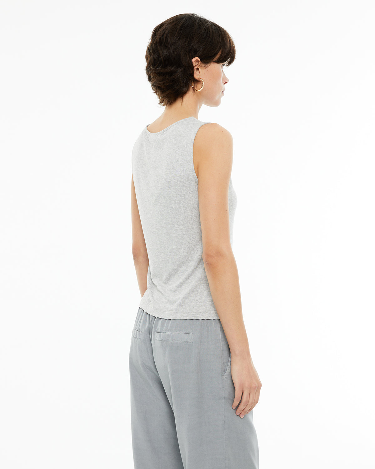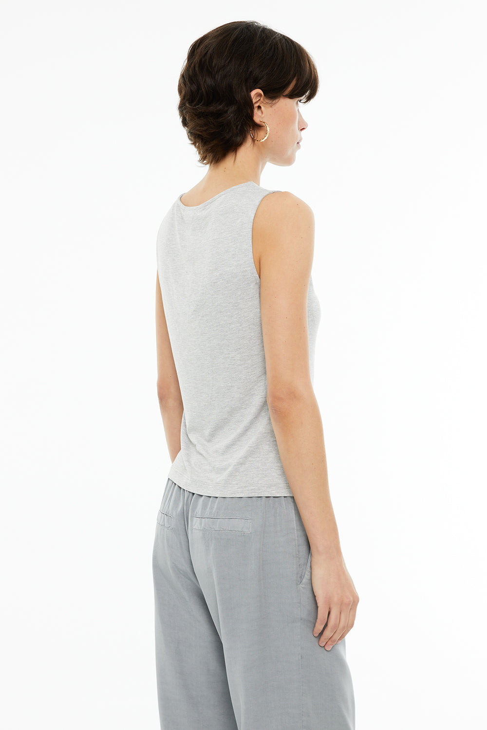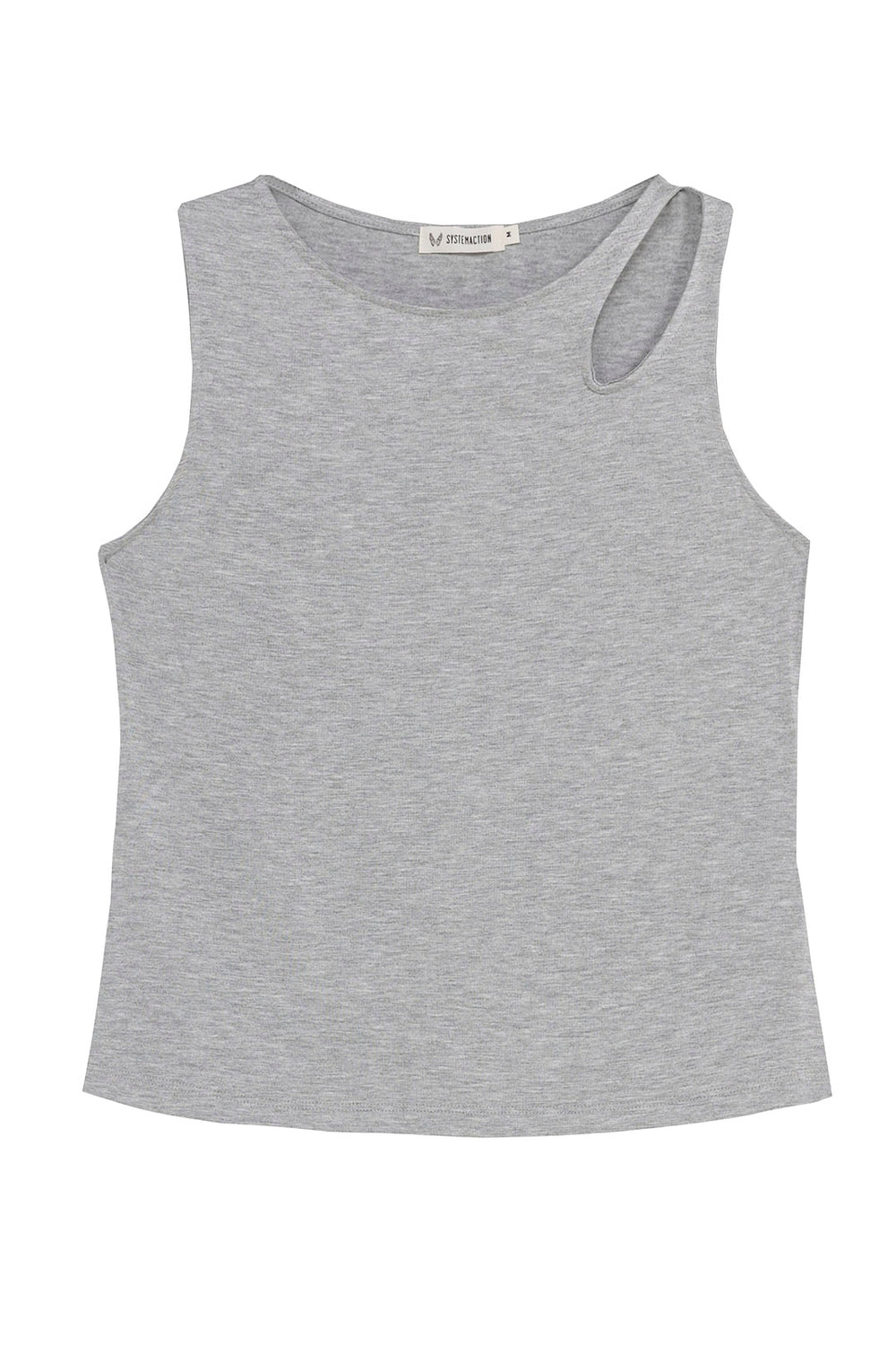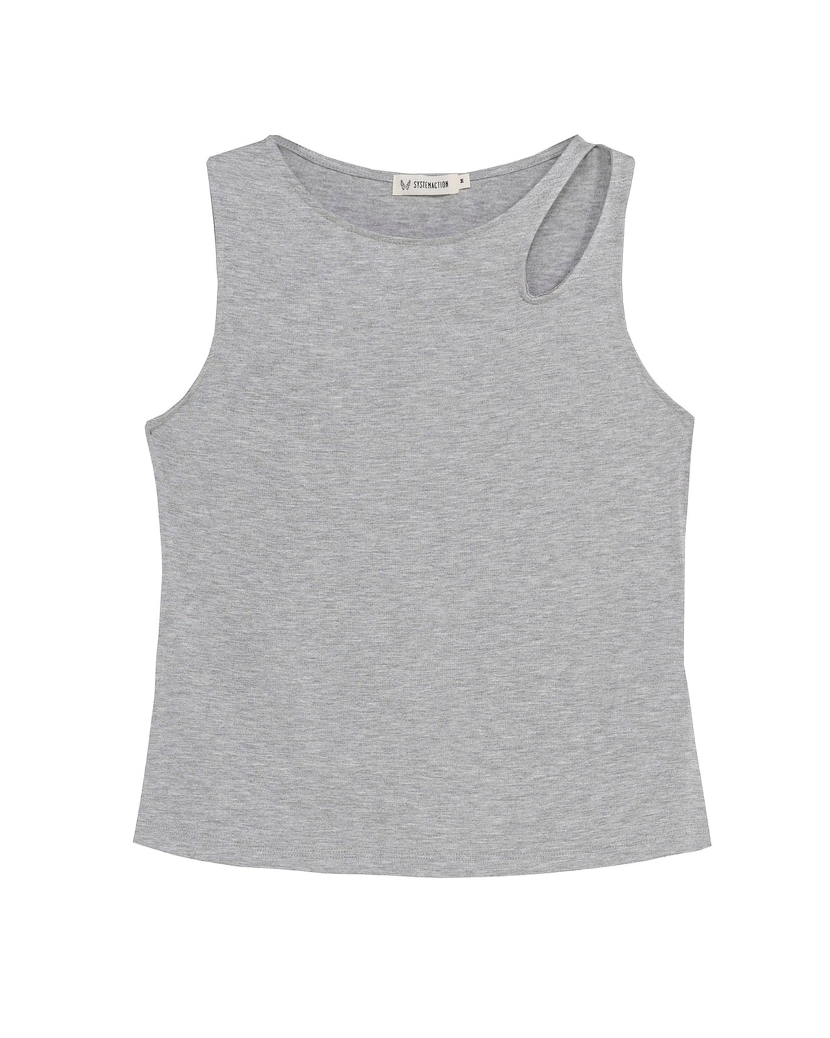 Top de mujer ajustado, sin mangas con cut-out en el hombro y con cuello redondo.
