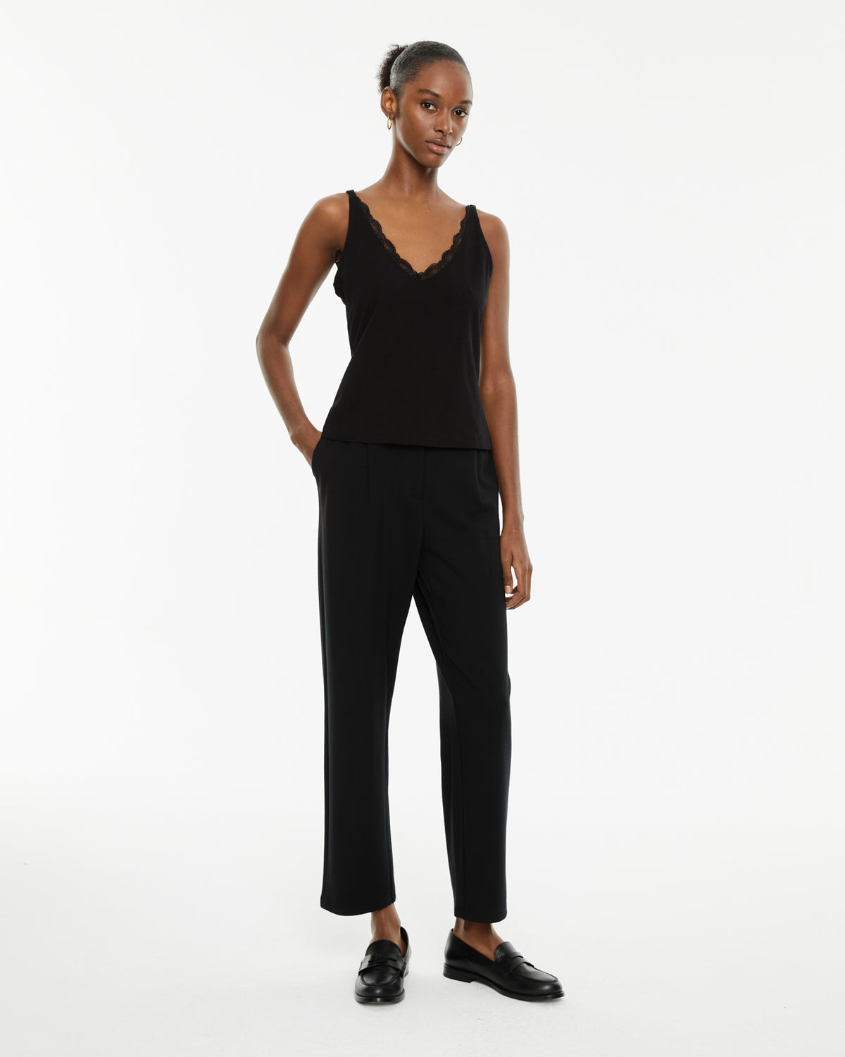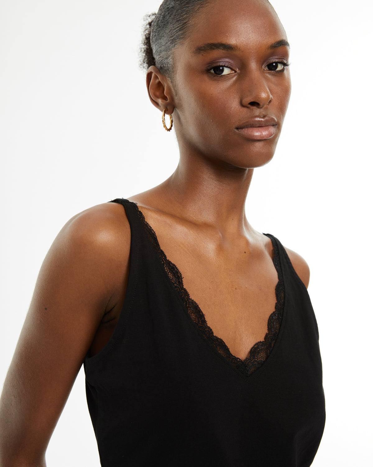 Top básico de mujer, ajustado, de tirantes, con escote pico y puntilla. Tejido algodón