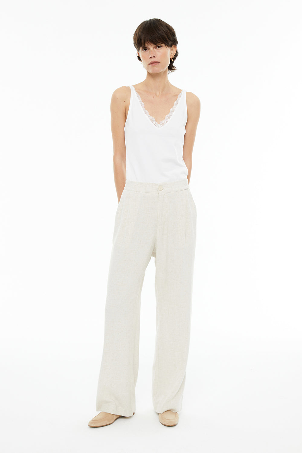 Top básico de mujer, ajustado, de tirantes, con escote pico y puntilla. Tejido algodón